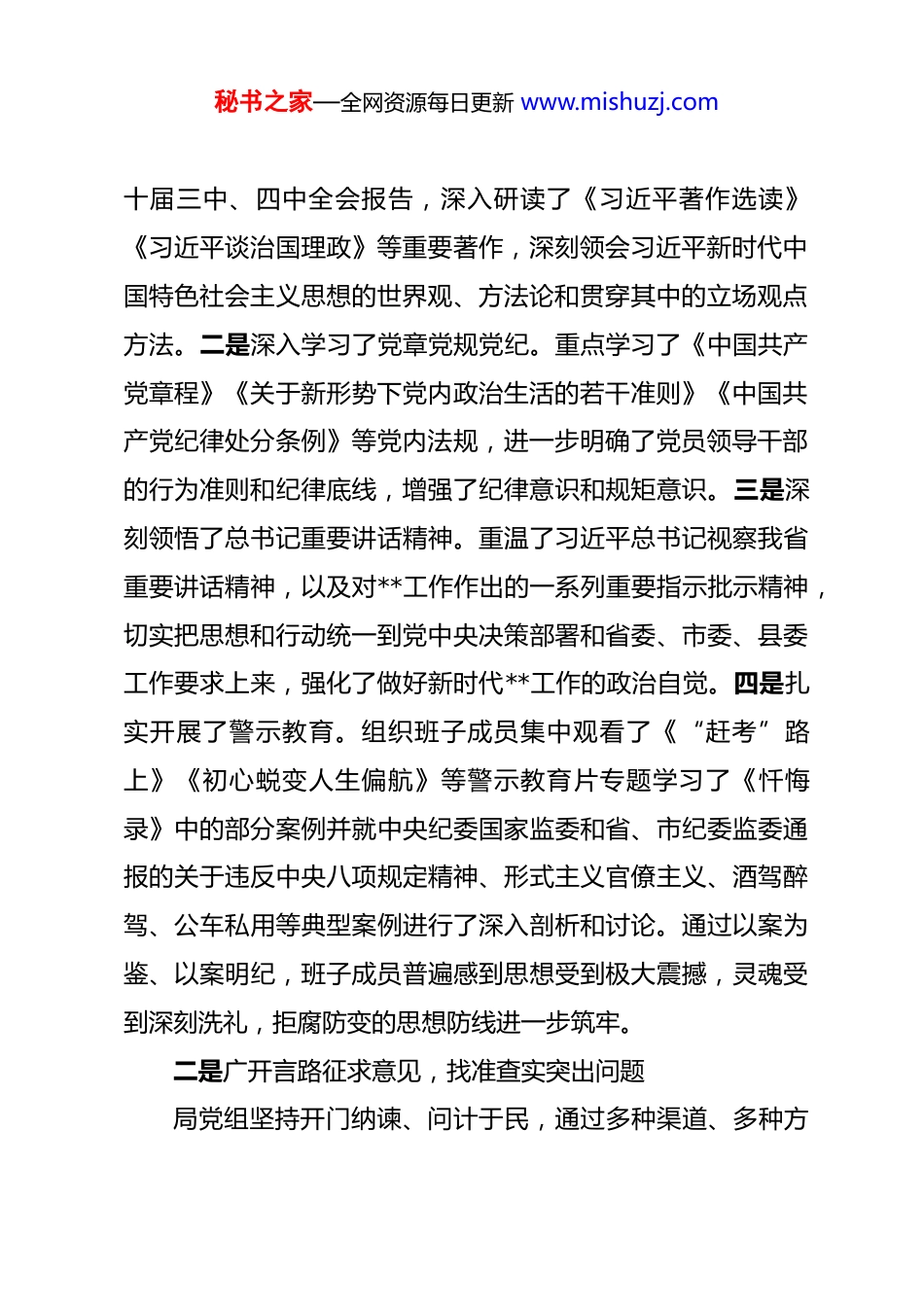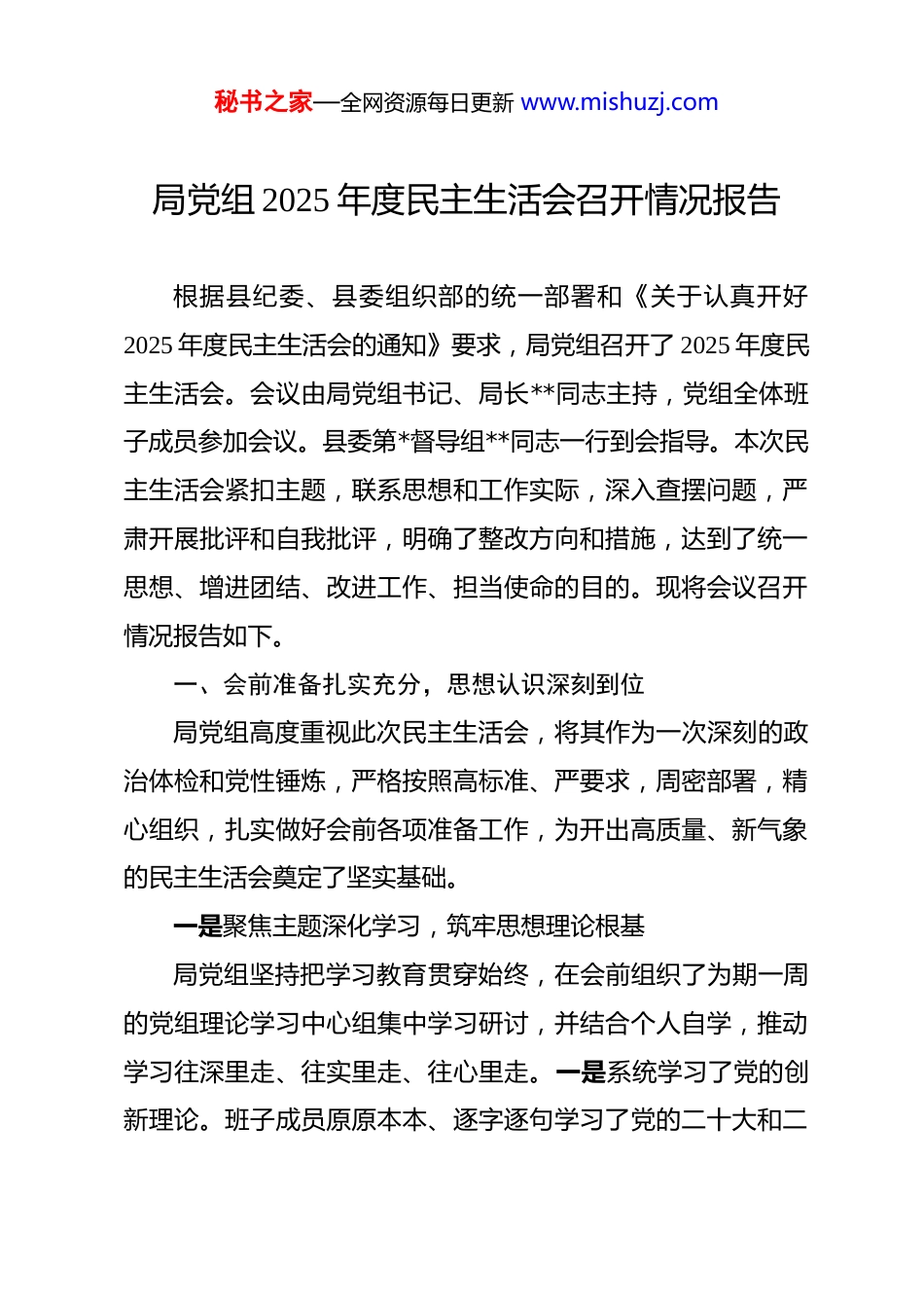 秘书之家—全网资源每日更新 www.mishuzj.com局党组 2025 年度民主生活会召开情况报告 根据县纪委、县委组织部的统一部署和《关于认真开好2025 年度民主生活会的通知》要求,局党组召开了 2025 年度民主生活会。会议由局党组书记、局长**同志主持,党组全体班子成员参加会议。县委第*督导组**同志一行到会指导。本次民主生活会紧扣主题,联系思想和工作实际,深入查摆问题,严肃开展批评和自我批评,明确了整改方向和措施,达到了统一思想、增进团结、改进工作、担当使命的目的。现将会议召开情况报告如下。一、会前准备扎实充分,思想认识深刻到位局党组高度重视此次民主生活会,将其作为一次深刻的政治体检和党性锤炼,严格按照高标准、严要求,周密部署,精心组织,扎实做好会前各项准备工作,为开出高质量、新气象的民主生活会奠定了坚实基础。一是聚焦主题深化学习,筑牢思想理论根基局党组坚持把学习教育贯穿始终,在会前组织了为期一周的党组理论学习中心组集中学习研讨,并结合个人自学,推动学习往深里走、往实里走、往心里走。一是系统学习了党的创新理论。班子成员原原本本、逐字逐句学习了党的二十大和二秘书之家—全网资源每日更新 www.mishuzj.com十届三中、四中全会报告,深入研读了《习近平著作选读》《习近平谈治国理政》等重要著作,深刻领会习近平新时代中国特色社会主义思想的世界观、方法论和贯穿其中的立场观点方法。二是深入学习了党章党规党纪。重点学习了《中国共产党章程》《关于新形势下党内政治生活的若干准则》《中国共产党纪律处分条例》等党内法规,进一步明确了党员领导干部的行为准则和纪律底线,增强了纪律意识和规矩意识。三是深刻领悟了总书记重要讲话精神。重温了习近平总书记视察我省重要讲话精神,以及对**工作作出的一系列重要指示批示精神,切实把思想和行动统一到党中央决策部署和省委、市委、县委工作要求上来,强化了做好新时代**工作的政治自觉。四是扎实开展了警示教育。组织班子成员集中观看了《“赶考”路上》《初心蜕变人生偏航》等警示教育片专题学习了《忏悔录》中的部分案例并就中央纪委国家监委和省、市纪委监委通报的关于违反中央八项规定精神、形式主义官僚主义、酒驾醉驾、公车私用等典型案例进行了深入剖析和讨论。通过以案为鉴、以案明纪,班子成员普遍感到思想受到极大震撼,灵魂受到深刻洗礼,拒腐防变的思想防线进一步筑牢。二是广开言路征求意见,找准查实突出问题局党组坚持开门纳谏、问计于民,通过多种渠道、多种方秘书之家—全网资源每日更新 www.mishuzj.com式广泛征求意见建议,为精准查摆问题提供重要依据。一是书面函询征求意见。向县直相关单位、各乡镇(街道)以及我局服务的重点对象如养老机构、社会组织、困难群众代表等发放征求意见函 120 余份,回收有效意见函 105 份。二是座谈访谈听取意见。组织召开了由服务对象、基层**干部、退休老同志等参加的 3 场专题座谈会,面对面听取意见建议。同时,班子成员结合分管工作,深入基层联系点开展个别访谈,听取最真实的声音。三是设置渠道收集意见。通过在局机关门口设置意见箱、在局官方网站和微信公众号开设“我为**献一策”专栏等方式,拓宽意见收集渠道。经过梳理汇总,共征集到对局党组班子的意见建议 45 条,对班子成员个人的意见建议 78 条。这些意见建议主要集中在理论学习与实际工作结合不够紧密、养老服务体系建设存在短板、社会救助政策宣传不够接地气、基层治理创新力度有待加强、干部队伍作风建设需持续深化等方面。局党组对征求到的意见建议进行了原汁原味地反馈,为班子和个人对照检查提供了精准靶向。三是深入开展谈心谈话,凝聚增进思想共识严格落实“四必谈”要求,在会前深入开展了谈心谈话活动。局党组书记**同志带头与每一位班子成员逐一谈心,既交流思想、沟通工作,也点出问题、提出建议。班子成员之间也秘书之家—全网资源每日更新 www.mishuzj.com开展了坦诚深入的相互谈心。大家在谈心中,真正做到了把自己摆进去、把职责摆进去、把工作摆进去,既谈自身差距,也谈对方不足;既谈工作问题,也谈思想根源;既...