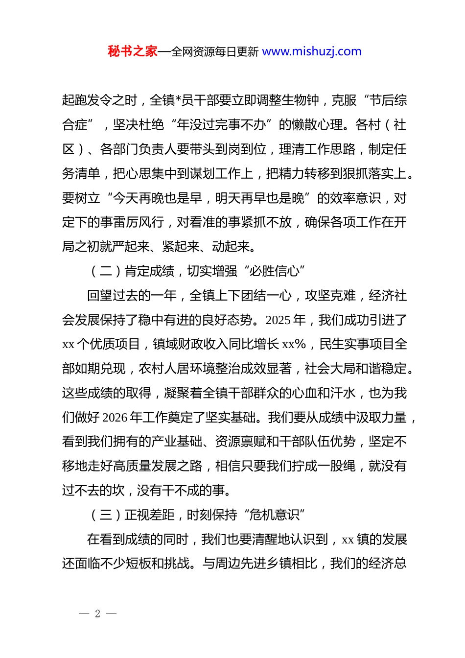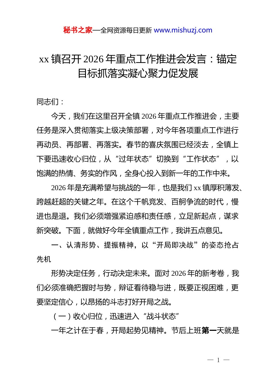 秘书之家—全网资源每日更新 www.mishuzj.comxx 镇召开 2026 年重点工作推进会发言:锚定目标抓落实凝心聚力促发展同志们:今天,我们在这里召开全镇 2026 年重点工作推进会,主要任务是深入贯彻落实上级决策部署,对今年各项重点工作进行再动员、再部署、再落实。春节的喜庆氛围已经淡去,全镇上下要迅速收心归位,从“过年状态”切换到“工作状态”,以饱满的热情、务实的作风,全身心投入到新一年的工作中来。2026 年是充满希望与挑战的一年,也是我们 xx 镇厚积薄发、跨越赶超的关键之年。在这个千帆竞发、百舸争流的时代,慢进也是退。我们必须增强紧迫感和责任感,立足新起点,谋求新突破。下面,就做好今年全镇重点工作,我讲五点意见。一、认清形势、提振精神,以“开局即决战”的姿态抢占先机形势决定任务,行动决定未来。面对 2026 年的新考卷,我们必须准确把握时与势,辩证看待稳与进,既要正视困难,更要坚定信心,以昂扬的斗志打好开局之战。(一)收心归位,迅速进入“战斗状态”一年之计在于春,开局起势见精神。节后上班第一天就是— 1 —秘书之家—全网资源每日更新 www.mishuzj.com起跑发令之时,全镇*员干部要立即调整生物钟,克服“节后综合症”,坚决杜绝“年没过完事不办”的懒散心理。各村(社区)、各部门负责人要带头到岗到位,理清工作思路,制定任务清单,把心思集中到谋划工作上,把精力转移到狠抓落实上。要树立“今天再晚也是早,明天再早也是晚”的效率意识,对定下的事雷厉风行,对看准的事紧抓不放,确保各项工作在开局之初就严起来、紧起来、动起来。(二)肯定成绩,切实增强“必胜信心”回望过去的一年,全镇上下团结一心,攻坚克难,经济社会发展保持了稳中有进的良好态势。2025 年,我们成功引进了xx 个优质项目,镇域财政收入同比增长 xx%,民生实事项目全部如期兑现,农村人居环境整治成效显著,社会大局和谐稳定。这些成绩的取得,凝聚着全镇干部群众的心血和汗水,也为我们做好 2026 年工作奠定了坚实基础。我们要从成绩中汲取力量,看到我们拥有的产业基础、资源禀赋和干部队伍优势,坚定不移地走好高质量发展之路,相信只要我们拧成一股绳,就没有过不去的坎,没有干不成的事。(三)正视差距,时刻保持“危机意识”在看到成绩的同时,我们也要清醒地认识到,xx 镇的发展还面临不少短板和挑战。与周边先进乡镇相比,我们的经济总— 2 —秘书之家—全网资源每日更新 www.mishuzj.com量还不够大,产业结构还不够优,镇村建设还存在薄弱环节,少数干部的担当精神和创新能力还有待提升。前有标兵渐行渐远,后有追兵越来越近,竞争态势逼人。我们必须保持清醒头脑,坚持问题导向,把困难估计得更充分一些,把措施准备得更周全一些,变压力为动力,变危机为契机,在激烈的区域竞争中突围破局,赢得主动。二、聚焦重点、攻坚克难,以“项目为王”的理念厚植优势发展是硬道理,项目是硬支撑。我们要始终把项目建设作为经济工作的生命线,一切围着项目转,一切盯着项目干,以高质量项目支撑高质量发展。(一)精准发力,打好招商“攻坚战”招商引资是经济发展的源头活水。我们要立足我镇产业基础和规划定位,绘制精准的“招商地图”,重点围绕特色农业、加工制造、乡村旅游等优势领域,开展产业链招商、以商招商。要主动走出去,积极对接 xx 地区产业转移,捕捉投资信息,不仅要“捡到篮子里都是菜”,更要“提着篮子去选菜”,力争引进一批科技含量高、带动能力强、环境污染小的好项目。同时,要充分挖掘在外乡贤资源,打好“乡情牌”,鼓励引导 xx籍在外成功人士回乡创业,把资金带回来、把技术带回来、把— 3 —秘书之家—全网资源每日更新 www.mishuzj.com人才带回来。(二)挂图作战,跑出建设“加速度”项目签约只是第一步,落地投产才是关键。对已经确定的2026 年重点项目,要实行“一个项目、一名领导、一套班子、一抓到底”的工作机制。要倒排工期,挂图作战,明确每个节点的时间表和责任人,实行周调度、月通报。对于在建项目,要主动靠前服务,及时协调解决用地、用电、用工等实际困难,确保项目早...