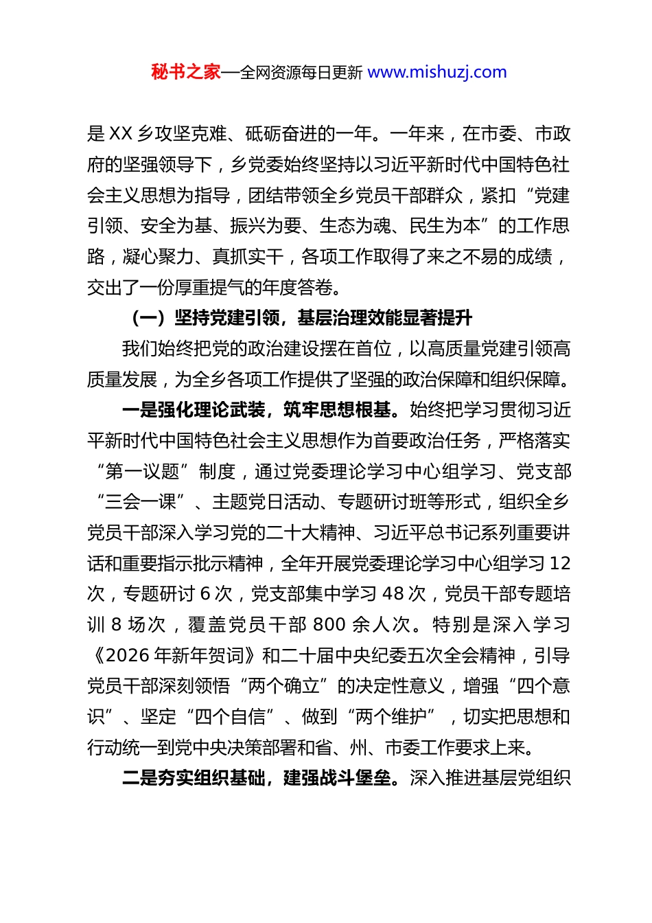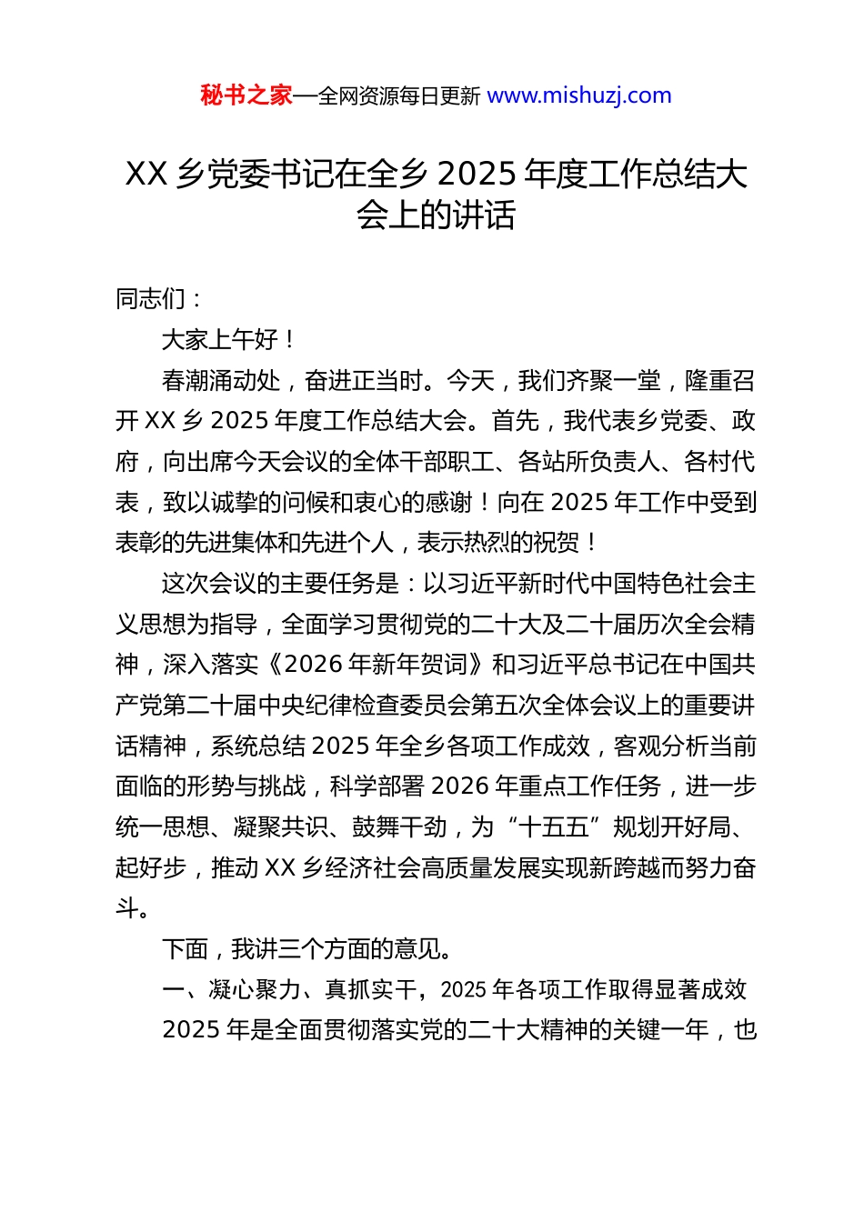 秘书之家—全网资源每日更新 www.mishuzj.comXX 乡党委书记在全乡 2025 年度工作总结大会上的讲话同志们:大家上午好!春潮涌动处,奋进正当时。今天,我们齐聚一堂,隆重召开 XX 乡 2025 年度工作总结大会。首先,我代表乡党委、政府,向出席今天会议的全体干部职工、各站所负责人、各村代表,致以诚挚的问候和衷心的感谢!向在 2025 年工作中受到表彰的先进集体和先进个人,表示热烈的祝贺!这次会议的主要任务是:以习近平新时代中国特色社会主义思想为指导,全面学习贯彻党的二十大及二十届历次全会精神,深入落实《2026 年新年贺词》和习近平总书记在中国共产党第二十届中央纪律检查委员会第五次全体会议上的重要讲话精神,系统总结 2025 年全乡各项工作成效,客观分析当前面临的形势与挑战,科学部署 2026 年重点工作任务,进一步统一思想、凝聚共识、鼓舞干劲,为“十五五”规划开好局、起好步,推动 XX 乡经济社会高质量发展实现新跨越而努力奋斗。下面,我讲三个方面的意见。一、凝心聚力、真抓实干,2025 年各项工作取得显著成效2025 年是全面贯彻落实党的二十大精神的关键一年,也秘书之家—全网资源每日更新 www.mishuzj.com是 XX 乡攻坚克难、砥砺奋进的一年。一年来,在市委、市政府的坚强领导下,乡党委始终坚持以习近平新时代中国特色社会主义思想为指导,团结带领全乡党员干部群众,紧扣“党建引领、安全为基、振兴为要、生态为魂、民生为本”的工作思路,凝心聚力、真抓实干,各项工作取得了来之不易的成绩,交出了一份厚重提气的年度答卷。(一)坚持党建引领,基层治理效能显著提升我们始终把党的政治建设摆在首位,以高质量党建引领高质量发展,为全乡各项工作提供了坚强的政治保障和组织保障。一是强化理论武装,筑牢思想根基。始终把学习贯彻习近平新时代中国特色社会主义思想作为首要政治任务,严格落实“第一议题”制度,通过党委理论学习中心组学习、党支部“三会一课”、主题党日活动、专题研讨班等形式,组织全乡党员干部深入学习党的二十大精神、习近平总书记系列重要讲话和重要指示批示精神,全年开展党委理论学习中心组学习 12次,专题研讨 6 次,党支部集中学习 48 次,党员干部专题培训 8 场次,覆盖党员干部 800 余人次。特别是深入学习《2026 年新年贺词》和二十届中央纪委五次全会精神,引导党员干部深刻领悟“两个确立”的决定性意义,增强“四个意识”、坚定“四个自信”、做到“两个维护”,切实把思想和行动统一到党中央决策部署和省、州、市委工作要求上来。二是夯实组织基础,建强战斗堡垒。深入推进基层党组织秘书之家—全网资源每日更新 www.mishuzj.com标准化规范化建设,完成 3 个村党支部“星级化”创建升级,新建村级党群服务中心 2 个,实现村级党群服务中心全覆盖、功能全提升。严格执行“四议两公开”制度,规范村级重大事项决策程序,村级组织运行更加规范高效。注重党员队伍建设,全年发展新党员 15 名,培养入党积极分子 30 名,党员队伍结构持续优化。开展“党员先锋岗”“党员责任区”创建活动,组织党员在乡村振兴、安全生产、矛盾化解等一线发挥先锋模范作用,累计组建党员志愿服务队 12 支,开展志愿服务活动60 余次,服务群众 2000 余人次。三是从严管党治党,净化政治生态。认真履行全面从严治党主体责任,乡党委与各村党支部、乡直各单位签订党风廉政建设责任书,层层传导压力、压实责任。扎实开展深入贯彻中央八项规定精神学习教育,常态化开展党风廉政教育,组织观看警示教育片 8 部,开展廉政谈话 200 余人次,筑牢党员干部拒腐防变的思想防线。紧盯“四风”问题,开展专项整治行动4 次,查处违反中央八项规定精神问题 3 起,处理 3 人,持续释放全面从严、一严到底的强烈信号。加强村务监督委员会建设,规范村级财务管理、工程项目建设等重点领域监督,基层党风廉政建设水平不断提升。(二)筑牢安全防线,社会大局保持和谐稳定安全是发展的前提,稳定是民生的保障。我们始终坚持底线思维,统筹发展和安全,全方位筑牢安全防线,确保全乡社秘书之家—...