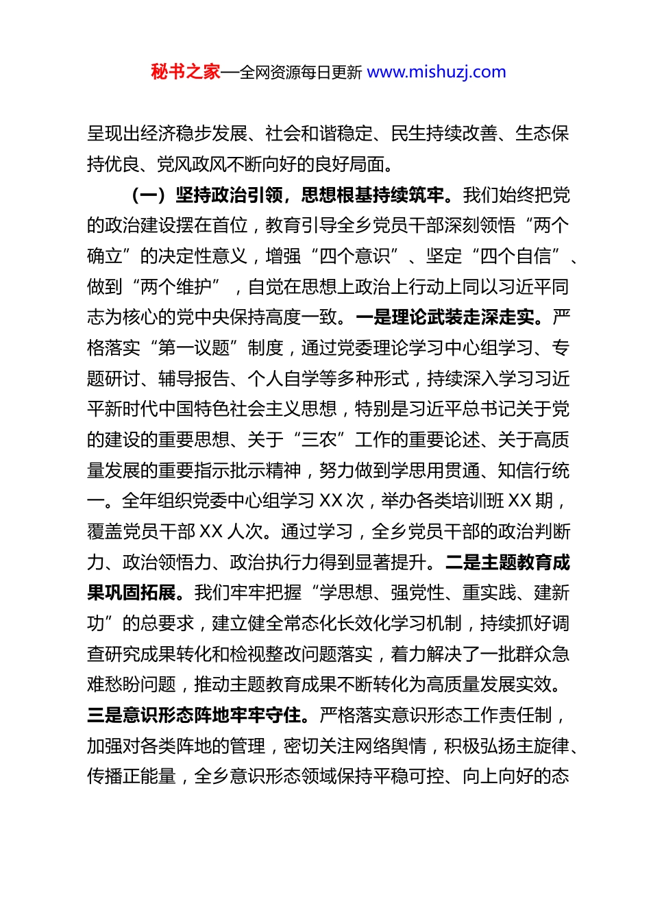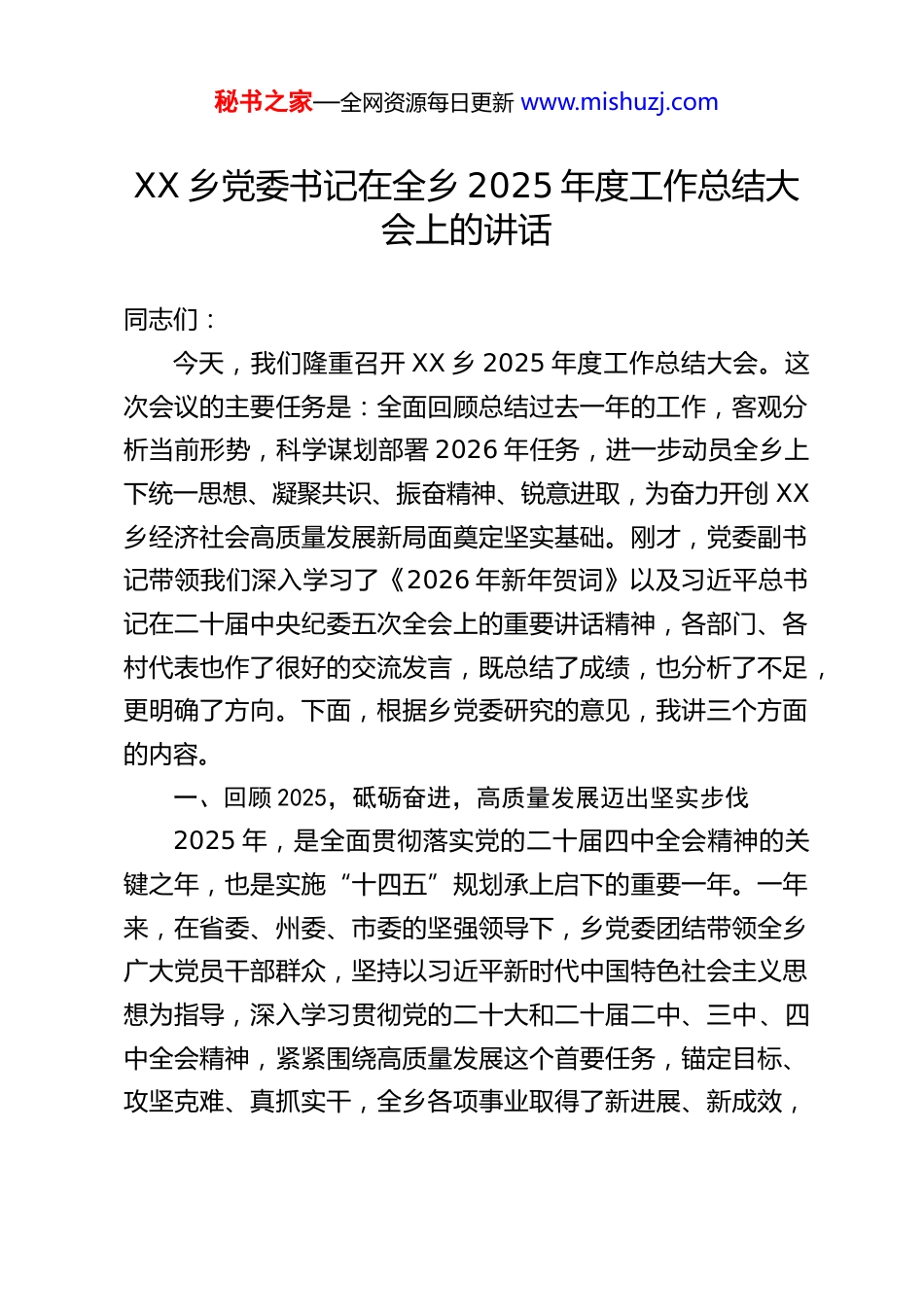 秘书之家—全网资源每日更新 www.mishuzj.comXX 乡党委书记在全乡 2025 年度工作总结大会上的讲话同志们:今天,我们隆重召开 XX 乡 2025 年度工作总结大会。这次会议的主要任务是:全面回顾总结过去一年的工作,客观分析当前形势,科学谋划部署 2026 年任务,进一步动员全乡上下统一思想、凝聚共识、振奋精神、锐意进取,为奋力开创 XX乡经济社会高质量发展新局面奠定坚实基础。刚才,党委副书记带领我们深入学习了《2026 年新年贺词》以及习近平总书记在二十届中央纪委五次全会上的重要讲话精神,各部门、各村代表也作了很好的交流发言,既总结了成绩,也分析了不足,更明确了方向。下面,根据乡党委研究的意见,我讲三个方面的内容。一、回顾 2025,砥砺奋进,高质量发展迈出坚实步伐2025 年,是全面贯彻落实党的二十届四中全会精神的关键之年,也是实施“十四五”规划承上启下的重要一年。一年来,在省委、州委、市委的坚强领导下,乡党委团结带领全乡广大党员干部群众,坚持以习近平新时代中国特色社会主义思想为指导,深入学习贯彻党的二十大和二十届二中、三中、四中全会精神,紧紧围绕高质量发展这个首要任务,锚定目标、攻坚克难、真抓实干,全乡各项事业取得了新进展、新成效,秘书之家—全网资源每日更新 www.mishuzj.com呈现出经济稳步发展、社会和谐稳定、民生持续改善、生态保持优良、党风政风不断向好的良好局面。(一)坚持政治引领,思想根基持续筑牢。我们始终把党的政治建设摆在首位,教育引导全乡党员干部深刻领悟“两个确立”的决定性意义,增强“四个意识”、坚定“四个自信”、做到“两个维护”,自觉在思想上政治上行动上同以习近平同志为核心的党中央保持高度一致。一是理论武装走深走实。严格落实“第一议题”制度,通过党委理论学习中心组学习、专题研讨、辅导报告、个人自学等多种形式,持续深入学习习近平新时代中国特色社会主义思想,特别是习近平总书记关于党的建设的重要思想、关于“三农”工作的重要论述、关于高质量发展的重要指示批示精神,努力做到学思用贯通、知信行统一。全年组织党委中心组学习 XX 次,举办各类培训班 XX 期,覆盖党员干部 XX 人次。通过学习,全乡党员干部的政治判断力、政治领悟力、政治执行力得到显著提升。二是主题教育成果巩固拓展。我们牢牢把握“学思想、强党性、重实践、建新功”的总要求,建立健全常态化长效化学习机制,持续抓好调查研究成果转化和检视整改问题落实,着力解决了一批群众急难愁盼问题,推动主题教育成果不断转化为高质量发展实效。三是意识形态阵地牢牢守住。严格落实意识形态工作责任制,加强对各类阵地的管理,密切关注网络舆情,积极弘扬主旋律、传播正能量,全乡意识形态领域保持平稳可控、向上向好的态秘书之家—全网资源每日更新 www.mishuzj.com势。(二)聚焦组织建设,基层基础更加坚实。我们牢固树立大抓基层的鲜明导向,以提升组织力为重点,全面加强基层党组织建设。一是基层组织体系不断健全。优化村级党组织设置,选优配强村“两委”班子,特别是村党组织书记队伍。顺利完成 XX 村、XX 村等村的“两委”换届选举工作,一批年富力强、群众认可的优秀人才进入村级班子。严格落实“三会一课”、组织生活会、民主评议党员等制度,基层党组织战斗堡垒作用得到有效发挥。二是党员队伍建设质量提升。严把党员发展入口关,注重从致富能手、返乡青年、退役军人中发展党员,全年发展新党员 XX 名。加强党员教育管理,利用“学习强国”、远程教育等平台,丰富学习形式,提升党员队伍整体素质。三是党建引领治理效能彰显。深化“党建+网格”治理模式,推动党组织向小区、楼栋、村民小组延伸。推广“民情日记”“板凳会”等做法,畅通群众诉求表达渠道,有效化解基层矛盾纠纷。党建引领下的自治、法治、德治相结合的乡村治理体系不断完善,基层治理效能显著提升。(三)聚力乡村振兴,“三农”底盘持续夯实。我们坚持把解决好“三农”问题作为全党工作重中之重,全面推进乡村振兴战略落地见效。一是脱贫攻坚成果巩固拓展。严格落实“四个不摘”要求,健全防止返贫动...