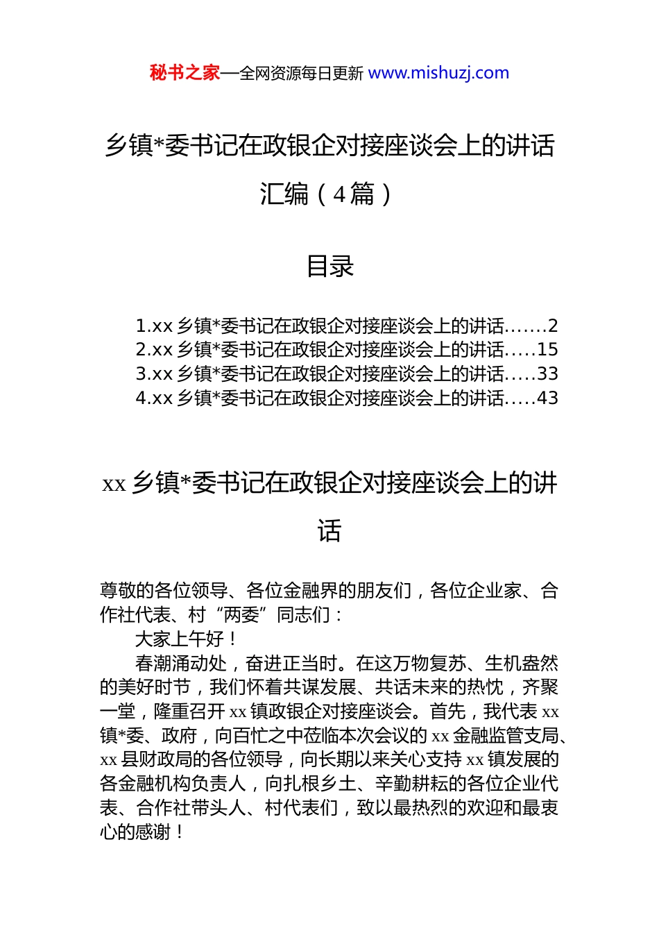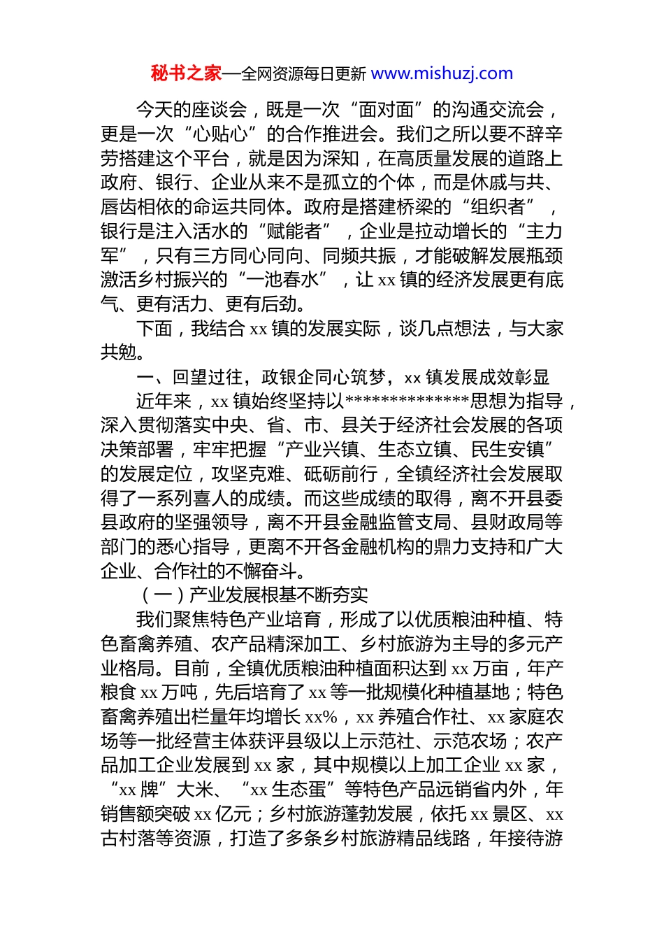 秘书之家—全网资源每日更新 www.mishuzj.com乡镇*委书记在政银企对接座谈会上的讲话汇编(4 篇)目录1.xx 乡镇*委书记在政银企对接座谈会上的讲话.......22.xx 乡镇*委书记在政银企对接座谈会上的讲话.....153.xx 乡镇*委书记在政银企对接座谈会上的讲话.....334.xx 乡镇*委书记在政银企对接座谈会上的讲话.....43xx 乡镇*委书记在政银企对接座谈会上的讲话尊敬的各位领导、各位金融界的朋友们,各位企业家、合作社代表、村“两委”同志们:大家上午好!春潮涌动处,奋进正当时。在这万物复苏、生机盎然的美好时节,我们怀着共谋发展、共话未来的热忱,齐聚一堂,隆重召开 xx 镇政银企对接座谈会。首先,我代表 xx镇*委、政府,向百忙之中莅临本次会议的 xx 金融监管支局、xx 县财政局的各位领导,向长期以来关心支持 xx 镇发展的各金融机构负责人,向扎根乡土、辛勤耕耘的各位企业代表、合作社带头人、村代表们,致以最热烈的欢迎和最衷心的感谢!秘书之家—全网资源每日更新 www.mishuzj.com今天的座谈会,既是一次“面对面”的沟通交流会,更是一次“心贴心”的合作推进会。我们之所以要不辞辛劳搭建这个平台,就是因为深知,在高质量发展的道路上政府、银行、企业从来不是孤立的个体,而是休戚与共、唇齿相依的命运共同体。政府是搭建桥梁的“组织者”,银行是注入活水的“赋能者”,企业是拉动增长的“主力军”,只有三方同心同向、同频共振,才能破解发展瓶颈激活乡村振兴的“一池春水”,让 xx 镇的经济发展更有底气、更有活力、更有后劲。下面,我结合 xx 镇的发展实际,谈几点想法,与大家共勉。一、回望过往,政银企同心筑梦,xx 镇发展成效彰显近年来,xx 镇始终坚持以**************思想为指导,深入贯彻落实中央、省、市、县关于经济社会发展的各项决策部署,牢牢把握“产业兴镇、生态立镇、民生安镇”的发展定位,攻坚克难、砥砺前行,全镇经济社会发展取得了一系列喜人的成绩。而这些成绩的取得,离不开县委县政府的坚强领导,离不开县金融监管支局、县财政局等部门的悉心指导,更离不开各金融机构的鼎力支持和广大企业、合作社的不懈奋斗。(一)产业发展根基不断夯实我们聚焦特色产业培育,形成了以优质粮油种植、特色畜禽养殖、农产品精深加工、乡村旅游为主导的多元产业格局。目前,全镇优质粮油种植面积达到 xx 万亩,年产粮食 xx 万吨,先后培育了 xx 等一批规模化种植基地;特色畜禽养殖出栏量年均增长 xx%,xx 养殖合作社、xx 家庭农场等一批经营主体获评县级以上示范社、示范农场;农产品加工企业发展到 xx 家,其中规模以上加工企业 xx 家,“xx 牌”大米、“xx 生态蛋”等特色产品远销省内外,年销售额突破 xx 亿元;乡村旅游蓬勃发展,依托 xx 景区、xx古村落等资源,打造了多条乡村旅游精品线路,年接待游秘书之家—全网资源每日更新 www.mishuzj.com客 xx 万人次,带动群众增收致富成效显著。(二)政银企合作成果丰硕在产业发展的背后,离不开金融“活水”的持续滋养。过去几年,各金融机构始终与 xx 镇发展同呼吸、共命运,主动对接企业需求,创新金融产品,优化服务流程,为我镇经济社会发展注入了强劲动力。据统计,2022 年以来,辖区内中国银行 xx 支行、农业银行 xx 县支行等金融机构累计向我镇企业、合作社、农户投放信贷资金 xx 亿元,其中支持农业产业 xx 亿元、工业企业 xx 亿元、乡村旅游及基础设施建设 xx 亿元。我们不会忘记,在 xx 农产品加工企业扩大生产规模、面临资金周转难题时,农业银行 xx 县支行主动上门服务,简化审批流程,为企业发放专项贷款 xx 万元,让企业顺利完成了生产线升级,年产值从 xx 万元提升至 xx 万元;我们不会忘记,在 xx 养殖合作社遭遇疫情冲击、饲料采购资金短缺时,中国银行 xx 支行推出“助农贷”产品,为合作社提供无抵押贷款 xx 万元,帮助合作社渡过了难关,如今合作社年出栏畜禽量较之前增长了 xx%;我们更不会忘记,在各村推进人居环境整治、发展村集体经济的过程中,各金融机构纷纷伸出援手,为 xx 村光伏发电项...