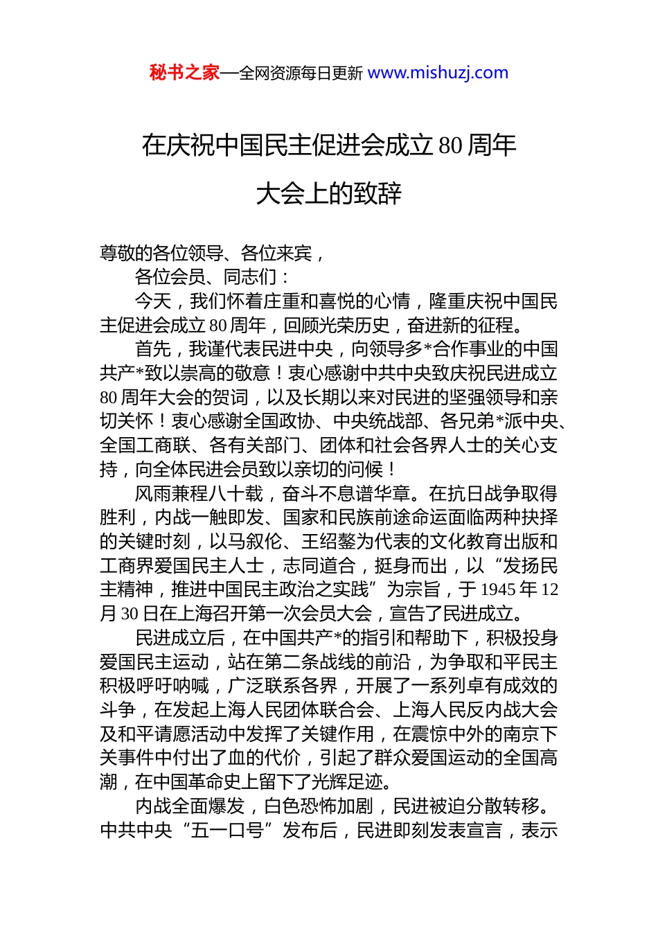 秘书之家—全网资源每日更新 www.mishuzj.com在庆祝中国民主促进会成立 80 周年大会上的致辞尊敬的各位领导、各位来宾,各位会员、同志们:今天,我们怀着庄重和喜悦的心情,隆重庆祝中国民主促进会成立 80 周年,回顾光荣历史,奋进新的征程。首先,我谨代表民进中央,向领导多*合作事业的中国共产*致以崇高的敬意!衷心感谢中共中央致庆祝民进成立80 周年大会的贺词,以及长期以来对民进的坚强领导和亲切关怀!衷心感谢全国政协、中央统战部、各兄弟*派中央、全国工商联、各有关部门、团体和社会各界人士的关心支持,向全体民进会员致以亲切的问候!风雨兼程八十载,奋斗不息谱华章。在抗日战争取得胜利,内战一触即发、国家和民族前途命运面临两种抉择的关键时刻,以马叙伦、王绍鏊为代表的文化教育出版和工商界爱国民主人士,志同道合,挺身而出,以“发扬民主精神,推进中国民主政治之实践”为宗旨,于 1945 年 12月 30 日在上海召开第一次会员大会,宣告了民进成立。民进成立后,在中国共产*的指引和帮助下,积极投身爱国民主运动,站在第二条战线的前沿,为争取和平民主积极呼吁呐喊,广泛联系各界,开展了一系列卓有成效的斗争,在发起上海人民团体联合会、上海人民反内战大会及和平请愿活动中发挥了关键作用,在震惊中外的南京下关事件中付出了血的代价,引起了群众爱国运动的全国高潮,在中国革命史上留下了光辉足迹。内战全面爆发,白色恐怖加剧,民进被迫分散转移。中共中央“五一口号”发布后,民进即刻发表宣言,表示秘书之家—全网资源每日更新 www.mishuzj.com坚决拥护、积极响应,制定了《中国民主促进会拟提出于政治协商会议之行动公约及政治纲领》,北上解放区,在新政协筹备过程中,提出了增设新政协筹备会单位的建议在中国人民政协第一届全体会议期间和全国政协一届一次会议上,分别提出了关于国歌、国庆日的建议,参加了中央人民政府的组建,为夺取新民主主义革命胜利和建立新中国作出了重要贡献。新中国开启了社会主义伟大事业,统一战线空前广大,民进积极发展和巩固组织,开展思想改造学习,贯彻中国共产*“长期共存、互相监督”方针,经受了曲折发展中的严峻考验,坚持在正道上行;积极投身新中国建设事业,为巩固新生人民政权、壮大人民民主统一战线、恢复和发展国民经济,特别是在教育文化事业改革和建设中发挥了独特作用。改革开放开创了中国特色社会主义,多*合作事业发展步入制度化轨道。民进积极贯彻中国共产*“长期共存、互相监督、肝胆相照、荣辱与共”方针和中共中央关于坚持和完善中国共产*领导的多*合作和政治协商制度的意见精神,按照中国特色社会主义事业对参政 dj 设的要求,着力提高素质,搞好政治交接,自身建设呈现了新局面。围绕社会主义现代化建设的中心和大局,民进深入调查研究,积极建言献策,反映社情民意,开展社会服务,促进海外联谊在恢复设立教师节、制定教师法等教育法规、倡导尊师重教、推进资源环境保护和区域发展等方面提供了重要建议为改革发展贡献了智慧和力量。中共十八大以来,中国特色社会主义进入新时代,民进以**************思想为指导,深入学习贯彻中共中央关于加强中国特色社会主义参政 dj 设、关于坚持好发展好完善好中国新型政*制度等文件精神,践行“四新”“三好”要求,全面加强自身建设,先后开展 7 次 zt 教育、学习教育和专题教育,持续开展了 13 次主题年建设。坚持以秘书之家—全网资源每日更新 www.mishuzj.com思想政治建设为核心,以政治学习为引领,深化政治交接不断夯实团结奋斗的共同思想政治基础。以领导班子建设为重点,统筹推进代表人士队伍建设、组织发展、基层组织建设、会员工作和机关建设,不断增进整体合力。深入推进作风建设,学习中国共产*的自我革命精神,落实中共中央八项规定及其实施细则精神,维护良好政治生态,大力弘扬优良传统,倡导民主、团结、求实、清廉的作风,强化纪律教育和警示教育,深入开展内部监督,实现内部监督工作全覆盖。着力健全制度框架和工作体系,依据会章,制定了 18 部条例和 152 项配套规定和规范性文件,同步推进立改废释...