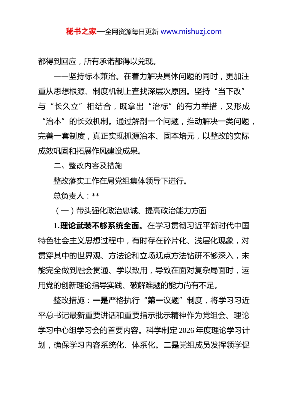 秘书之家—全网资源每日更新 www.mishuzj.com局党组 2025 年度民主生活会整改落实方案 根据县委统一部署,我局党组召开了 2025 年度民主生活会。会议紧扣主题,深入查摆问题,深刻剖析根源,严肃开展批评与自我批评,达到了预期目的。会后,党组对查摆出的问题和征求到的意见建议进行了系统梳理,共归纳为 6 个方面 13 项具体问题。为确保整改工作取得实效,特制定本方案。一、整改原则——坚守政治本色。始终把习近平新时代中国特色社会主义思想作为根本遵循,深入学习贯彻党的二十届三中、四中全会精神及习近平总书记系列重要讲话和重要指示批示精神。将问题整改作为检验“两个确立”决定性意义领悟深度、增强“四个意识”、坚定“四个自信”、做到“两个维护”的试金石,以高度的政治自觉和行动自觉,不折不扣推动各项整改任务落地见效。——坚持问题导向。聚焦本次民主生活会查摆出的突出问题,特别是作风建设方面的顽瘴痼疾,建立问题清单、责任清单、任务清单。对能够即时整改的问题,立行立改,迅速到位;对需要阶段性推进的问题,明确时间节点,持续用力;对需要长期坚持的制度性问题,深化研究,建章立制。确保所有问题秘书之家—全网资源每日更新 www.mishuzj.com都得到回应,所有承诺都得以兑现。——坚持标本兼治。在着力解决具体问题的同时,更加注重从思想根源、制度机制上查找深层次原因。坚持“当下改”与“长久立”相结合,既拿出“治标”的有力举措,又形成“治本”的长效机制。通过解剖一个问题,推动解决一类问题,完善一套制度,真正实现抓源治本、固本培元,以整改的实际成效巩固和拓展作风建设成果。二、整改内容及措施整改落实工作在局党组集体领导下进行。总负责人:**(一)带头强化政治忠诚、提高政治能力方面1.理论武装不够系统全面。在学习贯彻习近平新时代中国特色社会主义思想过程中,有时存在碎片化、浅层化现象,对贯穿其中的世界观、方法论和立场观点方法钻研不够深入,未能完全做到融会贯通、学以致用,导致在面对复杂局面时,运用党的创新理论指导实践、破解难题的能力尚有不足。整改措施:一是严格执行“第一议题”制度,将学习习近平总书记最新重要讲话和重要指示批示精神作为党组会、理论学习中心组学习会的首要内容。科学制定 2026 年度理论学习计划,确保学习内容系统化、体系化。二是党组成员发挥领学促秘书之家—全网资源每日更新 www.mishuzj.com学作用,坚持先学一步、学深一层,每年至少撰写 2 篇高质量的学习心得或理论文章,并在中心组学习会上交流研讨。三是创新学习方式,结合我局工作实际,定期举办专题读书班、理论研讨会,邀请专家学者进行辅导讲座,引导党员干部在深学细悟中提升政治判断力、政治领悟力、政治执行力。责任领导:局领导班子成员牵头单位:**科室责任单位:各科室、下属单位完成时限:即知即改并长期坚持2.贯彻执行上级决策部署不够坚决彻底。在落实中央大政方针及省、市、县委工作要求时,有时存在结合实际不够紧密、创新性转化不足的问题。对一些长期性、复杂性任务,虽然有部署、有安排,但在跟踪问效、一抓到底的韧劲上有所欠缺,导致部分工作成效未达最佳预期。整改措施:一是建立健全贯彻落实上级决策部署的闭环管理机制。对中央和上级党委的重要会议、文件精神,第一时间组织传达学习,并结合我局职能职责,制定具体化、项目化、清单化的实施方案。二是强化督查督办,由分管领导牵头,定期对重点工作的进展情况进行专项督查和“回头看”,及时发现并协调解决推进过程中的堵点、难点问题。三是坚持底线思秘书之家—全网资源每日更新 www.mishuzj.com维和战略定力,围绕“十五五”规划开局,主动谋划、积极作为,确保我局各项工作始终与上级部署同频共振、同向发力。责任领导:局领导班子成员牵头单位:**科室责任单位:各科室、下属单位完成时限:2026 年年底前取得明显成效,并持续推进(二)带头固本培元、增强党性方面3.党性修养锤炼不够经常。在日常工作中,更多地关注业务指标的完成,对持之以恒加强党性锻炼、解决好世界观人生观价值观“总开关”问题的重视程度和自觉性有待提...