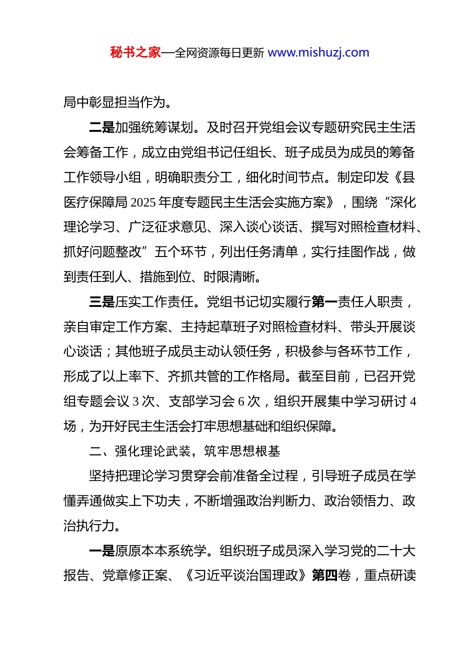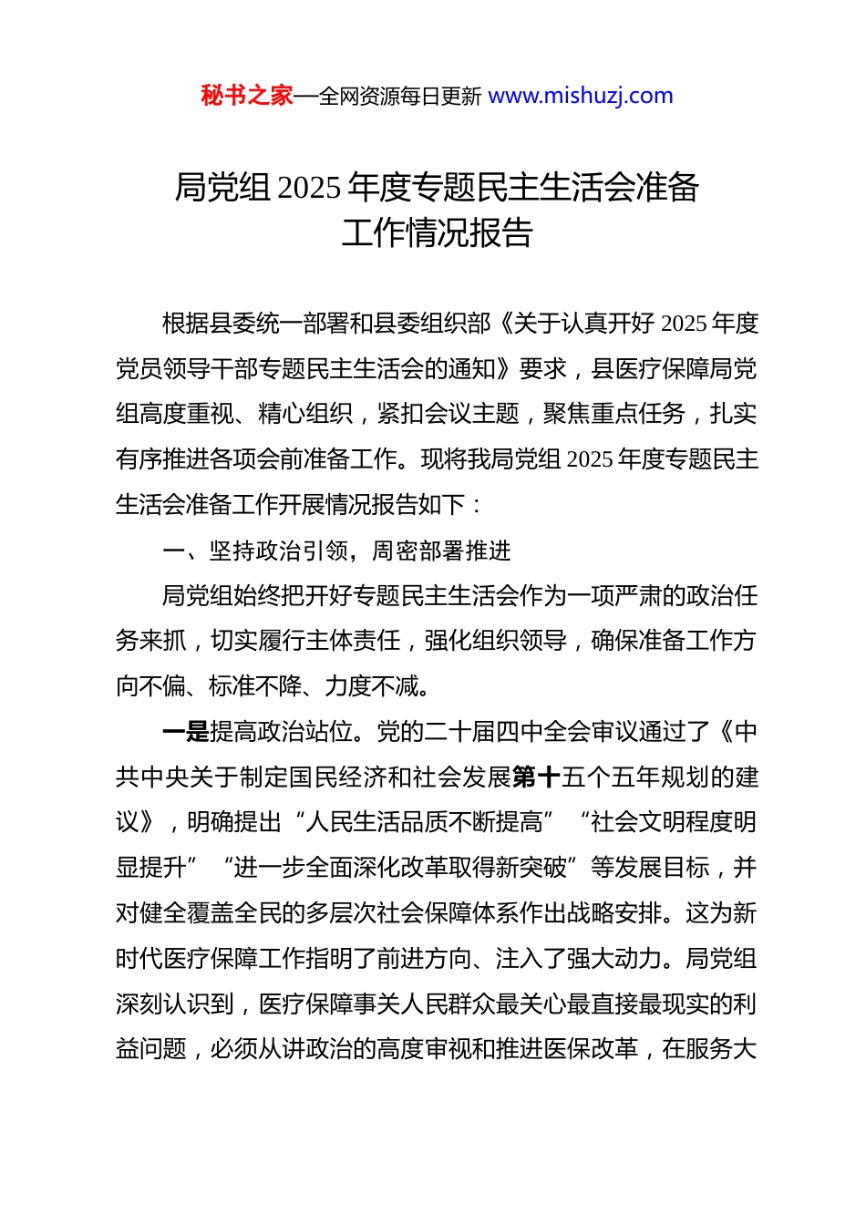 秘书之家—全网资源每日更新 www.mishuzj.com局党组 2025 年度专题民主生活会准备工作情况报告 根据县委统一部署和县委组织部《关于认真开好 2025 年度党员领导干部专题民主生活会的通知》要求,县医疗保障局党组高度重视、精心组织,紧扣会议主题,聚焦重点任务,扎实有序推进各项会前准备工作。现将我局党组 2025 年度专题民主生活会准备工作开展情况报告如下:一、坚持政治引领,周密部署推进局党组始终把开好专题民主生活会作为一项严肃的政治任务来抓,切实履行主体责任,强化组织领导,确保准备工作方向不偏、标准不降、力度不减。一是提高政治站位。党的二十届四中全会审议通过了《中共中央关于制定国民经济和社会发展第十五个五年规划的建议》,明确提出“人民生活品质不断提高”“社会文明程度明显提升”“进一步全面深化改革取得新突破”等发展目标,并对健全覆盖全民的多层次社会保障体系作出战略安排。这为新时代医疗保障工作指明了前进方向、注入了强大动力。局党组深刻认识到,医疗保障事关人民群众最关心最直接最现实的利益问题,必须从讲政治的高度审视和推进医保改革,在服务大秘书之家—全网资源每日更新 www.mishuzj.com局中彰显担当作为。二是加强统筹谋划。及时召开党组会议专题研究民主生活会筹备工作,成立由党组书记任组长、班子成员为成员的筹备工作领导小组,明确职责分工,细化时间节点。制定印发《县医疗保障局 2025 年度专题民主生活会实施方案》,围绕“深化理论学习、广泛征求意见、深入谈心谈话、撰写对照检查材料、抓好问题整改”五个环节,列出任务清单,实行挂图作战,做到责任到人、措施到位、时限清晰。三是压实工作责任。党组书记切实履行第一责任人职责,亲自审定工作方案、主持起草班子对照检查材料、带头开展谈心谈话;其他班子成员主动认领任务,积极参与各环节工作,形成了以上率下、齐抓共管的工作格局。截至目前,已召开党组专题会议 3 次、支部学习会 6 次,组织开展集中学习研讨 4场,为开好民主生活会打牢思想基础和组织保障。二、强化理论武装,筑牢思想根基坚持把理论学习贯穿会前准备全过程,引导班子成员在学懂弄通做实上下功夫,不断增强政治判断力、政治领悟力、政治执行力。一是原原本本系统学。组织班子成员深入学习党的二十大报告、党章修正案、《习近平谈治国理政》第四卷,重点研读秘书之家—全网资源每日更新 www.mishuzj.com党的二十届四中全会公报和《中共中央关于制定国民经济和社会发展第十五个五年规划的建议》,跟进学习贯彻习近平总书记关于医疗保障工作的重要指示批示精神。通过集中学习与个人自学相结合的方式,累计开展专题学习 X 天,参学率达100%。大家一致认为,“十五五”时期是我国基本实现社会主义现代化的关键阶段,医保制度改革必须紧跟国家战略步伐,聚焦“公平可及、安全规范、可持续”的目标持续发力。二是联系实际深入悟。结合医保工作实际,围绕“如何更好发挥医保在三医联动中的牵引作用”“怎样破解基层医疗机构服务能力不足导致的‘看病难’问题”等议题开展交流研讨。2025 年,全县基本医疗保险参保率达到 98.7%,城乡居民医保人均财政补助标准提高至**元,住院费用跨省直接结算覆盖所有定点医疗机构,门诊慢特病异地就医实现“一键报销”。这些惠民举措的背后,正是党的创新理论指导实践的生动体现。通过学习讨论,班子成员更加坚持以人民为中心的发展思想,增强了履职尽责的责任感和使命感。三是对照问题反思改。聚焦群众反映强烈的“报销慢”“目录外药品贵”“欺诈骗保屡禁不止”等问题,从思想根源上找差距、查原因。有的同志反思,在推动医保支付方式改革过程中存在畏难情绪,对 DRG 付费试点推进不够有力;有的同秘书之家—全网资源每日更新 www.mishuzj.com志指出,对新业态从业人员参保政策宣传不到位,导致部分灵活就业人员断保脱保。这些问题都反映出理论武装还需进一步深化,必须以更高标准推动学用转化。三、广开言路纳谏,全面查摆问题坚持开门搞教育、开门听意见,采取多种方式广泛征求各方面意见建议,力求把问题找准、把短板摸清。一是深入一线...
