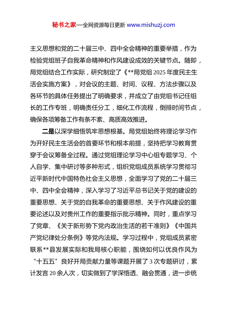 秘书之家—全网资源每日更新 www.mishuzj.com局党组关于 2025 年度民主生活会召开情况的报告 *县委:根据党中央决策部署及省委、市委、县委统一安排,我局党组于 2026 年 1 月 15 日召开了 2025 年度民主生活会。局党组书记**同志主持会议,局党组全体成员参加会议。县委第*督导组**同志、**同志到会进行全程指导。会议准备扎实充分,查摆问题深刻具体,开展批评严肃认真,整改措施务实有力,达到了统一思想、增进团结、改进作风、促进工作的预期目的。现将会议有关情况报告如下。一、会议基本情况与会前准备局党组对开好此次民主生活会高度重视,将其作为一次深刻的“政治体检”和党性锤炼,严格按照县委要求,以高度的政治责任感,周密部署、精心组织,扎实细致地做好各项会前准备工作,为高质量开好民主生活会奠定了坚实基础。一是以严实标准精心组织部署。局党组第一时间召开专题会议,传达学习县委关于开好 2025 年度民主生活会的通知精神,深入领会会议主题的深刻内涵和实践要求。会议强调,必须将此次民主生活会作为深入学习贯彻习近平新时代中国特色社会秘书之家—全网资源每日更新 www.mishuzj.com主义思想和党的二十届三中、四中全会精神的重要举措,作为检验党组班子自我革命精神和作风建设成效的关键节点。随即,局党组结合工作实际,研究制定了《**局党组 2025 年度民主生活会实施方案》,对会议的主题、时间、议程、方法步骤以及各环节的具体任务提出了明确要求,并成立了由党组书记任组长的工作专班,明确责任分工,细化工作流程,倒排时间节点,确保各项筹备工作有条不紊、高质高效推进。二是以深学细悟筑牢思想根基。局党组始终将理论学习作为开好民主生活会的首要环节和根本前提,坚持把学习教育贯穿于会议筹备全过程。通过党组理论学习中心组专题学习、个人自学、集中研讨等多种形式,组织党组成员系统学习贯彻习近平新时代中国特色社会主义思想,全面学习了党的二十届三中、四中全会精神,深入学习了习近平总书记关于党的建设的重要思想、关于党的自我革命的重要思想、关于作风建设的重要论述以及对贵州工作的重要指示批示精神。同时,重点学习了党章、《关于新形势下党内政治生活的若干准则》《中国共产党纪律处分条例》等党内法规。学习过程中,党组成员紧密联系**县发展实际和我局核心职能,围绕如何以优良作风为“十五五”良好开局贡献力量等课题开展了 3 次专题研讨,累计发言 20 余人次,切实做到了学深悟透、融会贯通,进一步统秘书之家—全网资源每日更新 www.mishuzj.com一了思想、提高了认识、凝聚了共识,为深入查摆问题、剖析根源打下了坚实的思想理论基础。二是个别访谈,党组成员分别带队,深入基层一线、项目现场,与干部职工、服务对象进行面对面交流,累计访谈 80 余人次。三是书面征求意见建议。向全局各科室、下属单位以及部分服务对象、基层联系点发放了征求意见函 120 份,回收有效意见函 115 份。三是以开门纳谏广泛征求意见。为确保问题找得准、找得实,局党组坚持发扬民主、开门纳谏的原则,通过多种渠道广泛征求意见建议。三是座谈交流,组织召开了不同层级的座谈会 4 场,包括中层干部座谈会、青年干部座谈会、服务对象代表座谈会等,直接听取各方面的声音。四是设立线上意见箱,通过单位内部网站和工作群,开通线上渠道,鼓励干部职工匿名提出宝贵意见。经过系统梳理汇总,共收集到涉及党组班子和成员个人的各类意见建议 76 条,经过去重、提炼后,归纳为 6 个方面 28 条具体意见,为党组班子和成员对照检查、深入剖析提供了重要依据。四是以坦诚相见深入谈心谈话。局党组严格落实“四必谈”要求,在会前深入开展了谈心谈话活动,营造了开好民主生活会的良好氛围。党组书记**同志带头与每一位班子成员逐一进行谈心,主动亮明自身存在的不足,诚恳听取对方的批评秘书之家—全网资源每日更新 www.mishuzj.com意见。班子成员之间也普遍开展了相互谈心,大家本着对同志、对事业高度负责的态度,既交流思想、沟通工作,又坦诚相见、指出问题,真正做到了把问题谈开、把思想谈通、把意见谈实。同时...