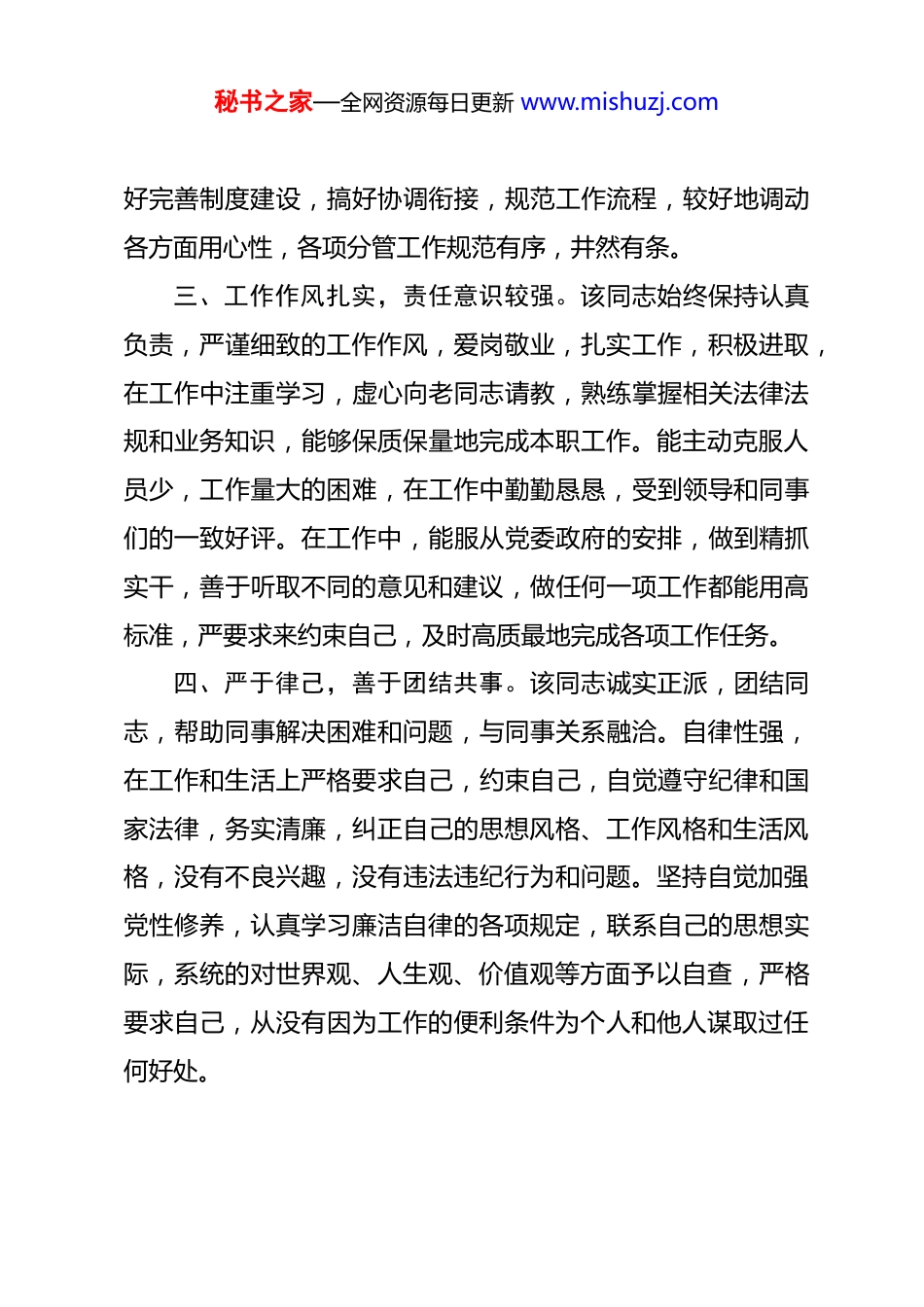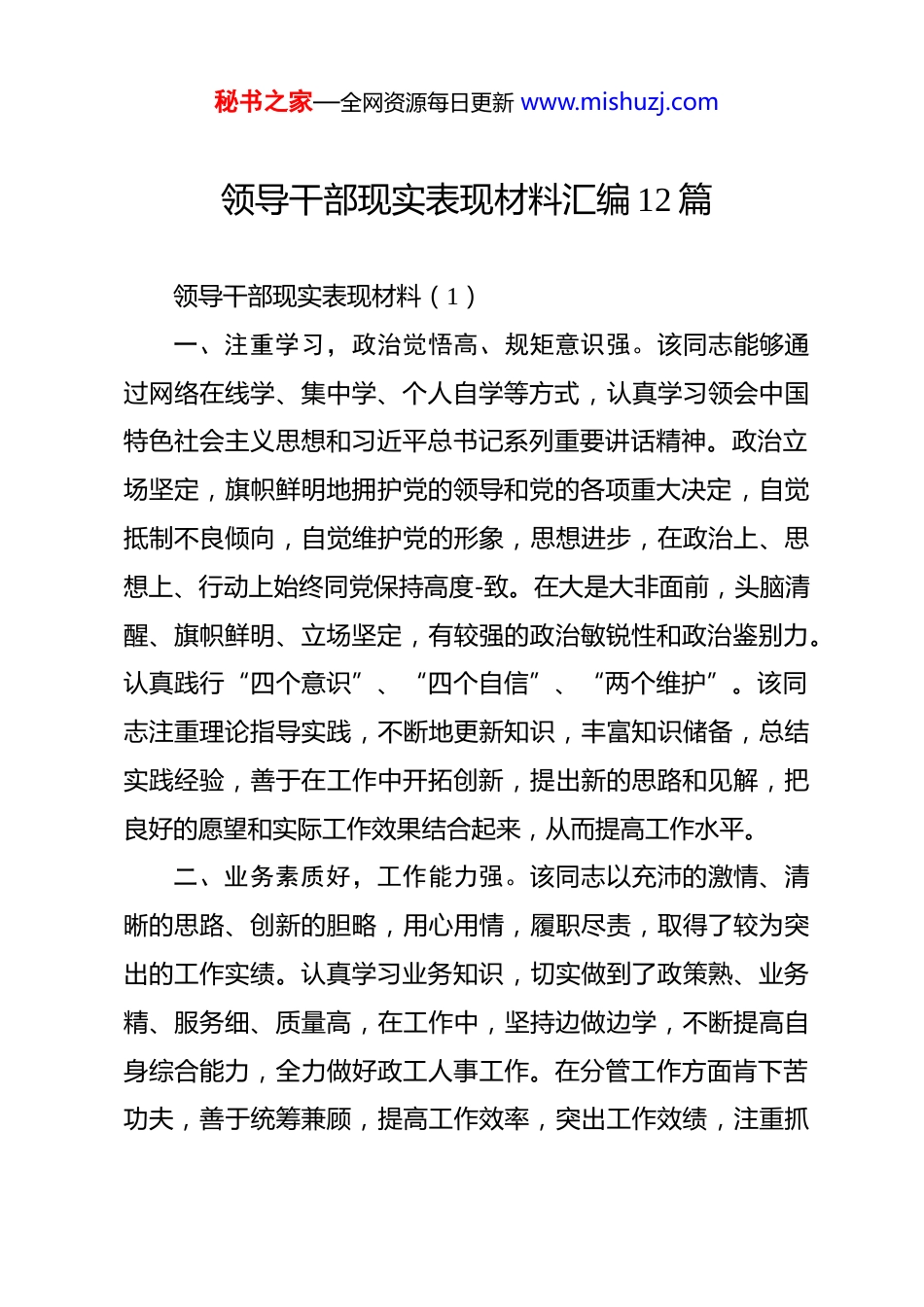 秘书之家—全网资源每日更新 www.mishuzj.com领导干部现实表现材料汇编 12 篇 领导干部现实表现材料(1)一、注重学习,政治觉悟高、规矩意识强。该同志能够通过网络在线学、集中学、个人自学等方式,认真学习领会中国特色社会主义思想和习近平总书记系列重要讲话精神。政治立场坚定,旗帜鲜明地拥护党的领导和党的各项重大决定,自觉抵制不良倾向,自觉维护党的形象,思想进步,在政治上、思想上、行动上始终同党保持高度-致。在大是大非面前,头脑清醒、旗帜鲜明、立场坚定,有较强的政治敏锐性和政治鉴别力。认真践行“四个意识”、“四个自信”、“两个维护”。该同志注重理论指导实践,不断地更新知识,丰富知识储备,总结实践经验,善于在工作中开拓创新,提出新的思路和见解,把良好的愿望和实际工作效果结合起来,从而提高工作水平。二、业务素质好,工作能力强。该同志以充沛的激情、清晰的思路、创新的胆略,用心用情,履职尽责,取得了较为突出的工作实绩。认真学习业务知识,切实做到了政策熟、业务精、服务细、质量高,在工作中,坚持边做边学,不断提高自身综合能力,全力做好政工人事工作。在分管工作方面肯下苦功夫,善于统筹兼顾,提高工作效率,突出工作效绩,注重抓秘书之家—全网资源每日更新 www.mishuzj.com好完善制度建设,搞好协调衔接,规范工作流程,较好地调动各方面用心性,各项分管工作规范有序,井然有条。三、工作作风扎实,责任意识较强。该同志始终保持认真负责,严谨细致的工作作风,爱岗敬业,扎实工作,积极进取,在工作中注重学习,虚心向老同志请教,熟练掌握相关法律法规和业务知识,能够保质保量地完成本职工作。能主动克服人员少,工作量大的困难,在工作中勤勤恳恳,受到领导和同事们的一致好评。在工作中,能服从党委政府的安排,做到精抓实干,善于听取不同的意见和建议,做任何一项工作都能用高标准,严要求来约束自己,及时高质最地完成各项工作任务。四、严于律己,善于团结共事。该同志诚实正派,团结同志,帮助同事解决困难和问题,与同事关系融洽。自律性强,在工作和生活上严格要求自己,约束自己,自觉遵守纪律和国家法律,务实清廉,纠正自己的思想风格、工作风格和生活风格,没有不良兴趣,没有违法违纪行为和问题。坚持自觉加强党性修养,认真学习廉洁自律的各项规定,联系自己的思想实际,系统的对世界观、人生观、价值观等方面予以自查,严格要求自己,从没有因为工作的便利条件为个人和他人谋取过任何好处。 秘书之家—全网资源每日更新 www.mishuzj.com领导干部现实表现材料(2)**,女,生于 1983 年 10 月,汉族,大学学历,籍贯****,出生地***。20**年 9 月参加工作,20**年 4 月加入中国共产党,**年**月**日任***。该同志思想素质高,政治觉悟强。该同志自任职以来能继续坚持认真学习马列主义、毛泽东思想、邓小平理论和“三个代表”重要思想,深入学习领会习近平总书记系列重要讲话精神,贯彻落实党的十八届三中、四中、五中、六中全会和省委十届九次全会、市委三届十次全会精神,围绕“两学一做”学习教育要求,不断增强自己的政治理论水平,提高政治修养,牢固树立讲政治、顾大局的观念。始终做到在政治信仰、政治立场、政治方向、政治道路、政治本色、政治纪律上不变、不移、不偏、不松。树立正确的人生观、价值观、世界观,树立全心全意为人民服务的宗旨意识。利用业余时间不断加强对防震减灾专业知识的学习。该同志业务水平较强,工作干劲足。该同志自任职以来工作积极性进一步增强,能力提升较大,无论是在管理上还是在与科室、外单位的协调上都表现突出。能勤奋学习、虚心求教、擅于思考,加强思想道德素质、业务技能的培养,加强理论知识、政策法规的学习,熟练掌握工作秘书之家—全网资源每日更新 www.mishuzj.com所需的各项业务技能,具备处理繁杂事务的能力。连续三年被评为“优秀公务员”,多次被评为“优秀共产党员”。能高效率、高质量完成各项工作任务,在处理领导交办的各项事务时做到了事事有回音,件件有落实。一是较好地完成文秘工作。长期负责起草领导讲话稿及各类全局性...