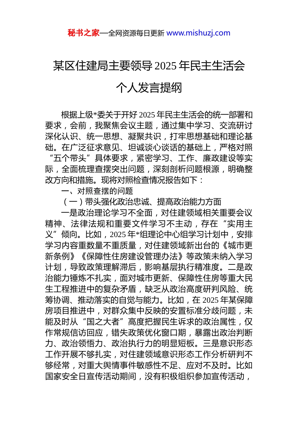 秘书之家—全网资源每日更新 www.mishuzj.com某区住建局主要领导 2025 年民主生活会个人发言提纲根据上级*委关于开好 2025 年民主生活会的统一部署和要求,会前,我聚焦会议主题,通过集中学习、交流研讨深化认识、统一思想、凝聚共识,打牢思想基础和理论基础。在广泛征求意见、坦诚谈心谈话的基础上,严格对照“五个带头”具体要求,紧密学习、工作、廉政建设等实际,全面梳理查摆突出问题,深刻剖析问题根源,明确整改方向和措施。现将对照检查情况报告如下:一、对照查摆的问题 (一)带头强化政治忠诚、提高政治能力方面一是政治理论学习不全面,对住建领域相关重要会议精神、法律法规和重要文件学习不主动,存在“实用主义”倾向。比如,2025 年*组理论中心组学习计划中,安排学习内容重数量不重质量,对住建领域新出台的《城市更新条例》《保障性住房建设管理办法》等政策未纳入学习计划,导致政策理解滞后,影响基层执行精准度。二是政治能力锤炼不扎实,面对城市更新、保障性住房等重大民生工程推进中的复杂矛盾,缺乏从政治高度研判风险、统筹协调、推动落实的自觉与能力。比如,在 2025 年某保障房项目推进中,对群众集中反映的安置标准分歧问题,未能及时从“国之大者”高度把握民生诉求的政治属性,仅作常规信访回应,错失政策优化窗口期,暴露出政治判断力、政治领悟力、政治执行力的明显短板。三是意识形态工作开展不够扎实,对住建领域意识形态工作分析研判不够经常,对重大舆情事件敏感性不足、应对不及时。比如国家安全日宣传活动期间,没有积极组织参加宣传活动,秘书之家—全网资源每日更新 www.mishuzj.com也未结合住建职能开展针对性宣传教育,导致干部职工对住建领域意识形态风险点认识模糊、防范意识薄弱。又如对住建领域意识形态风险点排查不深入,未建立常态化舆情监测与应急响应机制,防范重大舆情风险能力不足,应急准备不充分。(二)带头固本培元、增强*性方面一是*内生活组织不严不实,存在形式化问题,未能真正实现红脸出汗、排毒治病的效果。比如,民主生活会上对班子成员的批评多以“希望”“建议”代替直截了当的指出问题,缺乏尖锐性、针对性,自我批评避重就轻,谈工作问题多、谈思想根源少。又如,有的分管领导推动落实工作滞后,作为主要负责人存在偏软、偏弱现象,传导压力不够,督促落实力度不够,失之于宽、失之于松。二是 dj 与业务工作“两张皮”,融合不深、互促不力,dj 工作未能有效嵌入住建中心任务。比如,2025 年城市更新攻坚行动中,*支部未围绕项目难点设立*员责任区、示范岗,组织生活与项目调度、群众协调脱节。三是运用*的创新理论指导实践不够深入,破解复杂问题时仍习惯沿用传统路径,工作缺乏创新突破的韧性与系统思维。比如,在破解住房保障、老旧小区改造等民生痛点难点问题时,习惯用老思维思考问题,过度强调客观条件限制,对新政策研究不深入,导致政策落地的针对性和可操作性不足。(三)带头敬畏人民、敬畏组织、敬畏法纪方面一是营商环境工作重视程度不够,对“放管服”改革的系统性、协同性推进乏力,审批流程优化滞后于企业群众期盼。比如,在办理“获得用水用气”和“办理建筑许可”方面,存在环节冗余、材料重复提交问题,跨部门数据共享机制尚未健全,导致企业平均办理时限较长。二是工作监管不到位,部分工程违规施工的情况未及时进行处罚。例如,在扬尘治理方面,检查力度不足,未能及时发现施工现场违规行为,致使扬尘污染问题反复发生,群众秘书之家—全网资源每日更新 www.mishuzj.com投诉较多。对发现的问题多以口头提醒为主,缺乏刚性执法措施,未能形成有效震慑。三是部分执法行为不规范,执法人员法治意识不强,存在选择性执法、随意裁量现象比如,对同一类违法行为,不同执法人员处罚标准不一,自由裁量权行使缺乏统一指引和内部监督;个别案件存在证据固定不全、程序倒置等问题,影响执法公信力与合法性。(四)带头干事创业、担当作为方面一是风险意识不强,面对复杂局面和突发问题时,应急处置能力不足,预判风险、防范风险的机制不健全。例如,应对极端天气引发的城市内涝、...