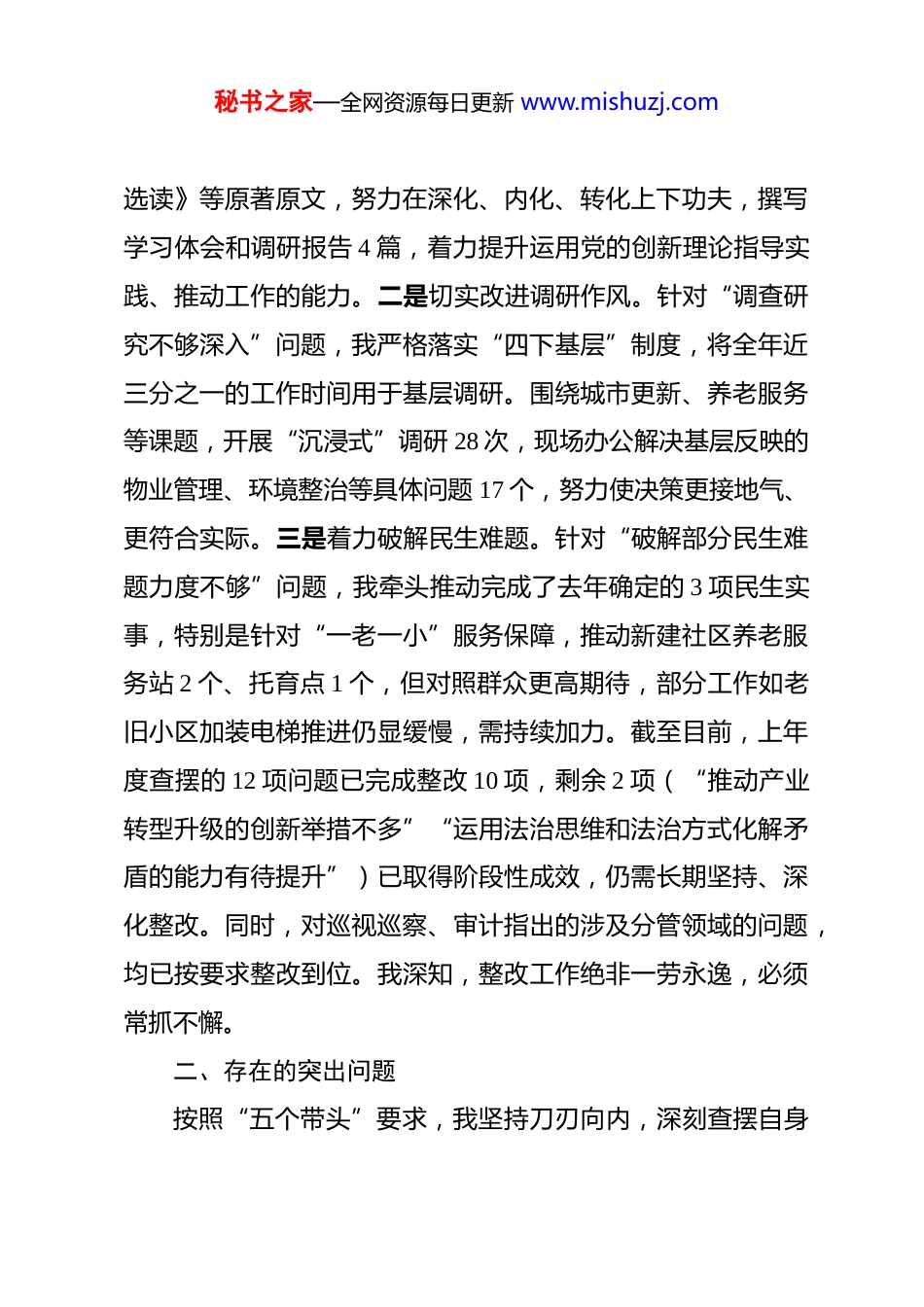 秘书之家—全网资源每日更新 www.mishuzj.com区委常委、副区长 2025 年度民主生活会个人对照检查材料 根据中央、市委和区委关于开好 2025 年度民主生活会的统一部署和要求,我在深入学习习近平新时代中国特色社会主义思想、党的二十届四中全会精神以及党章党规党纪的基础上,紧密联系个人思想、工作和作风实际,通过群众提、自己找、上级点、互相帮等多种方式,广泛征求了意见建议,并与班子成员、分管部门负责同志开展了谈心谈话。围绕本次民主生活会主题,对照“五个带头”要求,结合上年度民主生活会整改落实情况和巡视巡察、审计反馈意见,进行了深刻的自我剖析。现将对照检查情况报告如下:一、上年度民主生活会查摆问题整改落实情况上年度民主生活会,我共查摆出理论学习系统性不强、调查研究“深、实、细、准、效”不足、破解部分民生难题力度不够等 6 个方面 12 项具体问题。一年来,我始终将问题整改作为一项严肃的政治任务,制定个人整改台账,明确时限,逐项销号。一是持续强化理论武装。针对“理论学习系统性不强”问题,我坚持个人自学与集中研讨相结合,除参加区委理论学习中心组学习外,每周至少安排 3 小时系统学习《习近平著作秘书之家—全网资源每日更新 www.mishuzj.com选读》等原著原文,努力在深化、内化、转化上下功夫,撰写学习体会和调研报告 4 篇,着力提升运用党的创新理论指导实践、推动工作的能力。二是切实改进调研作风。针对“调查研究不够深入”问题,我严格落实“四下基层”制度,将全年近三分之一的工作时间用于基层调研。围绕城市更新、养老服务等课题,开展“沉浸式”调研 28 次,现场办公解决基层反映的物业管理、环境整治等具体问题 17 个,努力使决策更接地气、更符合实际。三是着力破解民生难题。针对“破解部分民生难题力度不够”问题,我牵头推动完成了去年确定的 3 项民生实事,特别是针对“一老一小”服务保障,推动新建社区养老服务站 2 个、托育点 1 个,但对照群众更高期待,部分工作如老旧小区加装电梯推进仍显缓慢,需持续加力。截至目前,上年度查摆的 12 项问题已完成整改 10 项,剩余 2 项(“推动产业转型升级的创新举措不多”“运用法治思维和法治方式化解矛盾的能力有待提升”)已取得阶段性成效,仍需长期坚持、深化整改。同时,对巡视巡察、审计指出的涉及分管领域的问题,均已按要求整改到位。我深知,整改工作绝非一劳永逸,必须常抓不懈。二、存在的突出问题按照“五个带头”要求,我坚持刀刃向内,深刻查摆自身秘书之家—全网资源每日更新 www.mishuzj.com存在的差距和不足。(一)在“带头强化政治忠诚、提高政治能力”方面。一是政治判断力的敏锐性有待加强。有时对复杂形势下的风险挑战,特别是意识形态领域的潜在风险,预见性和洞察力还不够强。比如,对网络空间中可能影响区域稳定的苗头性、倾向性问题,有时敏感度不足,未能第一时间组织研判并采取有效引导措施。二是政治领悟力的深度有待拓展。对党的二十届四中全会提出的一系列新思想新论断,特别是关于中国式现代化的本质要求的理解,有时还停留在字面认知,如何将其创造性地转化为推动西青区高质量发展的具体路径和举措,思考谋划不够深入,存在“上下一般粗”的现象。三是政治执行力的刚性有待提升。虽然能够坚决贯彻党中央决策部署和市委、区委工作要求,但在面对一些难度大、周期长的任务时,有时存在“闯关”思想,缺乏钉钉子精神和一抓到底的韧劲。例如,在推动某项市级重点工程征地拆迁扫尾工作时,面对个别“硬骨头”,未能持续投入足够精力攻坚,导致项目进度一度滞后。(二)在“带头固本培元、增强党性”方面。一是理论武装的“温差”依然存在。虽然能够坚持学习,但有时满足于“学过了”“读过了”,距离学思用贯通、知信行统一还有差距。比如,对习近平新时代中国特色社会主义思想中蕴含的立秘书之家—全网资源每日更新 www.mishuzj.com场、观点、方法,掌握运用不够娴熟,用以改造主观世界、解决党性修养深层次问题的效果不够明显。二是党性锤炼的“自觉”有所减弱。随着职务提升和工作繁忙,有时不自觉地...