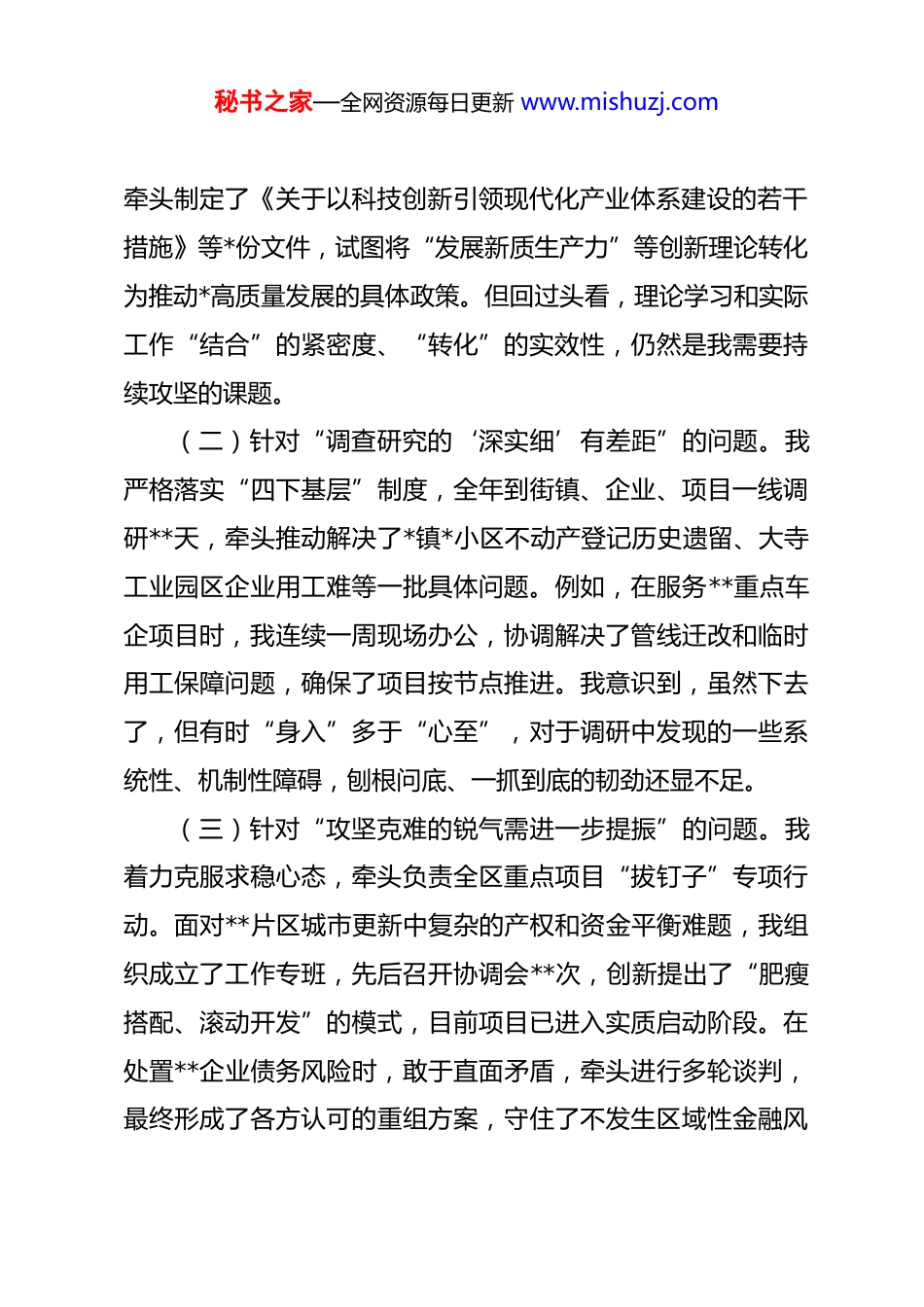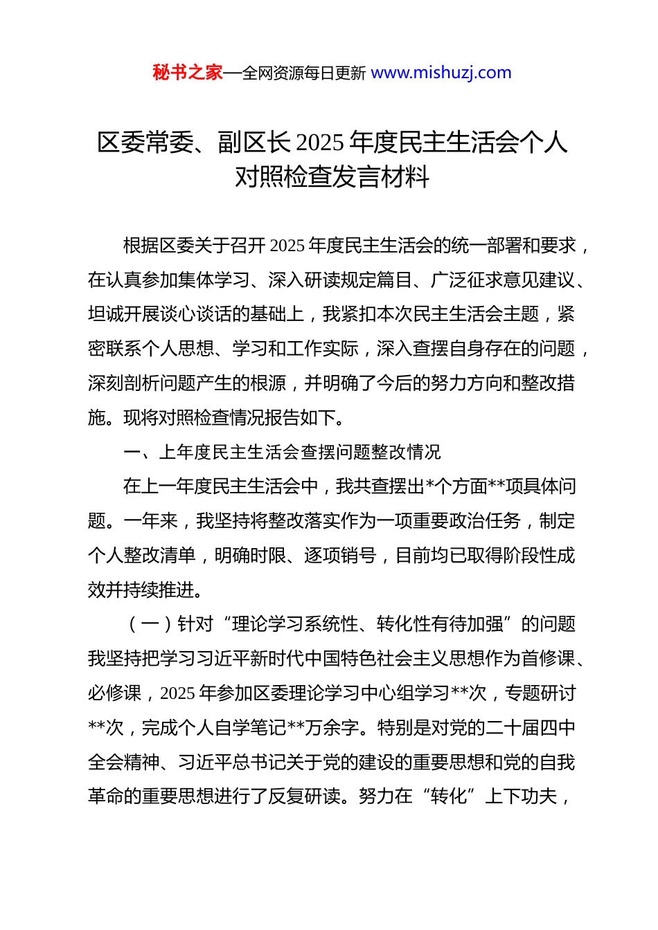 秘书之家—全网资源每日更新 www.mishuzj.com区委常委、副区长 2025 年度民主生活会个人对照检查发言材料 根据区委关于召开 2025 年度民主生活会的统一部署和要求,在认真参加集体学习、深入研读规定篇目、广泛征求意见建议、坦诚开展谈心谈话的基础上,我紧扣本次民主生活会主题,紧密联系个人思想、学习和工作实际,深入查摆自身存在的问题,深刻剖析问题产生的根源,并明确了今后的努力方向和整改措施。现将对照检查情况报告如下。一、上年度民主生活会查摆问题整改情况在上一年度民主生活会中,我共查摆出*个方面**项具体问题。一年来,我坚持将整改落实作为一项重要政治任务,制定个人整改清单,明确时限、逐项销号,目前均已取得阶段性成效并持续推进。(一)针对“理论学习系统性、转化性有待加强”的问题我坚持把学习习近平新时代中国特色社会主义思想作为首修课、必修课,2025 年参加区委理论学习中心组学习**次,专题研讨**次,完成个人自学笔记**万余字。特别是对党的二十届四中全会精神、习近平总书记关于党的建设的重要思想和党的自我革命的重要思想进行了反复研读。努力在“转化”上下功夫,秘书之家—全网资源每日更新 www.mishuzj.com牵头制定了《关于以科技创新引领现代化产业体系建设的若干措施》等*份文件,试图将“发展新质生产力”等创新理论转化为推动*高质量发展的具体政策。但回过头看,理论学习和实际工作“结合”的紧密度、“转化”的实效性,仍然是我需要持续攻坚的课题。(二)针对“调查研究的‘深实细’有差距”的问题。我严格落实“四下基层”制度,全年到街镇、企业、项目一线调研**天,牵头推动解决了*镇*小区不动产登记历史遗留、大寺工业园区企业用工难等一批具体问题。例如,在服务**重点车企项目时,我连续一周现场办公,协调解决了管线迁改和临时用工保障问题,确保了项目按节点推进。我意识到,虽然下去了,但有时“身入”多于“心至”,对于调研中发现的一些系统性、机制性障碍,刨根问底、一抓到底的韧劲还显不足。(三)针对“攻坚克难的锐气需进一步提振”的问题。我着力克服求稳心态,牵头负责全区重点项目“拔钉子”专项行动。面对**片区城市更新中复杂的产权和资金平衡难题,我组织成立了工作专班,先后召开协调会**次,创新提出了“肥瘦搭配、滚动开发”的模式,目前项目已进入实质启动阶段。在处置**企业债务风险时,敢于直面矛盾,牵头进行多轮谈判,最终形成了各方认可的重组方案,守住了不发生区域性金融风秘书之家—全网资源每日更新 www.mishuzj.com险的底线。这个过程让我深刻体会到,担当作为不仅需要勇气,更需要智慧和法治思维。(四)针对“履行‘一岗双责’压力传导存在递减”的问题。我定期与分管部门“一把手”开展廉政谈话,年内共谈话**人次。在分管领域开展了工程建设、国资监管等专项廉政风险排查,推动新建和完善制度*项。对发现的一些苗头性倾向性问题,如个别部门在服务企业中存在的“微笑不办事”现象,进行了严肃批评并督促整改。同时,我也更严格地约束自身和家属,全年按规定报告了个人有关事项,净化社交圈、生活圈、朋友圈。我深知,管党治党责任重于泰山,必须时刻拧紧发条。二、存在的问题对照本次民主生活会“五个带头”的要求,结合征求到的意见建议,我把自己摆进去、把职责摆进去、把工作摆进去,深刻反思,仍发现以下突出问题:(一)在带头强化政治忠诚、提高政治能力方面。一是政治“判断力”的敏锐性有待加强。能够自觉在思想上政治上行动上同党中央保持高度一致,坚决执行市委、区委决策部署,但有时从政治高度观察、分析和处理经济与社会问题的意识不够强。例如,在推动招商引资工作中,更多关注了项目的投资规模、税收贡献,对项目可能带来的产业结构调整、就业结构秘书之家—全网资源每日更新 www.mishuzj.com变化乃至潜在的社会治理影响,从政治和战略层面进行的前瞻性评估不够深入。面对当前复杂严峻的经济形势,有时过于聚焦短期经济指标波动,对其中蕴含的政治风险和意识形态风险,洞察和预见不够及时。二是政治“执行力”的穿透性有待提升。对党中央的大政方针和上级部署...