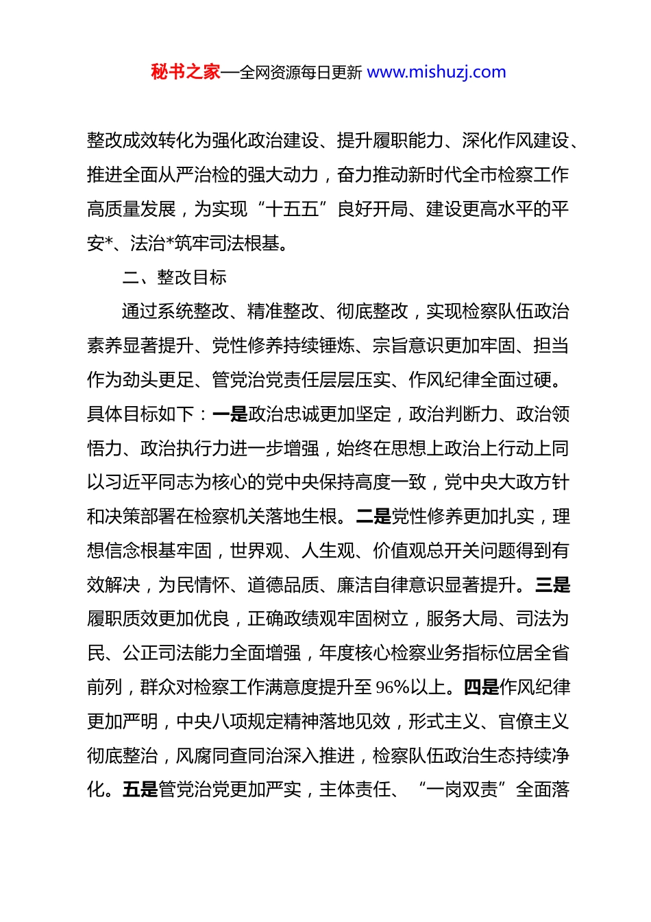 秘书之家—全网资源每日更新 www.mishuzj.com市检察院 2025 年度民主生活会查摆问题整改方案 根据市委关于民主生活会整改工作的统一部署,市检察院党组紧扣 2025 年度民主生活会主题,深入查摆自身存在的突出问题,广泛征求各方意见建议,深刻剖析问题根源,明确整改方向与举措。为切实做好民主生活会“后半篇文章”,推动整改工作落地见效、常态长效,不断提升检察工作质效和队伍建设水平,为全市经济社会高质量发展提供坚强司法保障,特制定本方案。一、指导思想以习近平新时代中国特色社会主义思想为指导,全面贯彻党的二十大和二十届历次全会精神,深入学习贯彻习近平法治思想、习近平总书记关于政法工作、检察工作的重要指示批示精神,深刻领悟“两个确立”的决定性意义,增强“四个意识”、坚定“四个自信”、做到“两个维护”。坚持党对检察工作的绝对领导,牢牢把握检察机关政治属性、人民属性、法治属性,以此次民主生活会整改为契机,聚焦问题导向、目标导向、结果导向相统一,以刀刃向内的自我革命精神狠抓问题整改。紧扣全市发展大局,忠实履行宪法法律赋予的职责,把秘书之家—全网资源每日更新 www.mishuzj.com整改成效转化为强化政治建设、提升履职能力、深化作风建设、推进全面从严治检的强大动力,奋力推动新时代全市检察工作高质量发展,为实现“十五五”良好开局、建设更高水平的平安*、法治*筑牢司法根基。二、整改目标通过系统整改、精准整改、彻底整改,实现检察队伍政治素养显著提升、党性修养持续锤炼、宗旨意识更加牢固、担当作为劲头更足、管党治党责任层层压实、作风纪律全面过硬。具体目标如下:一是政治忠诚更加坚定,政治判断力、政治领悟力、政治执行力进一步增强,始终在思想上政治上行动上同以习近平同志为核心的党中央保持高度一致,党中央大政方针和决策部署在检察机关落地生根。二是党性修养更加扎实,理想信念根基牢固,世界观、人生观、价值观总开关问题得到有效解决,为民情怀、道德品质、廉洁自律意识显著提升。三是履职质效更加优良,正确政绩观牢固树立,服务大局、司法为民、公正司法能力全面增强,年度核心检察业务指标位居全省前列,群众对检察工作满意度提升至 96%以上。四是作风纪律更加严明,中央八项规定精神落地见效,形式主义、官僚主义彻底整治,风腐同查同治深入推进,检察队伍政治生态持续净化。五是管党治党更加严实,主体责任、“一岗双责”全面落秘书之家—全网资源每日更新 www.mishuzj.com实,制度笼子扎紧织密,监督执纪问责刚性增强,锻造忠诚干净担当的检察铁军。六是整改长效机制更加健全,实现“当下改”与“长久立”有机结合,问题不反弹、整改不松劲,以整改实效推动检察工作持续迈上新台阶。三、整改措施(一)在带头强化政治忠诚,提高政治能力方面针对政治能力与检察履职融合不够紧密、政治部署落实不够精准、政治敏锐性有待提升等问题,结合市检察院主要负责人职责,制定以下整改措施:1.铸牢政治根基,深化理论武装提质效坚持把政治理论学习作为首要政治任务,牵头完善党组理论学习中心组学习制度,每月开展 1 次集中学习研讨,每季度组织 1 次专题辅导,全年累计学习时长不少于 80 学时,带头撰写心得体会不少于 6 篇。聚焦习近平新时代中国特色社会主义思想、习近平法治思想等核心内容,建立“领学+研学+践学”三位一体学习机制,带头领学宣讲不少于 4 次,推动理论学习从“学过”向“学深悟透”转变。将政治理论学习与检察业务深度融合,把学习成果转化为破解司法办案难题、服务大局发展的具体举措,每季度主持召开 1 次理论学习与业务工作融合推进会,梳理解决融合过程中存在的 3—5 个突出问题,确秘书之家—全网资源每日更新 www.mishuzj.com保理论武装真正服务于检察履职实践,切实以理论清醒保证政治坚定。2.强化政治担当,推动决策部署落到位牢固树立“一盘棋”思想,牵头建立党中央大政方针和上级决策部署落实台账,对涉及检察工作的重大部署实行清单化管理、项目化推进,明确责任分工、时间节点和质量标准,每月调度 1 次落实情况,每半年开展 1 次专项督查,确保...