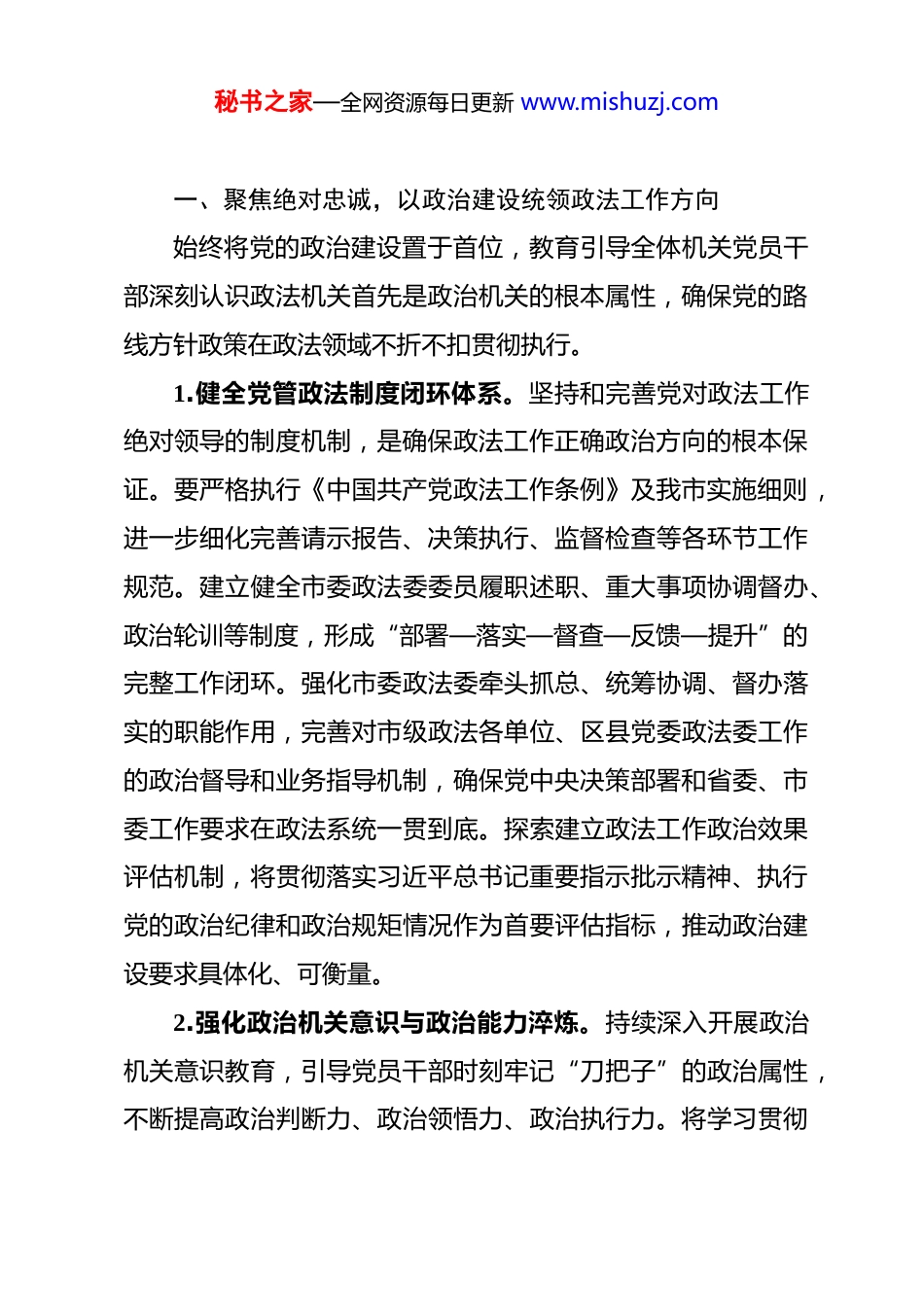 秘书之家—全网资源每日更新 www.mishuzj.com市委政法委 2026 年机关党建工作要点 2026 年市委政法委机关党建工作的指导思想是:坚持以习近平新时代中国特色社会主义思想为根本遵循,深入贯彻党的二十大、二十届四中全会精神及中央纪委五次全会部署,全面落实习近平总书记关于党的建设的重要思想、关于政法工作系列重要指示批示精神。牢牢把握“政法姓党”根本政治属性,以坚定拥护“两个确立”、坚决做到“两个维护”为最高政治原则。锚定“十五五”规划开局之年目标任务,聚焦高质量发展首要任务,围绕中心、服务大局,将党的绝对领导贯穿政法工作各方面全过程。以政治建设为统领,以思想建设为基础,以组织建设为支撑,以能力建设为关键,以作风建设为保障,以制度建设为根本,持续深化模范机关创建,着力提升机关党组织政治功能和组织功能,锻造忠诚干净担当的政法铁军。推动机关党建与政法业务深度融合、相互促进,为奋力推进政法工作现代化,建设更高水平的平安城市、法治城市,服务保障全市经济社会高质量发展提供坚强政治引领和组织保证。为深入贯彻落实新时代党的建设总要求,以高质量机关党建保障政法工作现代化,现制定市委政法委 2026 年机关党建工作要点如下。秘书之家—全网资源每日更新 www.mishuzj.com一、聚焦绝对忠诚,以政治建设统领政法工作方向始终将党的政治建设置于首位,教育引导全体机关党员干部深刻认识政法机关首先是政治机关的根本属性,确保党的路线方针政策在政法领域不折不扣贯彻执行。1.健全党管政法制度闭环体系。坚持和完善党对政法工作绝对领导的制度机制,是确保政法工作正确政治方向的根本保证。要严格执行《中国共产党政法工作条例》及我市实施细则,进一步细化完善请示报告、决策执行、监督检查等各环节工作规范。建立健全市委政法委委员履职述职、重大事项协调督办、政治轮训等制度,形成“部署—落实—督查—反馈—提升”的完整工作闭环。强化市委政法委牵头抓总、统筹协调、督办落实的职能作用,完善对市级政法各单位、区县党委政法委工作的政治督导和业务指导机制,确保党中央决策部署和省委、市委工作要求在政法系统一贯到底。探索建立政法工作政治效果评估机制,将贯彻落实习近平总书记重要指示批示精神、执行党的政治纪律和政治规矩情况作为首要评估指标,推动政治建设要求具体化、可衡量。2.强化政治机关意识与政治能力淬炼。持续深入开展政治机关意识教育,引导党员干部时刻牢记“刀把子”的政治属性,不断提高政治判断力、政治领悟力、政治执行力。将学习贯彻秘书之家—全网资源每日更新 www.mishuzj.com习近平总书记最新重要讲话和重要指示批示精神作为“第一议题”,健全传达学习、研究部署、督促检查、跟踪问效的全链条落实机制。组织开展“筑牢政治忠诚、践行使命担当”系列主题活动,通过专题研讨、政治培训、岗位实践等多种形式,引导干部善于从政治高度观察、分析和处理政法领域各类问题。严明党的政治纪律和政治规矩,坚决反对“七个有之”,自觉做到“五个必须”,严肃查处违反政治纪律的行为,引导党员干部做政治上的“明白人”“老实人”,确保政法队伍绝对忠诚、绝对纯洁、绝对可靠。3.深化政治监督与重大决策部署落实。将政治监督贯穿于政法工作全过程,确保党的理论和路线方针政策在政法机关落地生根。聚焦贯彻总体国家安全观、维护国家政治安全、推进扫黑除恶常态化、深化政法领域改革、优化法治化营商环境等党中央重大决策部署,以及省委、市委确定的政法重点工作,建立专项政治监督清单。综合运用听取汇报、列席会议、专项检查、谈话提醒等方式,加强对机关各支部、各处室履职尽责情况的监督,重点检查是否存在做选择、搞变通、打折扣等问题。推动政治监督与执法监督、纪律监督、日常监督贯通协调,形成监督合力,确保执行不偏向、不变通、不走样,以强有力的政治监督保障政法工作始终沿着正确方向前进。秘书之家—全网资源每日更新 www.mishuzj.com4.严肃党内政治生活锤炼党性。严格执行《关于新形势下党内政治生活的若干准则》,着力增强党内政治生活的政治性、时代性、原则性、战斗性。高质量召开...