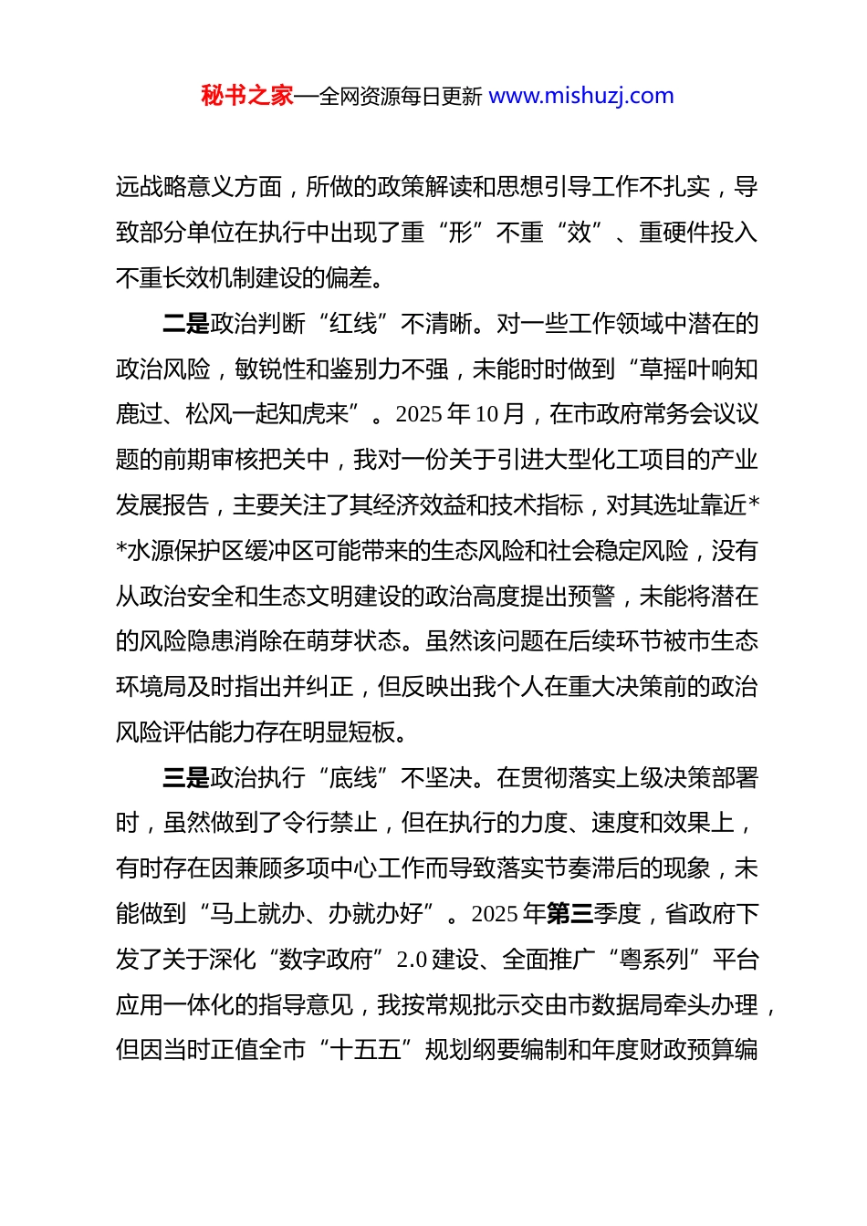 秘书之家—全网资源每日更新 www.mishuzj.com市政府秘书长 2025 年度民主生活会的个人对照检查材料 根据市委关于召开 2025 年度民主生活会的统一部署和要求,我紧扣主题,在深入开展学习研讨、广泛征求意见建议、坦诚进行谈心谈话的基础上,围绕“五个带头”方面,把自己摆进去、把职责摆进去、把工作摆进去,深入查摆了自身存在的问题,深刻剖析了问题根源,明确了今后的努力方向和整改措施。现将个人对照检查情况报告如下。一、存在的问题(一)在带头强化政治忠诚、提高政治能力方面一是政治领悟“高线”不稳固。在领会和把握党中央大政方针上,有时未能完全做到从政治高度和战略全局上进行深层次思考。在工作中,将更多精力投入到了如何高效完成具体任务的“术”的层面,而在深刻领悟上级决策部署背后蕴含的政治意图、战略考量等“道”的层面,钻研不够深入。例如,在统筹推进“百千万工程”过程中,我所牵头协调的市政府办公室系统,在 2025 年上半年主要精力集中于督办各项目开工率、投资完成额等量化指标,但在如何引导各部门深刻理解并贯彻工程背后所蕴含的破解城乡二元结构、促进区域协调发展的深秘书之家—全网资源每日更新 www.mishuzj.com远战略意义方面,所做的政策解读和思想引导工作不扎实,导致部分单位在执行中出现了重“形”不重“效”、重硬件投入不重长效机制建设的偏差。二是政治判断“红线”不清晰。对一些工作领域中潜在的政治风险,敏锐性和鉴别力不强,未能时时做到“草摇叶响知鹿过、松风一起知虎来”。2025 年 10 月,在市政府常务会议议题的前期审核把关中,我对一份关于引进大型化工项目的产业发展报告,主要关注了其经济效益和技术指标,对其选址靠近**水源保护区缓冲区可能带来的生态风险和社会稳定风险,没有从政治安全和生态文明建设的政治高度提出预警,未能将潜在的风险隐患消除在萌芽状态。虽然该问题在后续环节被市生态环境局及时指出并纠正,但反映出我个人在重大决策前的政治风险评估能力存在明显短板。三是政治执行“底线”不坚决。在贯彻落实上级决策部署时,虽然做到了令行禁止,但在执行的力度、速度和效果上,有时存在因兼顾多项中心工作而导致落实节奏滞后的现象,未能做到“马上就办、办就办好”。2025 年第三季度,省政府下发了关于深化“数字政府”2.0 建设、全面推广“粤系列”平台应用一体化的指导意见,我按常规批示交由市数据局牵头办理,但因当时正值全市“十五五”规划纲要编制和年度财政预算编秘书之家—全网资源每日更新 www.mishuzj.com制的关键期,我未能持续跟踪督办,导致我市的实施方案直到12 月底才正式出台,相比珠三角兄弟城市普遍晚了一个季度,错失了部分试点政策的先机。(二)在带头固本培元、增强党性方面一是理论学习“钻进去”不深入。对习近平新时代中国特色社会主义思想的学习,满足于读原著、学原文,但在悟原理、求真经上下的功夫不深,未能完全做到知其然、知其所以然,更知其所以必然。特别是对党的二十届四中全会关于“十五五”规划的系列新思想、新论断,学习理解多停留在政策解读和具体指标层面,对其背后蕴含的世界观和方法论思考不透彻。在 2025 年 11 月的一次市政府工作务虚会上,我围绕“十五五”开局谈工作思路,罗列了多项经济社会发展预期目标,但未能从新发展格局、全过程人民民主、国家治理体系现代化等更高维度,系统阐述这些目标之间的内在逻辑和理论支撑,发言的理论深度和思想站位不高。二是党性锤炼“融进去”不自觉。在日常工作中,习惯于运用行政手段、依靠工作机制来解决问题、推动工作,未能时时事事自觉用党性原则来衡量、审视和规范自己的言行。三是价值追求“立起来”不牢固。世界观、人生观、价值观这个“总开关”拧得不紧,在政绩观上仍有偏差,潜意识里秘书之家—全网资源每日更新 www.mishuzj.com存在重显绩、轻潜绩,重当前、轻长远的倾向。作为政府“大管家”,我高度关注全市各项经济指标的排名变化,对于能够迅速提升城市形象、带来短期效益的大项目、大工程,投入的协调精力和督办力度相对更大。相比之下,对于一些关乎城市长远发展但短期...