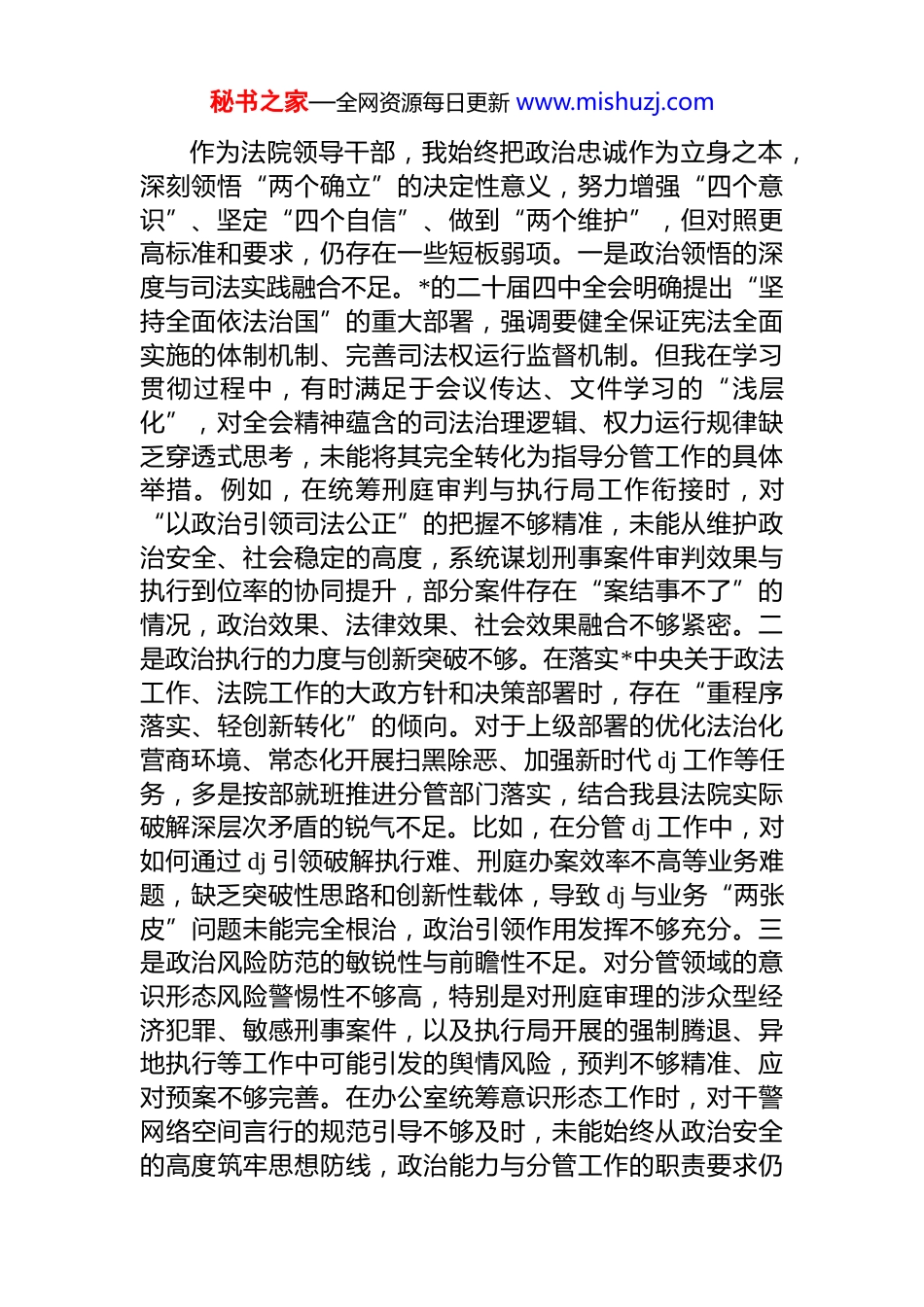 秘书之家—全网资源每日更新 www.mishuzj.com县法院副院长 2025 年度民主生活会对照检查材料汇编(2 篇)目录1.xx 县法院副院长 2025 年度民主生活会对照检查材料............................................................................22.xx 县法院副院长 2025 年度民主生活会对照检查材料..........................................................................18xx 县法院副院长 2025 年度民主生活会对照检查材料根据中央、省委、市委及上级法院关于开好 2025 年度民主生活会的统一部署,紧扣本次会议主题,本人聚焦深入学习贯彻**************思想和*的二十届四中全会精神,以深入贯彻中央八项规定精神学习教育为重要抓手,紧密结合分管 dj、刑庭、执行局、办公室等工作实际,通过深化学习研讨、广泛征求意见、深入谈心谈话、开展自查自纠等方式,全面检视自身存在的问题,深刻剖析根源症结明确整改方向措施。现将对照检查情况报告如下,恳请各位同志批评指正。一、存在的主要问题(一)在带头强化政治忠诚、提高政治能力方面秘书之家—全网资源每日更新 www.mishuzj.com作为法院领导干部,我始终把政治忠诚作为立身之本,深刻领悟“两个确立”的决定性意义,努力增强“四个意识”、坚定“四个自信”、做到“两个维护”,但对照更高标准和要求,仍存在一些短板弱项。一是政治领悟的深度与司法实践融合不足。*的二十届四中全会明确提出“坚持全面依法治国”的重大部署,强调要健全保证宪法全面实施的体制机制、完善司法权运行监督机制。但我在学习贯彻过程中,有时满足于会议传达、文件学习的“浅层化”,对全会精神蕴含的司法治理逻辑、权力运行规律缺乏穿透式思考,未能将其完全转化为指导分管工作的具体举措。例如,在统筹刑庭审判与执行局工作衔接时,对“以政治引领司法公正”的把握不够精准,未能从维护政治安全、社会稳定的高度,系统谋划刑事案件审判效果与执行到位率的协同提升,部分案件存在“案结事不了”的情况,政治效果、法律效果、社会效果融合不够紧密。二是政治执行的力度与创新突破不够。在落实*中央关于政法工作、法院工作的大政方针和决策部署时,存在“重程序落实、轻创新转化”的倾向。对于上级部署的优化法治化营商环境、常态化开展扫黑除恶、加强新时代 dj 工作等任务,多是按部就班推进分管部门落实,结合我县法院实际破解深层次矛盾的锐气不足。比如,在分管 dj 工作中,对如何通过 dj 引领破解执行难、刑庭办案效率不高等业务难题,缺乏突破性思路和创新性载体,导致 dj 与业务“两张皮”问题未能完全根治,政治引领作用发挥不够充分。三是政治风险防范的敏锐性与前瞻性不足。对分管领域的意识形态风险警惕性不够高,特别是对刑庭审理的涉众型经济犯罪、敏感刑事案件,以及执行局开展的强制腾退、异地执行等工作中可能引发的舆情风险,预判不够精准、应对预案不够完善。在办公室统筹意识形态工作时,对干警网络空间言行的规范引导不够及时,未能始终从政治安全的高度筑牢思想防线,政治能力与分管工作的职责要求仍秘书之家—全网资源每日更新 www.mishuzj.com有差距。(二)在带头固本培元、增强*性方面我始终坚持把政治修养摆在*性修养首位,自觉用**************思想凝心铸魂,但对照*章*规 dj 和共产*人精神追求,仍存在*性锤炼不够扎实的问题。一是理论学习的系统性与实践性脱节。学习《***谈治国理政》《中国共产*章程》等重要内容时,存在“选择性学习”倾向,对法治建设、全面从严治*等与分管工作直接相关的篇章关注较多,对其他篇章蕴含的立场观点方法学习领会不够全面深入。运用***法治思想指导解决实际问题的能力不足,例如在指导刑庭办理新型犯罪案件时,对“坚持以人民为中心”的发展思想践行不够到位,有时更多聚焦于案件法律适用的准确性,对被害人权益保护、矛盾纠纷源头化解的思考不够深入;在分管 dj 工作中,对如何通过理论学习破解干警理想信念弱化问题,缺乏有效路径,学习成果转化为工作实效的比例偏低。二是*性锻炼的主动性与自觉性弱化。随着职务提升和事务性工作增多,不自觉...