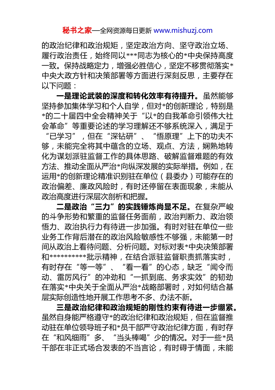 秘书之家—全网资源每日更新 www.mishuzj.com县纪委派驻县委办纪检监察组组长 2025 年度民主生活会对照检查材料汇编(2 篇)目录1.xx 县纪委派驻县委办纪检监察组组长 2025 年度民主生活会对照检查材料...............................................22.xx 县纪委派驻县委办纪检监察组组长 2025 年度民主生活会对照检查材料.............................................17xx 县纪委派驻县委办纪检监察组组长 2025年度民主生活会对照检查材料根据本次民主生活会的要求,本人在深入学习*的二十届四中全会精神、******关于深入贯彻中央八项规定精神学习教育的****精神,以及*章*规 dj 的基础上,紧扣会议主题,对照“五个带头”要求,结合思想、学习和工作实际,广泛征求意见建议,深入进行谈心谈话,全面查摆自身存在的问题,深刻剖析问题根源,并明确了今后的努力方向和整改措施。现将对照检查情况报告如下:一、存在的主要问题(一)在带头强化政治忠诚、提高政治能力方面对照深刻领悟“两个确立”的决定性意义,增强“四个意识”、坚定“四个自信”、做到“两个维护”,严守*秘书之家—全网资源每日更新 www.mishuzj.com的政治纪律和政治规矩,坚定政治方向、坚守政治立场、履行政治责任,始终同以***同志为核心的*中央保持高度一致。保持战略定力,增强必胜信心,坚定不移贯彻落实*中央大政方针和决策部署等方面进行深刻反思,主要存在以下问题:一是理论武装的深度和转化效率有待提升。虽然能够坚持参加集体学习和个人自学,但对*的创新理论,特别是*的二十届四中全会精神关于“以*的自我革命引领伟大社会革命”等重要论述的学习理解还不够系统深入,满足于“已学习”,但在“深钻研”、“悟原理”上下的功夫不够,未能完全将其中蕴含的立场、观点、方法,娴熟地转化为谋划派驻监督工作的具体思路、破解监督难题的有效方法、推动全面从严治*向纵深发展的实际举措。例如,在运用*的创新理论精准识别驻在单位(县委办)可能存在的政治偏差、廉政风险时,有时还停留在表面现象,未能从政治高度进行深层次剖析和把握。二是政治“三力”的实践锤炼尚显不足。在复杂严峻的斗争形势和繁重的监督任务面前,政治判断力、政治领悟力、政治执行力有待进一步加强。有时对驻在单位一些业务工作背后潜在的政治风险敏感性不够强,未能第一时间从政治上看待问题、分析问题。对标对表*中央决策部署和**********批示精神,在结合派驻监督职责抓落实时,有时存在“等一等”、“看一看”的心态,缺乏“闻令而动、雷厉风行”的冲劲和“一抓到底、务求实效”的韧劲在落实*中央关于全面从严治*战略部署时,对如何结合基层实际创造性地开展工作思考不多、办法不新。三是政治纪律和政治规矩的刚性约束有待进一步绷紧。虽然自身能严格遵守*的政治纪律和政治规矩,但在监督推动驻在单位领导班子和*员干部严守政治纪律方面,有时存在“和风细雨”多、“当头棒喝”少的情况。对于一些*员干部在非正式场合发表的不当言论,有时碍于情面,未能秘书之家—全网资源每日更新 www.mishuzj.com及时、严肃地予以提醒和纠正,政治监督的“探头”作用和“前哨”功能发挥不够充分。四是战略定力和必胜信心的传导不够有力。面对经济社会发展中的困难挑战和反腐败斗争“永远在路上”的长期性、复杂性,自身能够保持定力,但在教育引导驻在单位*员干部保持战略清醒、增强斗争精神方面,方式方法较为单一,说服力和感染力不强,未能将*中央的坚定决心和战略自信有效转化为全体*员干部的共同意志和自觉行动。(二)在带头固本培元、增强*性方面对照坚持把政治修养摆在*性修养的首位,自觉以**************思想凝心铸魂,坚守共产*人精神追求,解决好世界观、人生观、价值观总开关问题。认真学习*章*规dj,始终用*性原则正心明道、修身律己,坚定理想信念、筑牢对*忠诚、厚植为民情怀、纯正道德品质、保持清正廉洁等方面进行深刻反思,主要存在以下问题:一是*性修养的自觉性和主动性有所弱化。随着工作年限增长和岗位变化,有时不自觉地放松了*性锻炼的主动性,认为自己是纪检监察干部,*性原则自然比别人...