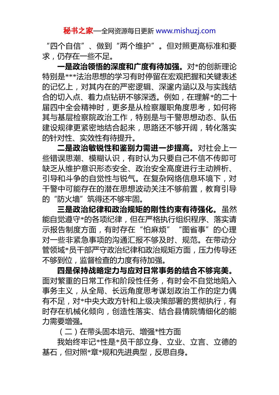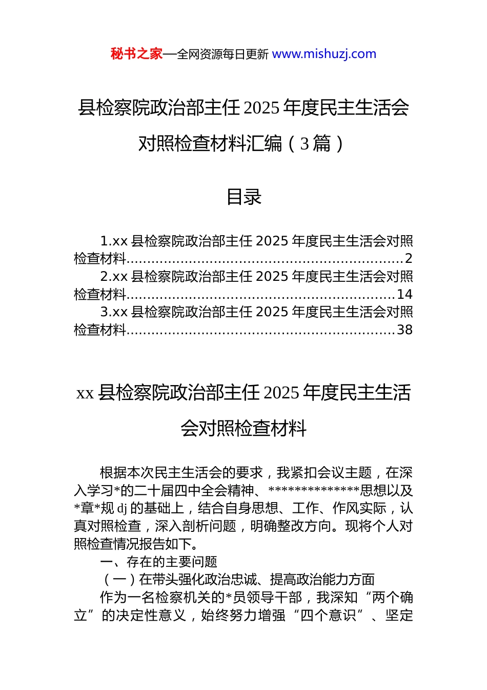 秘书之家—全网资源每日更新 www.mishuzj.com县检察院政治部主任 2025 年度民主生活会对照检查材料汇编(3 篇)目录1.xx 县检察院政治部主任 2025 年度民主生活会对照检查材料..................................................................22.xx 县检察院政治部主任 2025 年度民主生活会对照检查材料................................................................143.xx 县检察院政治部主任 2025 年度民主生活会对照检查材料................................................................38xx 县检察院政治部主任 2025 年度民主生活会对照检查材料根据本次民主生活会的要求,我紧扣会议主题,在深入学习*的二十届四中全会精神、**************思想以及*章*规 dj 的基础上,结合自身思想、工作、作风实际,认真对照检查,深入剖析问题,明确整改方向。现将个人对照检查情况报告如下。一、存在的主要问题(一)在带头强化政治忠诚、提高政治能力方面作为一名检察机关的*员领导干部,我深知“两个确立”的决定性意义,始终努力增强“四个意识”、坚定秘书之家—全网资源每日更新 www.mishuzj.com“四个自信”、做到“两个维护”。但对照更高标准和要求,仍存在一些不足。一是政治领悟的深度和广度有待加强。对*的创新理论特别是***法治思想的学习有时停留在宏观把握和关键表述的记忆上,对其内在的严密逻辑、深邃内涵以及与实践结合的切入点、着力点钻研不够深透。例如,在理解*的二十届四中全会精神时,更多是从检察履职角度思考,如何将其与基层检察院政治工作,特别是与干警思想动态、队伍建设规律更紧密地结合起来,思路还不够开阔,转化落实的针对性、实效性有待提升。二是政治敏锐性和鉴别力需进一步提高。对社会上一些错误思潮、模糊认识,有时认为只要自己不信不传即可缺乏从维护意识形态安全、政治安全高度进行主动辨析、引导和斗争的自觉性与锐气。在复杂网络信息环境下,对干警中可能存在的潜在思想波动关注不够前置,教育引导的“防火墙”筑得还不够牢固。三是政治纪律和政治规矩的刚性约束有待强化。虽然能自觉遵守*的各项纪律,但在严格执行组织程序、落实请示报告制度方面,有时存在“怕麻烦”“图省事”的心理对一些非紧急事项的沟通汇报不够及时、规范。在带动分管领域*员干部严守政治纪律和政治规矩方面,压力传导还不够到位,监督检查的力度有待加强。四是保持战略定力与应对日常事务的结合不够完美。面对繁重的日常工作和阶段性任务,有时会不自觉地陷入事务主义,从全局、长远角度思考谋划政治工作的定力偶有不足,对*中央大政方针和上级决策部署的贯彻执行,有时存在机械化倾向,创造性落实、结合县情院情细化的能力需要增强。(二)在带头固本培元、增强*性方面我始终牢记*性是*员干部立身、立业、立言、立德的基石,但对照*章*规和先进典型,反思自身。秘书之家—全网资源每日更新 www.mishuzj.com一是理论武装的自觉性和系统性有待提升。存在“以干代学”的现象,理论学习的主动挤劲、钻劲有所松懈,对**************思想的学习,有时满足于中心组安排和集体学习,个人静下心来研读原著、深入思考的时间相对不足,运用*的创新理论改造主观世界、解决*性修养方面深层次问题的效果不够显著。二是*性锤炼的主动性不够强。随着工作阅历增加,有时不自觉地放松了对*性修养的持续锤炼,艰苦奋斗、自我革命的精神有所弱化。运用批评与自我批评武器不够经常不够有力,在组织生活会上,有时对自身问题深挖不够,对同志的批评也存在“蜻蜓点水”、顾及情面的情况,未能完全达到“红脸出汗、排毒治病”的效果。三是理想信念的根基需持续加固。能够坚定共产主义远大理想和中国特色社会主义共同理想,但在面对现实生活中的一些复杂情况和负面现象时,有时会产生困惑感,需要用更强大的理论武装和更坚定的信仰来驱散迷雾。在引导青年干警筑牢信仰之基方面,方式方法有时较为传统吸引力和感染力有待增强。四是宗旨意识融入血脉、见诸行动有差距。虽然主观上坚持司法为民,但在具体工作中,深入基层一线、直面群众急难愁盼问题的频率和...