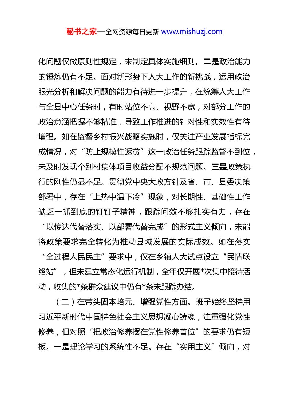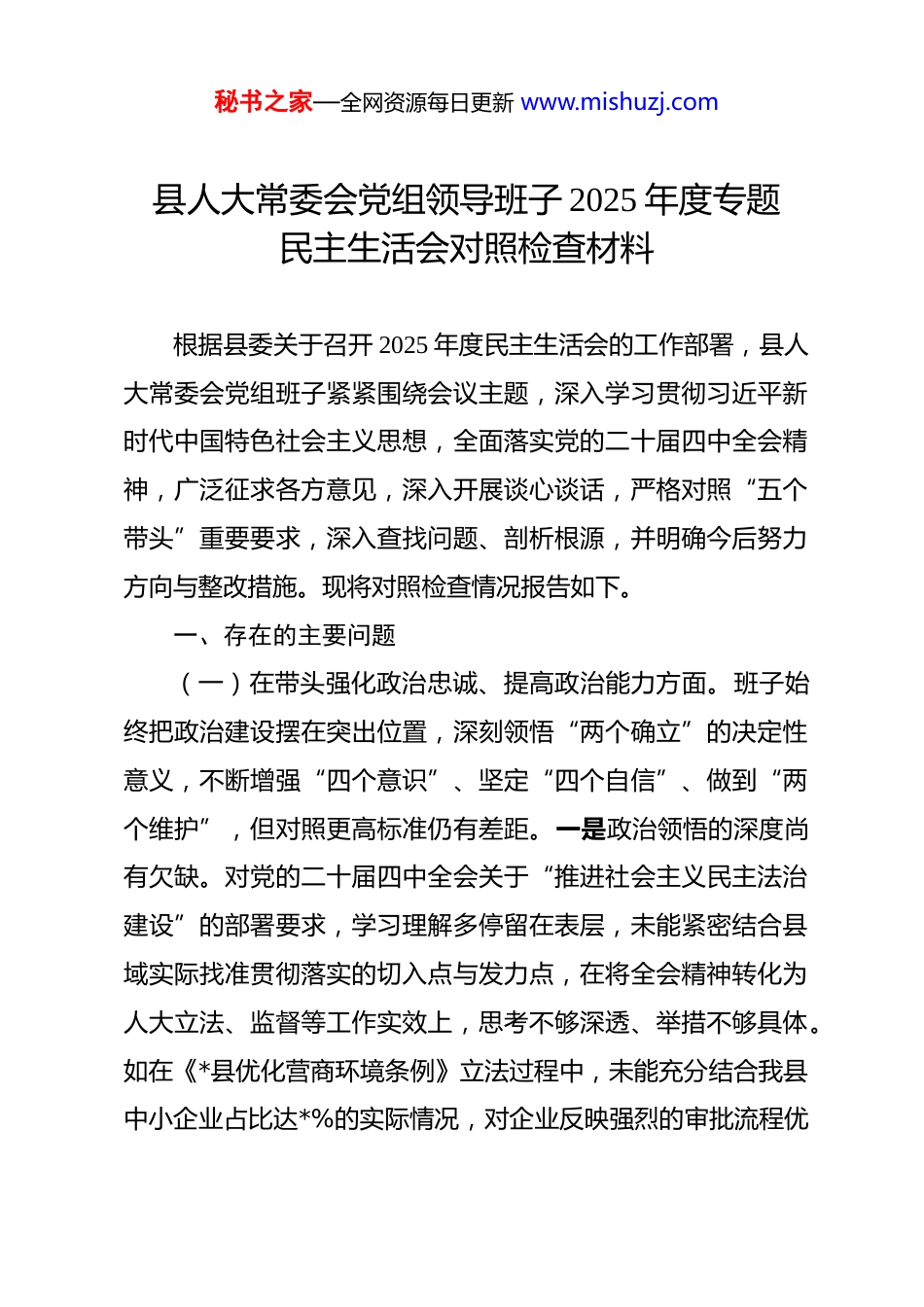 秘书之家—全网资源每日更新 www.mishuzj.com县人大常委会党组领导班子 2025 年度专题民主生活会对照检查材料 根据县委关于召开 2025 年度民主生活会的工作部署,县人大常委会党组班子紧紧围绕会议主题,深入学习贯彻习近平新时代中国特色社会主义思想,全面落实党的二十届四中全会精神,广泛征求各方意见,深入开展谈心谈话,严格对照“五个带头”重要要求,深入查找问题、剖析根源,并明确今后努力方向与整改措施。现将对照检查情况报告如下。一、存在的主要问题(一)在带头强化政治忠诚、提高政治能力方面。班子始终把政治建设摆在突出位置,深刻领悟“两个确立”的决定性意义,不断增强“四个意识”、坚定“四个自信”、做到“两个维护”,但对照更高标准仍有差距。一是政治领悟的深度尚有欠缺。对党的二十届四中全会关于“推进社会主义民主法治建设”的部署要求,学习理解多停留在表层,未能紧密结合县域实际找准贯彻落实的切入点与发力点,在将全会精神转化为人大立法、监督等工作实效上,思考不够深透、举措不够具体。如在《*县优化营商环境条例》立法过程中,未能充分结合我县中小企业占比达*%的实际情况,对企业反映强烈的审批流程优秘书之家—全网资源每日更新 www.mishuzj.com化问题仅做原则性规定,未制定具体实施细则。二是政治能力的锤炼仍有不足。面对新形势下人大工作的新挑战,运用政治眼光分析和解决问题的能力有待进一步提升,在统筹人大工作与全县中心任务时,有时站位不高、视野不宽,对部分工作的政治意涵把握不够精准,导致工作推进的针对性和实效性有待增强。如在监督乡村振兴战略实施时,仅关注产业发展指标完成情况,对“防止规模性返贫”这一政治任务跟踪监督不到位,未及时发现个别村集体项目收益分配不规范问题。三是政策执行的刚性仍显不足。贯彻党中央大政方针及省、市、县委决策部署中,存在“上热中温下冷”现象,对长期性、基础性工作缺乏一抓到底的钉钉子精神,跟踪问效不够扎实有力,存在“以传达代替落实、以部署代替完成”的形式主义倾向,未能将政策要求完全转化为推动县域发展的实际成效。如在落实“全过程人民民主”要求中,仅在乡镇人大试点设立“民情联络站”,但未建立常态化运行机制,全年仅开展*次集中接待活动,收集的*条群众建议中仍有*条未跟踪办结。(二)在带头固本培元、增强党性方面。班子始终坚持用习近平新时代中国特色社会主义思想凝心铸魂,注重强化党性修养,但对照“把政治修养摆在党性修养首位”的要求仍有短板。一是理论学习的系统性不足。存在“实用主义”倾向,对秘书之家—全网资源每日更新 www.mishuzj.com习近平新时代中国特色社会主义思想的学习缺乏全面系统的规划,多聚焦于与人大工作直接相关的内容,对经济、科技、生态等领域的重要论述学习不够深入,运用党的创新理论指导实践、破解难题的能力有待提升。如在审议县政府数字经济发展规划时,因对“新质生产力”理论学习不深,未能就我县传统制造业数字化转型提出针对性审议意见。二是党性锤炼的常态化不够。虽能按时参加“三会一课”、主题党日等组织生活,但部分活动形式单一、内容乏味,存在“走过场”现象。如今年开展的*次主题党日活动中,有*次仍以读文件、学讲话为主,未结合人大职能开展“立法为民”实践体验活动。班子成员主动强化党性锻炼的意识不够强烈,面对复杂问题时,运用党性原则正心明道、修身律己的自觉性有待进一步提升。三是理想信念的坚定不够牢固。面对工作中的困难与挑战,个别同志存在畏难情绪,缺乏“逢山开路、遇水架桥”的斗争精神,对共产党人的精神追求体悟不够深刻,未能始终以饱满的热情和坚定的信念投身人大事业。如在推进开发区人大代表工作室建设时,因担心协调难度大,项目启动时间比计划推迟*个月,影响代表联系企业功能发挥。(三)在带头敬畏人民、敬畏组织、敬畏法纪方面。班子始终坚持人民至上,严守组织纪律与法律法规,但对照“三个秘书之家—全网资源每日更新 www.mishuzj.com敬畏”的要求仍有薄弱环节。一是联系群众的深度与广度不足。“四下基层”制度落实不够扎实到位,调研中存在“走马观花”现...