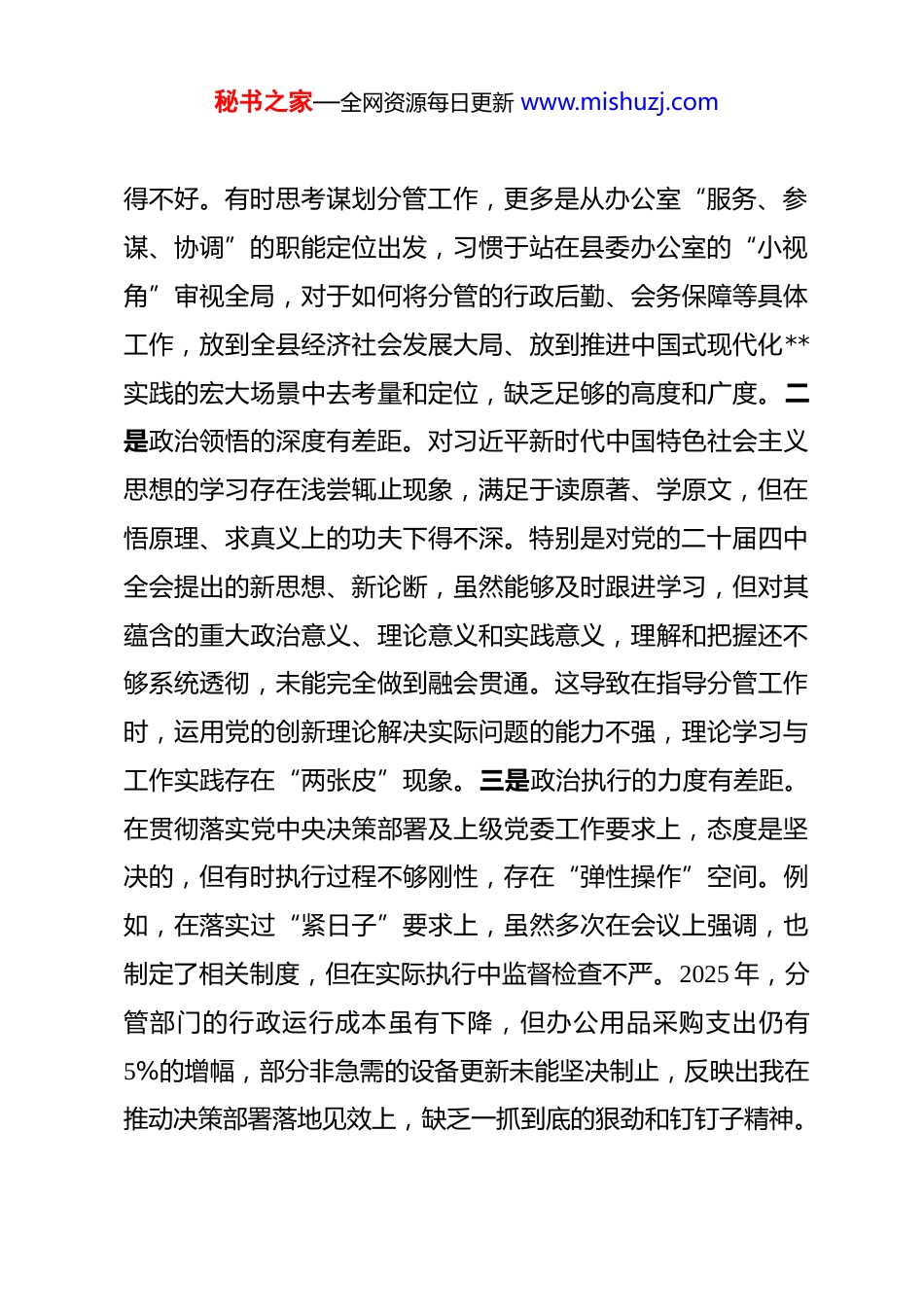 秘书之家—全网资源每日更新 www.mishuzj.com县委办副主任 2025 年度民主生活会个人对照检查材料 根据县委关于召开 2025 年度民主生活会的统一安排和部署,本人在深入学习党的二十届三中、四中全会精神,特别是习近平总书记关于作风建设的重要论述和中央八项规定精神的基础上,通过征求意见、谈心谈话等多种形式,广泛听取了各方面的意见建议。在此基础上,我紧扣本次民主生活会主题,对照“五个带头”要求,深入查摆自身存在的突出问题,深刻剖析问题根源,并明确了今后的努力方向和整改措施。现将个人对照检查情况报告如下。一、存在的问题本人紧紧围绕本次民主生活会主题,以对党忠诚、对事业负责的态度,把自己摆进去、把职责摆进去、把工作摆进去,深入查摆了在作风建设和履职尽责方面存在的问题和不足。(一)在带头强化政治忠诚、提高政治能力方面。始终将对党忠诚作为首要政治品质,但在具体实践中,仍感到政治能力的锤炼永无止境,对标更高要求还存在差距。一是政治站位的高度有差距。能够坚定拥护“两个确立”,做到“两个维护”,但在思想和行动上与党中央要求实现“无缝对接”还做秘书之家—全网资源每日更新 www.mishuzj.com得不好。有时思考谋划分管工作,更多是从办公室“服务、参谋、协调”的职能定位出发,习惯于站在县委办公室的“小视角”审视全局,对于如何将分管的行政后勤、会务保障等具体工作,放到全县经济社会发展大局、放到推进中国式现代化**实践的宏大场景中去考量和定位,缺乏足够的高度和广度。二是政治领悟的深度有差距。对习近平新时代中国特色社会主义思想的学习存在浅尝辄止现象,满足于读原著、学原文,但在悟原理、求真义上的功夫下得不深。特别是对党的二十届四中全会提出的新思想、新论断,虽然能够及时跟进学习,但对其蕴含的重大政治意义、理论意义和实践意义,理解和把握还不够系统透彻,未能完全做到融会贯通。这导致在指导分管工作时,运用党的创新理论解决实际问题的能力不强,理论学习与工作实践存在“两张皮”现象。三是政治执行的力度有差距。在贯彻落实党中央决策部署及上级党委工作要求上,态度是坚决的,但有时执行过程不够刚性,存在“弹性操作”空间。例如,在落实过“紧日子”要求上,虽然多次在会议上强调,也制定了相关制度,但在实际执行中监督检查不严。2025 年,分管部门的行政运行成本虽有下降,但办公用品采购支出仍有5%的增幅,部分非急需的设备更新未能坚决制止,反映出我在推动决策部署落地见效上,缺乏一抓到底的狠劲和钉钉子精神。秘书之家—全网资源每日更新 www.mishuzj.com(二)在带头固本培元、增强党性方面。能够自觉用党性原则要求自己,但在持之以恒的党性锻炼中,自我要求不够严格,党性修养的自觉性还需进一步增强。一是理论武装的系统性不好。对理论学习的重要性认识是清晰的,但行动上存在实用主义倾向,常常是上级要求学什么就学什么,与分管工作联系紧密的就多学一些,反之则浅尝辄止。缺乏一个全面系统、长期坚持的学习计划,对蕴含其中的世界观、方法论钻研不深、把握不准,导致理论素养和思想境界的提升速度,跟不上新时代新征程对领导干部提出的更高要求。二是党性修养的自觉性不好。在严格的党内政治生活中锤炼党性的主动性不强,有时以业务工作繁忙为由,放松了对主观世界的持续改造。在开展批评和自我批评时,有时还存在“好人主义”思想,对其他同志身上的小问题,提醒多、批评少;对自己身上的问题,谈工作多、谈思想少,党内政治生活的“辣味”不足,未能真正达到“红脸出汗、排毒治病”的效果。三是精神追求的坚定性不好。能够坚守共产党人的精神家园,但在面对社会上一些错误思潮和不良风气时,虽能做到不认同、不附和,但缺乏旗帜鲜明进行斗争的勇气。在日常工作中,艰苦奋斗、勤俭节约的意识有所淡化,对于分管的后勤保障工作,有时考虑“保障有力”多于“厉行节约”,在审批一些招待、会务费用时,对一秘书之家—全网资源每日更新 www.mishuzj.com些超出标准的项目,有时未能坚决予以核减。(三)在带头敬畏人民、敬畏组织、敬畏法纪方面。始终对人民、组织和法纪怀有敬...