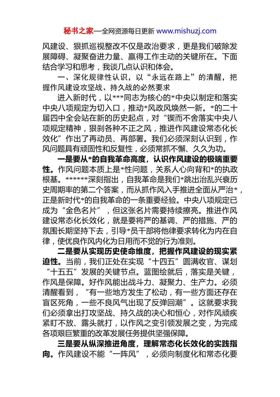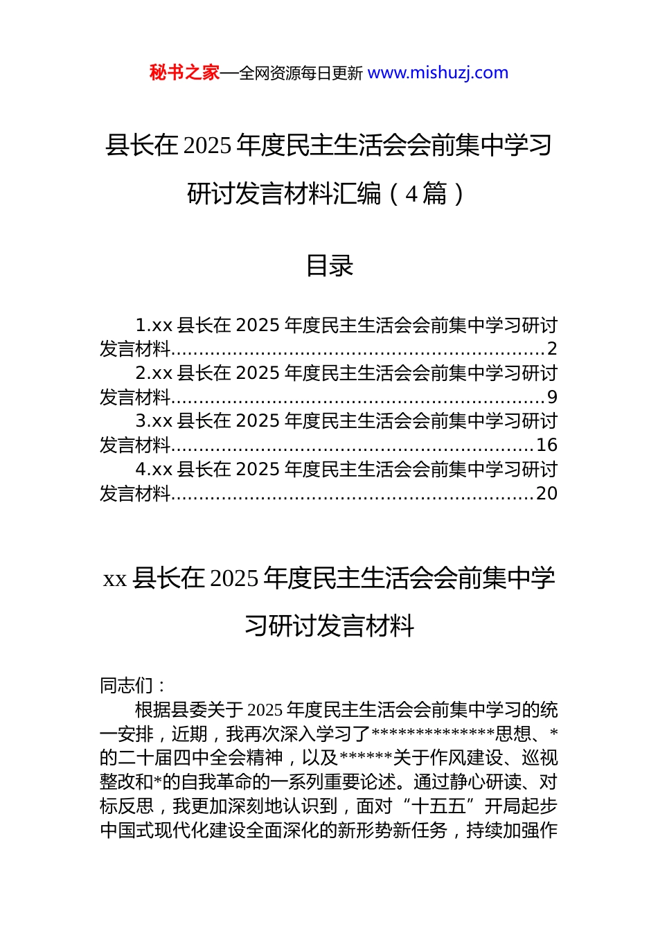 秘书之家—全网资源每日更新 www.mishuzj.com县长在 2025 年度民主生活会会前集中学习研讨发言材料汇编(4 篇)目录1.xx 县长在 2025 年度民主生活会会前集中学习研讨发言材料..................................................................22.xx 县长在 2025 年度民主生活会会前集中学习研讨发言材料..................................................................93.xx 县长在 2025 年度民主生活会会前集中学习研讨发言材料................................................................164.xx 县长在 2025 年度民主生活会会前集中学习研讨发言材料................................................................20xx 县长在 2025 年度民主生活会会前集中学习研讨发言材料同志们:根据县委关于 2025 年度民主生活会会前集中学习的统一安排,近期,我再次深入学习了**************思想、*的二十届四中全会精神,以及******关于作风建设、巡视整改和*的自我革命的一系列重要论述。通过静心研读、对标反思,我更加深刻地认识到,面对“十五五”开局起步中国式现代化建设全面深化的新形势新任务,持续加强作秘书之家—全网资源每日更新 www.mishuzj.com风建设、狠抓巡视整改不仅是政治要求,更是我们破除发展障碍、凝聚奋进力量、赢得工作主动的关键所在。下面结合学习和思考,我谈几点认识和体会。一、深化规律性认识,以“永远在路上”的清醒,把握作风建设攻坚战、持久战的必然要求进入新时代,以***同志为核心的*中央以制定和落实中央八项规定为切入口,推动*风政风焕然一新。*的二十届四中全会站在新的历史起点,对“锲而不舍落实中央八项规定精神,狠刹各种不正之风,推进作风建设常态化长效化”作出了再动员、再部署。我们必须深刻认识到,作风问题具有顽固性和反复性,必须常抓不懈、久久为功。一是要从*的自我革命高度,认识作风建设的极端重要性。作风问题本质上是*性问题,关系人心向背和*的执政根基。******深刻指出,自我革命是我们*跳出治乱兴衰历史周期率的第二个答案,而从抓作风入手推进全面从严治*,正是新时代*的自我革命的一条重要经验。中央八项规定已成为“金色名片”,但这张名片需要持续擦亮。推进作风建设常态化长效化,就是要将严的基调、严的措施、严的氛围长期坚持下去,引导*员干部将他律要求转化为内在自律,使优良作风内化为日用而不觉的行为准则。二是要从实现历史使命维度,把握作风建设的现实紧迫性。当前,我们正处在实现“十四五”圆满收官、谋划“十五五”发展的关键节点。蓝图绘就后,落实是关键,作风是保障。好作风能出战斗力、凝聚力、生产力。必须清醒看到,“有一些地方发生了松动,有一些方面还存在盲区死角,一些不良风气出现了反弹回潮”。这就要求我们必须拿出打攻坚战、持久战的决心和恒心,对作风顽疾紧盯不放、露头就打,以作风之变引领发展之变,为完成各项艰巨繁重的改革发展任务提供坚强保障。三是要从纵深推进角度,理解常态化长效化的实践指向。作风建设不能“一阵风”,必须向制度化和常态化要秘书之家—全网资源每日更新 www.mishuzj.com长效。*的二十届四中全会强调推进作风建设常态化长效化,正是着眼于破解“抓一抓有好转、松一松就反弹”的难题这意味着,我们的工作要从集中整治向常态治理深化,从侧重“惩处”向“惩、治、防”一体贯通转变,注重从体制机制上铲除不良作风滋生的土壤。这要求我们不仅要解决面上问题,更要深挖根源、建章立制,实现标本兼治。二、坚持系统性思维,以“一抓到底”的韧劲,统筹推进巡视整改与作风深化互促共进中央巡视是政治体检,巡视整改是严肃的政治任务。抓好巡视反馈问题整改,与锲而不舍落实中央八项规定精神、深化作风建设,两者目标同向、内在统一,必须一体谋划、一体推进、一体落实。首先,巡视整改是检验作风建设成效的“试金石”。巡视反馈的问题,很多都直接或间接与作风问题相关联,如形式主义、官僚主义,不担当、不作为,甚至风腐一体等问题。整改是否到位,直接反映了我们反对“四风”的态度是否坚决、措施是否有力。我们...