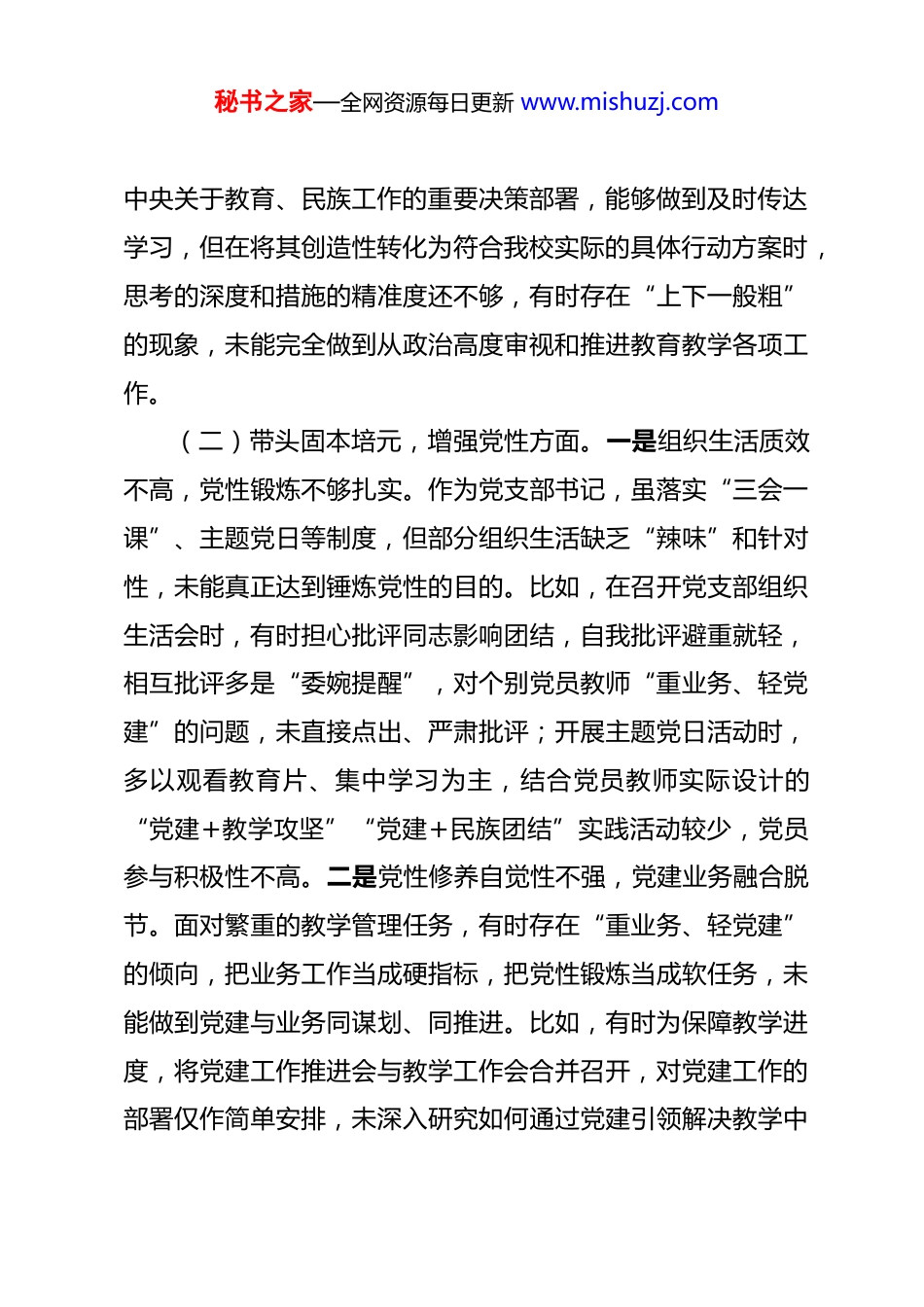 秘书之家—全网资源每日更新 www.mishuzj.com学校校长 2025 年度民主生活会对照检查发言材料 根据《市纪委机关市委组织部关于开好 2025 年度党员领导干部民主生活会的通知》文件部署要求,对照结合 6 个方面和“以案促改”典型案例,紧扣此次民主生活会主题,深挖问题症结、查找差距不足,现将个人对照检查情况报告如下:一、存在的问题剖析(一)带头强化政治忠诚,提高政治能力方面。一是理论学习深度不足,学用结合不紧密。我始终把学习习近平新时代中国特色社会主义思想作为首要政治任务,但一定程度存在“重形式、轻实效”的问题,对习近平总书记关于教育的重要论述、关于加强和改进民族工作的重要思想,仅满足于参加集中学习、做好笔记摘抄,缺乏系统性钻研和深层次思考。比如,在组织全校教师学习习近平总书记“办好人民满意的教育”重要指示时,仅安排了集中领学,未结合小学教育短板、学生成长特点制定具体的学习研讨计划,导致教师们对“如何把政治要求融入课堂”理解不深,学习效果打折扣。二是政治判断力、领悟力、执行力的转化效果有差距。从胸怀“两个大局”、牢记“国之大者”的角度审视开展工作还存在不足。比如,对党秘书之家—全网资源每日更新 www.mishuzj.com中央关于教育、民族工作的重要决策部署,能够做到及时传达学习,但在将其创造性转化为符合我校实际的具体行动方案时,思考的深度和措施的精准度还不够,有时存在“上下一般粗”的现象,未能完全做到从政治高度审视和推进教育教学各项工作。(二)带头固本培元,增强党性方面。一是组织生活质效不高,党性锻炼不够扎实。作为党支部书记,虽落实“三会一课”、主题党日等制度,但部分组织生活缺乏“辣味”和针对性,未能真正达到锤炼党性的目的。比如,在召开党支部组织生活会时,有时担心批评同志影响团结,自我批评避重就轻,相互批评多是“委婉提醒”,对个别党员教师“重业务、轻党建”的问题,未直接点出、严肃批评;开展主题党日活动时,多以观看教育片、集中学习为主,结合党员教师实际设计的“党建+教学攻坚”“党建+民族团结”实践活动较少,党员参与积极性不高。二是党性修养自觉性不强,党建业务融合脱节。面对繁重的教学管理任务,有时存在“重业务、轻党建”的倾向,把业务工作当成硬指标,把党性锻炼当成软任务,未能做到党建与业务同谋划、同推进。比如,有时为保障教学进度,将党建工作推进会与教学工作会合并召开,对党建工作的部署仅作简单安排,未深入研究如何通过党建引领解决教学中秘书之家—全网资源每日更新 www.mishuzj.com的实际问题,反映出自身党性修养的自觉性不够,对党建引领业务发展的认识不深刻。(三)带头敬畏人民、敬畏组织、敬畏法纪方面。一是联系服务师生不深入,宗旨意识有所淡化。我始终牢记为师生服务的宗旨,但在实际工作中存在“走马观花”的情况,未能真正沉下身子倾听师生诉求、解决实际困难。比如,虽然经常下班级、进课堂,但与一线教师、学生及家长的深度交流、谈心谈话不够经常,对师生员工的急难愁盼问题掌握不够全面、精准,主动服务、靠前服务的意识有待加强。二是组织程序执行不到位,日常管理不够严格。能够做到自身廉洁,但在抓班子、带队伍,严格日常教育管理监督上,有时存在“老好人”思想,运用“第一种形态”不够有力。比如,对个别党员教师中出现的苗头性、倾向性问题,批评教育不够严厉、及时,制度执行的刚性有待进一步强化。三是法纪监督落实不到位,廉政风险防范有漏洞。对学校内部管理制度的执行监督不够严格,对一些细节环节的廉政风险排查不到位。比如,督查学校食堂食材质量、常态化抽查机制落实还不够,存在一定的廉政风险隐患,反映出对法纪的敬畏之心未能融入工作细节。(四)带头铸牢中华民族共同体意识,推进中华民族共同体建设方面。一是民族团结教育形式单一,融入日常不够深入。秘书之家—全网资源每日更新 www.mishuzj.com我始终把铸牢中华民族共同体意识作为学校工作的重中之重,但在教育实践中还一定程度存在“内容固化、形式单一”的问题,未能真正将其融入教育教学全过程。比如,开展“民族团结一家亲”...