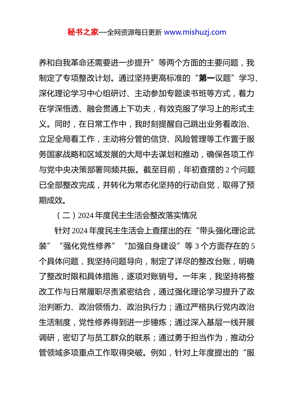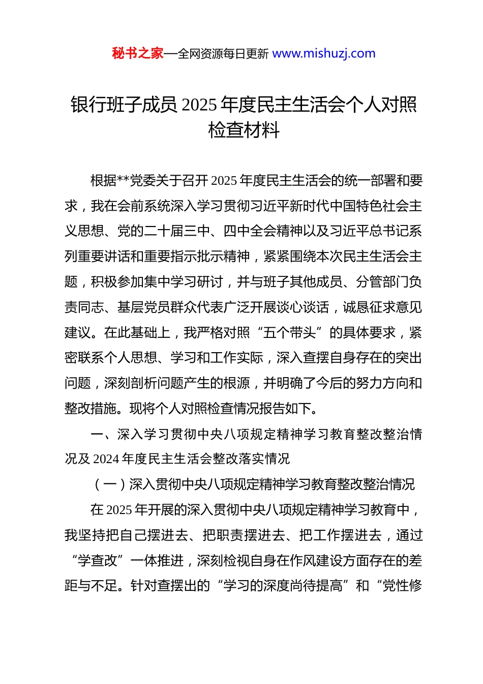 秘书之家—全网资源每日更新 www.mishuzj.com银行班子成员 2025 年度民主生活会个人对照检查材料 根据**党委关于召开 2025 年度民主生活会的统一部署和要求,我在会前系统深入学习贯彻习近平新时代中国特色社会主义思想、党的二十届三中、四中全会精神以及习近平总书记系列重要讲话和重要指示批示精神,紧紧围绕本次民主生活会主题,积极参加集中学习研讨,并与班子其他成员、分管部门负责同志、基层党员群众代表广泛开展谈心谈话,诚恳征求意见建议。在此基础上,我严格对照“五个带头”的具体要求,紧密联系个人思想、学习和工作实际,深入查摆自身存在的突出问题,深刻剖析问题产生的根源,并明确了今后的努力方向和整改措施。现将个人对照检查情况报告如下。一、深入学习贯彻中央八项规定精神学习教育整改整治情况及 2024 年度民主生活会整改落实情况(一)深入贯彻中央八项规定精神学习教育整改整治情况在 2025 年开展的深入贯彻中央八项规定精神学习教育中,我坚持把自己摆进去、把职责摆进去、把工作摆进去,通过“学查改”一体推进,深刻检视自身在作风建设方面存在的差距与不足。针对查摆出的“学习的深度尚待提高”和“党性修秘书之家—全网资源每日更新 www.mishuzj.com养和自我革命还需要进一步提升”等两个方面的主要问题,我制定了专项整改计划。通过坚持更高标准的“第一议题”学习、深化理论学习中心组研讨、主动参加专题读书班等方式,着力在学深悟透、融会贯通上下功夫,有效克服了学习上的形式主义。同时,在日常工作中,我时刻提醒自己跳出业务看政治、立足全局看工作,主动将分管的信贷、风险管理等工作置于服务国家战略和区域发展的大局中去谋划和推动,确保各项工作与党中央决策部署同频共振。截至目前,年初查摆的 2 个问题已全部整改完成,并转化为常态化坚持的行动自觉,取得了预期成效。(二)2024 年度民主生活会整改落实情况针对 2024 年度民主生活会上查摆出的在“带头强化理论武装”“强化党性修养”“加强自身建设”等 3 个方面存在的 5个具体问题,我坚持问题导向,制定了详尽的整改台账,明确了整改时限和具体措施,逐项对账销号。一年来,我坚持将整改工作与日常履职尽责紧密结合,通过强化理论学习提升了政治判断力、政治领悟力、政治执行力;通过严格执行党内政治生活制度,党性修养得到进一步锤炼;通过深入基层一线开展调研,密切了与员工群众的联系;通过勇于担当作为,推动分管领域多项重点工作取得突破。例如,针对上年度提出的“服秘书之家—全网资源每日更新 www.mishuzj.com务实体经济创新举措不多”问题,我牵头推动了针对战略性新兴产业的信贷产品创新,2025 年相关领域贷款余额增长了15.3%。截至本次民主生活会召开前,上年度查摆的 5 个问题已全部整改落实到位,相关成效在工作中得到了检验。二、存在的主要问题紧扣本次民主生活会主题,对照“五个带头”要求,我进行了深刻的自我检视和剖析,发现自身仍存在一些问题和不足。(一)在带头强化政治忠-诚、提高政治能力方面一是运用政治“显微镜”审视业务工作的锐度不强。在具体工作中,有时未能完全从政治高度审视和把握金融工作的本质规律,对业务发展中潜在的政治风险和安全隐患,洞察力和预见性不足。2025 年我行在推进一项数字金融创新业务时,我初期的关注点更多地集中在技术实现路径、市场份额和客户体验上,对于其中涉及的数据安全、算法公平性等问题可能引发的社会舆情和政治风险,缺乏系统性的前瞻研判和压力测试,反映出将政治要求融入业务全过程的意识和能力存在差距。二是担当政策“转换器”推动决策部署的效率不高。对于中央的大政方针和上级党委的决策部署,虽然能够做到坚决拥护、认真学习,但在将其迅速、精准地转化为本行业务发展的具体策略和行动方案上,反应速度和创新力度不够。例如秘书之家—全网资源每日更新 www.mishuzj.com2025 年初中央经济工作会议强调要加大对“专精特新”企业的金融支持力度后,我行制定专项信贷产品的内部流程走了近两个月,从政策学习到产品落地存在一定时滞,错失了服务部分优质科创企业的最佳时间窗...