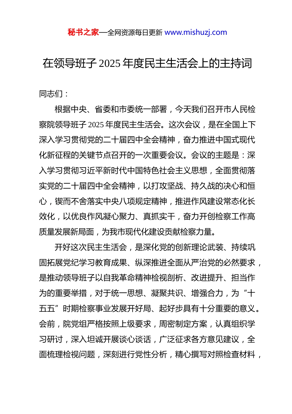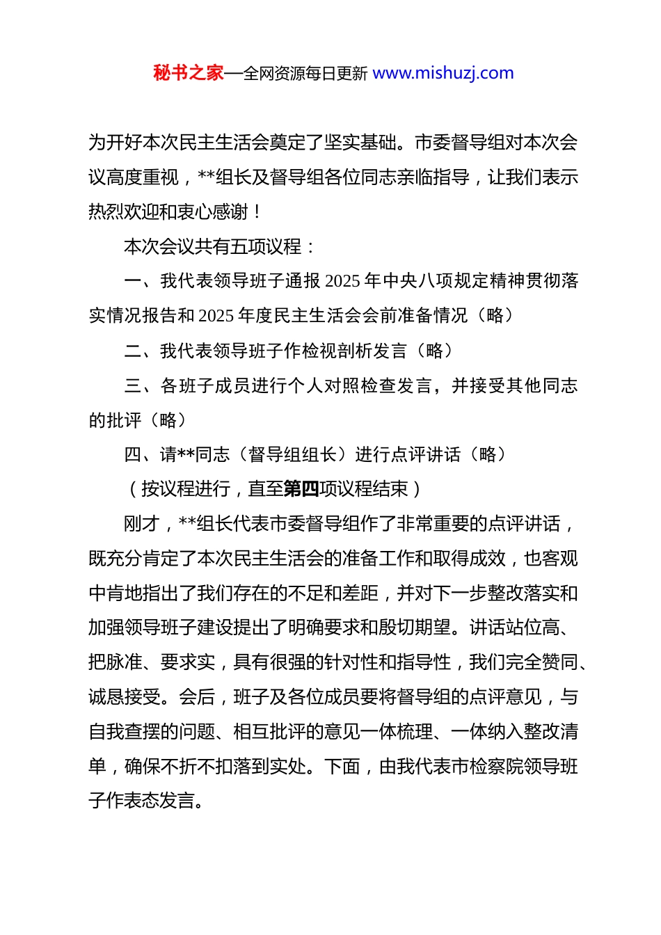 秘书之家—全网资源每日更新 www.mishuzj.com在领导班子 2025 年度民主生活会上的主持词 同志们:根据中央、省委和市委统一部署,今天我们召开市人民检察院领导班子 2025 年度民主生活会。这次会议,是在全国上下深入学习贯彻党的二十届四中全会精神,奋力推进中国式现代化新征程的关键节点召开的一次重要会议。会议的主题是:深入学习贯彻习近平新时代中国特色社会主义思想,全面贯彻落实党的二十届四中全会精神,以打攻坚战、持久战的决心和恒心,锲而不舍落实中央八项规定精神,推进作风建设常态化长效化,以优良作风凝心聚力、真抓实干,奋力开创检察工作高质量发展新局面,为我市现代化建设贡献检察力量。开好这次民主生活会,是深化党的创新理论武装、持续巩固拓展党纪学习教育成果、纵深推进全面从严治党的必然要求,是推动领导班子以自我革命精神检视剖析、改进提升、担当作为的重要举措,对于统一思想、凝聚共识、增强合力,为“十五五”时期检察事业发展开好局、起好步具有十分重要的意义。会前,院党组严格按照上级要求,周密制定方案,认真组织学习研讨,深入坦诚开展谈心谈话,广泛征求各方意见建议,全面梳理检视问题,深刻进行党性分析,精心撰写对照检查材料,秘书之家—全网资源每日更新 www.mishuzj.com为开好本次民主生活会奠定了坚实基础。市委督导组对本次会议高度重视,**组长及督导组各位同志亲临指导,让我们表示热烈欢迎和衷心感谢!本次会议共有五项议程:一、我代表领导班子通报 2025 年中央八项规定精神贯彻落实情况报告和 2025 年度民主生活会会前准备情况(略)二、我代表领导班子作检视剖析发言(略)三、各班子成员进行个人对照检查发言,并接受其他同志的批评(略)四、请**同志(督导组组长)进行点评讲话(略)(按议程进行,直至第四项议程结束)刚才,**组长代表市委督导组作了非常重要的点评讲话,既充分肯定了本次民主生活会的准备工作和取得成效,也客观中肯地指出了我们存在的不足和差距,并对下一步整改落实和加强领导班子建设提出了明确要求和殷切期望。讲话站位高、把脉准、要求实,具有很强的针对性和指导性,我们完全赞同、诚恳接受。会后,班子及各位成员要将督导组的点评意见,与自我查摆的问题、相互批评的意见一体梳理、一体纳入整改清单,确保不折不扣落到实处。下面,由我代表市检察院领导班子作表态发言。秘书之家—全网资源每日更新 www.mishuzj.com一、聚焦“凝心铸魂”持续用力,在深化理论武装上展现新境界督导组的点评和本次查摆的问题,深刻警示我们必须将理论学习置于更加突出的位置。我们将始终坚持把学习贯彻习近平新时代中国特色社会主义思想作为首要政治任务,与深学细悟党的二十届四中全会精神和习近平法治思想紧密结合起来。着力在全面系统、融会贯通上下功夫,深刻把握蕴含其中的立场观点方法,不断提升政治判断力、政治领悟力、政治执行力,夯实坚定拥护“两个确立”、坚决做到“两个维护”的思想根基。我们将紧密联系新时代检察工作实践,将学习成果切实转化为谋划工作的清晰思路、推动发展的具体举措、法律监督的实践能力,确保党的路线方针政策和上级决策部署在市检察院不折不扣得到贯彻执行,始终确保检察工作正确政治方向。二、聚焦“动真碰硬”持续用力,在狠抓整改落实上取得新成效“善治病者,必医其受病之处;善救弊者,必塞其起弊之原。”发现问题是起点,整改落实才是关键。针对本次民主生活会查摆出的问题、征求到的意见建议以及督导组指出的不足,我们将切实扛起整改主体责任,立即制定班子及个人整改方案,建立详实的问题清单、任务清单、责任清单,明确整改时限和秘书之家—全网资源每日更新 www.mishuzj.com整改目标。坚持“当下改”与“长久立”相结合,对于能立即解决的,立行立改;对于需要一定过程的,明确阶段目标,紧盯不放,限期整改。实行台账管理、销号落实,定期组织“回头看”,坚决防止问题反弹回潮。我们将把整改过程作为淬炼党性、改进作风、提升能力的过程,以钉钉子精神确保每一个问题都整改到位、见到实效,切实把民主生活会的成果转化为加强班子自身建设和推...