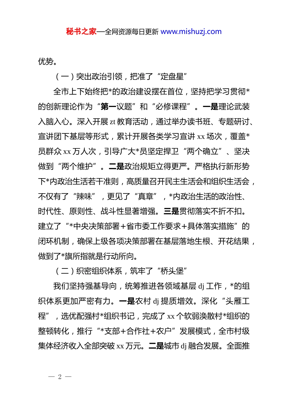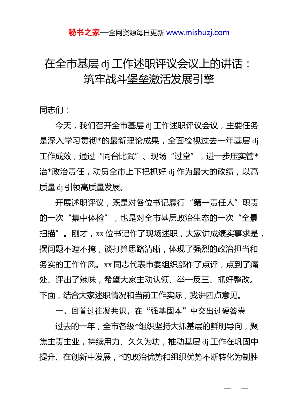 秘书之家—全网资源每日更新 www.mishuzj.com在全市基层 dj 工作述职评议会议上的讲话:筑牢战斗堡垒激活发展引擎同志们:今天,我们召开全市基层 dj 工作述职评议会议,主要任务是深入学习贯彻*的最新理论成果,全面检视过去一年基层 dj工作成效,通过“同台比武”、现场“过堂”,进一步压实管*治*政治责任,动员全市上下把抓好 dj 作为最大的政绩,以高质量 dj 引领高质量发展。开展述职评议,既是对各位书记履行“第一责任人”职责的一次“集中体检”,也是对全市基层政治生态的一次“全景扫描”。刚才,xx 位书记作了现场述职,大家讲成绩实事求是,摆问题不遮不掩,谈打算思路清晰,体现了强烈的政治担当和务实的工作作风。xx 同志代表市委组织部作了点评,点到了痛处、评出了辣味,希望大家主动认领、举一反三、抓好整改。下面,结合大家述职情况和当前工作实际,我讲四点意见。一、回首过往凝共识,在“强基固本”中交出过硬答卷过去的一年,全市各级*组织坚持大抓基层的鲜明导向,聚焦主责主业,持续用力、久久为功,推动基层 dj 工作在巩固中提升、在创新中发展,*的政治优势和组织优势不断转化为制胜— 1 —秘书之家—全网资源每日更新 www.mishuzj.com优势。(一)突出政治引领,把准了“定盘星”全市上下始终把*的政治建设摆在首位,坚持把学习贯彻*的创新理论作为“第一议题”和“必修课程”。一是理论武装入脑入心。深入开展 zt 教育活动,通过举办读书班、专题研讨、宣讲团下基层等形式,累计开展各类学习宣讲 xx 场次,覆盖*员群众 xx 万人次,引导广大*员坚定捍卫“两个确立”、坚决做到“两个维护”。二是政治规矩立得更严。严格执行新形势下*内政治生活若干准则,高质量召开民主生活会和组织生活会,不仅有了“辣味”,更见了“真章”,*内政治生活的政治性、时代性、原则性、战斗性显著增强。三是贯彻落实不折不扣。建立了“*中央决策部署+省市委工作要求+具体落实措施”的闭环机制,确保上级各项决策部署在基层落地生根、开花结果,做到了*旗所指就是行动所向。(二)织密组织体系,筑牢了“桥头堡”我们坚持强基导向,统筹推进各领域基层 dj 工作,*的组织体系更加严密有力。一是农村 dj 提质增效。深化“头雁工程”,选优配强村*组织书记,完成了 xx 个软弱涣散村*组织的整顿转化,推行“*支部+合作社+农户”发展模式,全市村级集体经济收入全部突破 xx 万元。二是城市 dj 融合发展。全面推— 2 —秘书之家—全网资源每日更新 www.mishuzj.com行街道“大工委”、社区“大*委”制,深化“红色物业”创建,将*支部建在网格上、建在楼栋里,有效破解了老旧小区治理难、物业纠纷多等顽疾,构建了共建共治共享的城市基层治理新格局。三是新兴领域有效覆盖。紧盯快递物流、互联网平台等新业态新就业群体,成立行业*委 xx 个,新建“暖心驿站”xx 个,通过组织覆盖和暖心服务,让“流动大军”找到了“红色娘家”。(三)聚焦中心大局,激活了“动力源”各级*组织坚持围绕中心抓 dj、抓好 dj 促发展,推动 dj 工作与经济社会发展深度融合。一是 dj 引领项目建设。在重点项目一线成立临时*支部 xx 个,设立“*员先锋岗”、组建“*员突击队”,广大*员干部在征地拆迁、招商引资、项目攻坚中冲锋在前,解决难题 xx 个,跑出了项目建设的“加速度”。二是dj 赋能乡村振兴。深入实施“万企兴万村”行动,选派 xx 名第一书记和工作队驻村帮扶,通过联建共建、资源共享,推动 xx个产业项目落地见效,绘就了农业强、农村美、农民富的壮美画卷。三是 dj 保障民生改善。扎实开展“我为群众办实事”实践活动,建立*员干部联系服务群众“三个一”机制,解决群众急难愁盼问题 xx 件,让*旗在基层一线高高飘扬,让群众的获得感成色更足。— 3 —秘书之家—全网资源每日更新 www.mishuzj.com二、直面问题找差距,在“对标对表”中清醒审视不足在肯定成绩的同时,我们必须保持清醒头脑,深刻认识到基层 dj 工作还存在一些不容忽视的短板和弱项,距离新时代*的建设总要求还有一定差距。(一)责任传导存在“温差”...