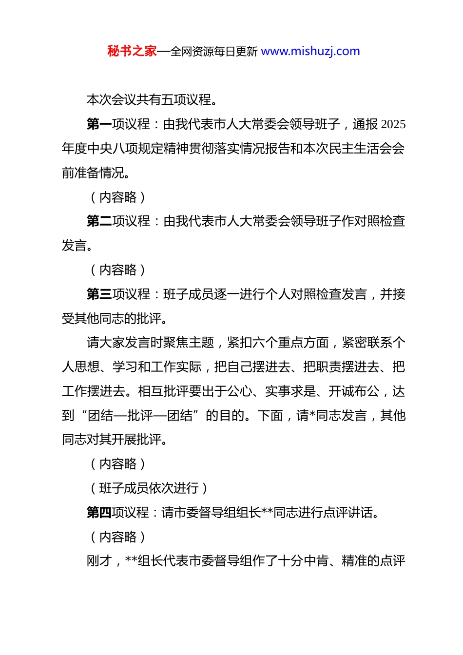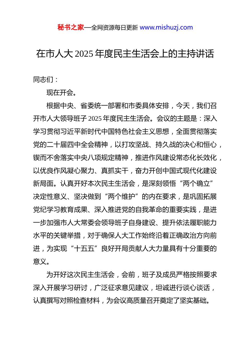 秘书之家—全网资源每日更新 www.mishuzj.com在市人大 2025 年度民主生活会上的主持讲话 同志们:现在开会。根据中央、省委统一部署和市委具体安排,今天,我们召开市人大领导班子 2025 年度民主生活会。会议的主题是:深入学习贯彻习近平新时代中国特色社会主义思想,全面贯彻落实党的二十届四中全会精神,以打攻坚战、持久战的决心和恒心,锲而不舍落实中央八项规定精神,推进作风建设常态化长效化,以优良作风凝心聚力、真抓实干,奋力开创中国式现代化建设新局面。认真开好本次民主生活会,是深刻领悟“两个确立”决定性意义、坚决做到“两个维护”的内在要求,是巩固拓展党纪学习教育成果、深入推进党的自我革命的重要实践,是进一步加强市人大常委会领导班子自身建设、提升依法履职能力水平的关键举措,对于确保人大工作始终沿着正确政治方向前进,为实现“十五五”良好开局贡献人大力量具有十分重要的意义。为开好这次民主生活会,会前,班子及成员严格按照要求深入开展学习研讨,广泛征求意见建议,坦诚进行谈心谈话,认真撰写对照检查材料,为会议高质量召开奠定了坚实基础。秘书之家—全网资源每日更新 www.mishuzj.com本次会议共有五项议程。第一项议程:由我代表市人大常委会领导班子,通报 2025年度中央八项规定精神贯彻落实情况报告和本次民主生活会会前准备情况。(内容略)第二项议程:由我代表市人大常委会领导班子作对照检查发言。(内容略)第三项议程:班子成员逐一进行个人对照检查发言,并接受其他同志的批评。请大家发言时聚焦主题,紧扣六个重点方面,紧密联系个人思想、学习和工作实际,把自己摆进去、把职责摆进去、把工作摆进去。相互批评要出于公心、实事求是、开诚布公,达到“团结—批评—团结”的目的。下面,请*同志发言,其他同志对其开展批评。(内容略)(班子成员依次进行)第四项议程:请市委督导组组长**同志进行点评讲话。(内容略)刚才,**组长代表市委督导组作了十分中肯、精准的点评秘书之家—全网资源每日更新 www.mishuzj.com讲话,充分肯定了本次民主生活会的成效,严肃指出了我们存在的不足,并对下一步工作提出了明确要求。督导组的点评指导意见,具有很强的政治性、指导性和针对性,我们诚恳接受、照单全收,并将不折不扣抓好贯彻落实。下面,我代表市人大常委会领导班子,郑重表态如下:一、在筑牢政治忠诚上持续用力,以更高站位把稳思想之舵。我们将始终坚持把党的政治建设摆在首位,将学习贯彻党的创新理论作为终身课题。特别是要聚焦党的二十届四中全会作出的关于坚持好、完善好、运行好人民代表大会制度的战略部署,以及习近平总书记关于发展全过程人民民主的重大理念,进行再学习、再领悟、再对标。深刻认识到,人大作为党领导下的重要政治机关,必须将旗帜鲜明讲政治贯穿于履职尽责全过程各方面。我们将持续巩固拓展主题教育成果,深刻把握“五个进一步到位”的实践要求,不断提高政治判断力、政治领悟力、政治执行力,自觉在思想上政治上行动上同以习近平同志为核心的党中央保持高度一致,确保党中央大政方针和省委、市委决策部署在市人大及其常委会得到全面贯彻和有效执行,始终做“两个确立”的忠诚拥护者、“两个维护”的示范践行者。二、在抓实问题整改上精准发力,以更实举措扛起治本之秘书之家—全网资源每日更新 www.mishuzj.com责。这次民主生活会查摆出的问题,无论是班子的还是个人的,督导组点出的意见,同志们的批评建议,都是帮助我们祛病强身的“良方”。我们将坚决扛起整改主体责任,第一时间制定整改方案,形成问题清单、任务清单、责任清单,建立台账、销号管理。坚持分类施策,对能够立即解决的,立行立改、马上就办;对需要一定时间解决的,明确时限、压茬推进;对需要长期坚持的,完善机制、久久为功。整改过程将主动接受党员干部和人大代表监督,坚决杜绝“纸上整改”“口头整改”。我们将把抓好民主生活会问题整改,与贯彻落实中央八项规定及其实施细则精神紧密结合起来,以钉钉子精神纠“四风”、树新风,把“当下改”与“长久立”统一起来,着力从思想根源和制度机制上破解难题,确...
