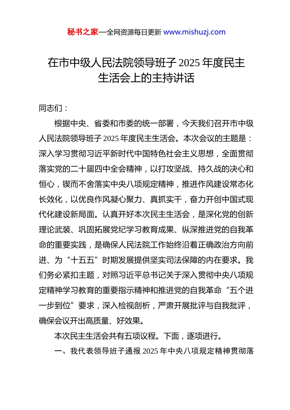 秘书之家—全网资源每日更新 www.mishuzj.com在市中级人民法院领导班子 2025 年度民主生活会上的主持讲话 同志们:根据中央、省委和市委的统一部署,今天我们召开市中级人民法院领导班子 2025 年度民主生活会。本次会议的主题是:深入学习贯彻习近平新时代中国特色社会主义思想,全面贯彻落实党的二十届四中全会精神,以打攻坚战、持久战的决心和恒心,锲而不舍落实中央八项规定精神,推进作风建设常态化长效化,以优良作风凝心聚力、真抓实干,奋力开创中国式现代化建设新局面。认真开好本次民主生活会,是深化党的创新理论武装、巩固拓展党纪学习教育成果、纵深推进党的自我革命的重要实践,是确保人民法院工作始终沿着正确政治方向前进、为“十五五”时期发展提供坚实司法保障的内在要求。我们务必紧扣主题,对照习近平总书记关于深入贯彻中央八项规定精神学习教育的重要指示精神和推进党的自我革命“五个进一步到位”要求,深入检视剖析,严肃开展批评与自我批评,确保会议开出高质量、好效果。本次民主生活会共有五项议程。下面,逐项进行。一、我代表领导班子通报 2025 年中央八项规定精神贯彻落秘书之家—全网资源每日更新 www.mishuzj.com实情况报告和 2025 年度民主生活会会前准备情况(略)二、我代表领导班子作检视剖析发言(略)三、各班子成员进行个人对照检查发言,并接受其他同志的批评现在进行第三项议程。请各位班子成员逐一进行个人对照检查发言,发言后,其他同志对其提出批评意见。个人发言要聚焦主题,把自己摆进去、把职责摆进去、把工作摆进去;相互批评要出于公心、实事求是、开诚布公,达到“团结—批评—团结”的目的。(各班子成员依次发言,开展批评与自我批评,过程略)四、请**同志(督导组组长)进行点评讲话刚才,班子成员严肃认真地开展了批评与自我批评。现在让我们以热烈的掌声,欢迎市委督导组组长**同志进行点评指导。(督导组组长点评讲话略)刚才,督导组**组长作了精准深刻的点评讲话,既肯定了前期工作和会议成效,也指出了我们存在的不足,并对下一步整改落实提出了明确要求。点评讲话政治站位高、指导性强,我们完全认同、诚恳接受,并将严格对照、全面整改。下面,我代表市中级人民法院领导班子,郑重表态如下:秘书之家—全网资源每日更新 www.mishuzj.com一、深学细悟,筑牢忠诚根基,在政治能力上实现新提升我们将始终坚持把政治建设摆在首位,持续巩固拓展主题教育成果。深刻领悟“两个确立”的决定性意义,坚决做到“两个维护”,始终在思想上政治上行动上同以习近平同志为核心的党中央保持高度一致。严格执行《中国共产党政法工作条例》,确保党中央、省委、市委各项决策部署在全市法院系统不折不扣落地生根。我们将把学习贯彻党的二十届四中全会精神作为当前和今后一个时期的重要政治任务,深刻把握关于“建设中国特色社会主义法治体系”的战略部署,不断提高运用党的创新理论指导实践、破解司法难题、推动法院工作现代化的能力。持续强化政治机关意识教育,引导广大干警不断提升政治判断力、政治领悟力、政治执行力,将党的领导优势转化为服务大局、司法为民、公正司法的实际效能。二、动真碰硬,狠抓问题整改,在自我革命上展现新担当针对此次民主生活会查摆出的问题、会上相互批评的意见以及督导组指出的不足,我们将照单全收、主动认领,坚决杜绝“过关”思想。会后立即召开专题会议,逐项研究梳理,制定班子及个人整改清单,明确整改目标、整改责任、整改时限。坚持“当下改”与“长久立”相结合,对于能够立即解决的,立行立改、马上就办;对于需要持续攻坚的,明确阶段目标,秘书之家—全网资源每日更新 www.mishuzj.com一抓到底。特别是要聚焦群众反映强烈的司法作风突出问题、制约审判质效提升的瓶颈难题、全面从严治院中的薄弱环节,以刀刃向内的勇气和抓铁有痕的劲头,推动问题彻底解决。我们将把整改落实作为检验党性、衡量作风的试金石,主动接受党员、群众和干警监督,确保每个问题都整改到位、每项承诺都得到兑现,以实实在在的整改成效推动法院政治生态持续向好。三、履职尽责,强化担当作为,在...