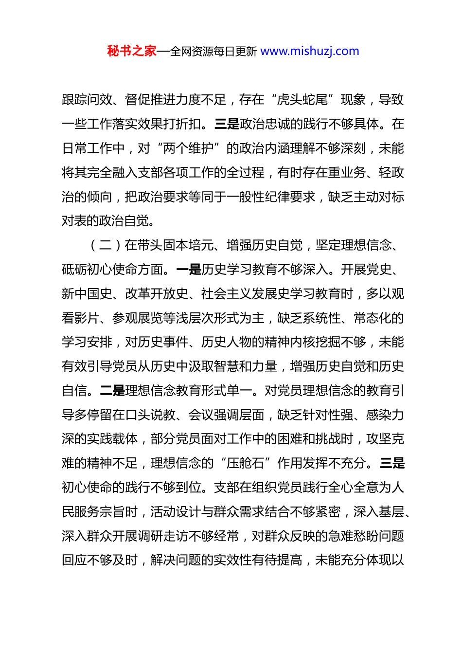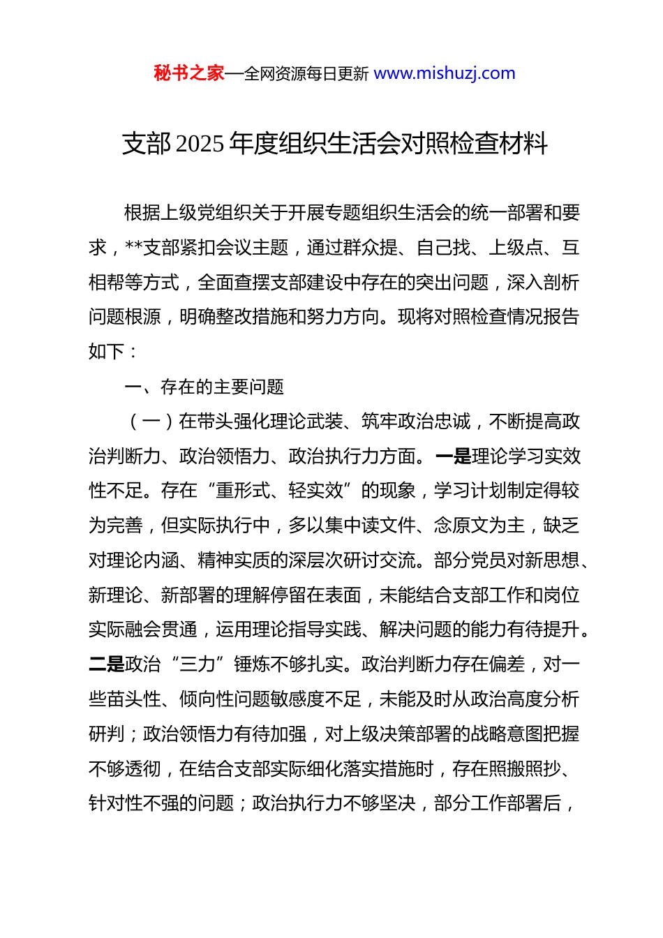 秘书之家—全网资源每日更新 www.mishuzj.com支部 2025 年度组织生活会对照检查材料 根据上级党组织关于开展专题组织生活会的统一部署和要求,**支部紧扣会议主题,通过群众提、自己找、上级点、互相帮等方式,全面查摆支部建设中存在的突出问题,深入剖析问题根源,明确整改措施和努力方向。现将对照检查情况报告如下:一、存在的主要问题(一)在带头强化理论武装、筑牢政治忠诚,不断提高政治判断力、政治领悟力、政治执行力方面。一是理论学习实效性不足。存在“重形式、轻实效”的现象,学习计划制定得较为完善,但实际执行中,多以集中读文件、念原文为主,缺乏对理论内涵、精神实质的深层次研讨交流。部分党员对新思想、新理论、新部署的理解停留在表面,未能结合支部工作和岗位实际融会贯通,运用理论指导实践、解决问题的能力有待提升。二是政治“三力”锤炼不够扎实。政治判断力存在偏差,对一些苗头性、倾向性问题敏感度不足,未能及时从政治高度分析研判;政治领悟力有待加强,对上级决策部署的战略意图把握不够透彻,在结合支部实际细化落实措施时,存在照搬照抄、针对性不强的问题;政治执行力不够坚决,部分工作部署后,秘书之家—全网资源每日更新 www.mishuzj.com跟踪问效、督促推进力度不足,存在“虎头蛇尾”现象,导致一些工作落实效果打折扣。三是政治忠诚的践行不够具体。在日常工作中,对“两个维护”的政治内涵理解不够深刻,未能将其完全融入支部各项工作的全过程,有时存在重业务、轻政治的倾向,把政治要求等同于一般性纪律要求,缺乏主动对标对表的政治自觉。(二)在带头固本培元、增强历史自觉,坚定理想信念、砥砺初心使命方面。一是历史学习教育不够深入。开展党史、新中国史、改革开放史、社会主义发展史学习教育时,多以观看影片、参观展览等浅层次形式为主,缺乏系统性、常态化的学习安排,对历史事件、历史人物的精神内核挖掘不够,未能有效引导党员从历史中汲取智慧和力量,增强历史自觉和历史自信。二是理想信念教育形式单一。对党员理想信念的教育引导多停留在口头说教、会议强调层面,缺乏针对性强、感染力深的实践载体,部分党员面对工作中的困难和挑战时,攻坚克难的精神不足,理想信念的“压舱石”作用发挥不充分。三是初心使命的践行不够到位。支部在组织党员践行全心全意为人民服务宗旨时,活动设计与群众需求结合不够紧密,深入基层、深入群众开展调研走访不够经常,对群众反映的急难愁盼问题回应不够及时,解决问题的实效性有待提高,未能充分体现以秘书之家—全网资源每日更新 www.mishuzj.com人民为中心的发展思想。(三)在带头敬畏人民、敬畏组织、敬畏法纪,严守规矩不逾底线方面。一是敬畏人民的意识不够强烈。部分党员干部存在官僚主义倾向,与群众沟通交流时态度不够诚恳,倾听群众意见建议不够耐心,对群众的合理诉求重视不够、落实不力,没有真正把群众的满意度作为衡量工作成效的重要标准。二是敬畏组织的观念不够牢固。个别党员对支部的组织生活重视不足,存在缺席“三会一课”、主题党日活动的现象,且请假理由不充分;在执行组织决定、服从组织安排时,有时存在本位主义思想,对不属于自己分管的工作配合不够主动,缺乏大局意识和组织观念。三是敬畏法纪的自觉不够坚定。支部对党员的纪律教育和警示教育不够经常化、制度化,部分党员对党纪国法的学习不够深入,对一些小节问题不够重视,存在侥幸心理;在日常工作中,对规章制度的执行不够严格,存在流程不规范、操作不严谨的问题,纪律约束的“紧箍咒”没有拧紧。(四)在带头干事创业、担当作为,推动高质量发展取得新成效方面。一是担当作为的精神不够饱满。面对工作中的难点堵点问题,部分党员存在畏难情绪,缺乏“啃硬骨头”的勇气和决心,习惯于按部就班、墨守成规,不愿主动探索创新工作方法;在面对紧急任务、重大挑战时,有时存在推诿扯皮、秘书之家—全网资源每日更新 www.mishuzj.com敷衍塞责的现象,担当尽责的主动性不足。二是工作创新能力有待提升。支部工作整体思路较为传统,在推动工作提质增效、服务中心大局方面,缺乏突破性的思路和举措;...