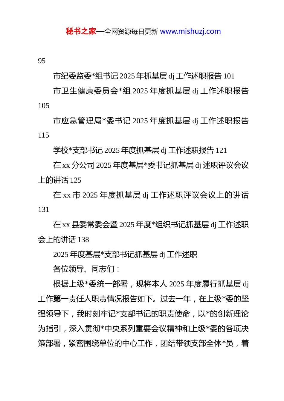 秘书之家—全网资源每日更新 www.mishuzj.com(21 篇)2025 年度书记抓基层 dj 工作述职汇编(来源网络,甄别学习)2025 年度基层*支部书记抓基层 dj 工作述职 2*支部 2025 年度抓基层 dj 工作述职报告 10交警大队*支部书记 2025 年度抓基层 dj 工作述职报告 15街道卫生院*委班子 2025 年抓基层 dj 工作述职报告 21区财政局 2025 年*组书记抓基层 dj 工作述职报告 28市水利局*支部书记 2025 年度抓基层 dj 工作述职报告 36县委*校*委书记 2025 年抓基层 dj 工作述职报告 42县委书记在全县 2025 年度抓基层 dj 述职评议会上的讲话50银行*委书记 2025 年度抓基层 dj 工作述职报告 58镇*委书记 2025 年度抓基层 dj 工作述职报告 66能源公司*支部书记 2025 年度抓基层 dj 工作述职报告 73农商银行*委书记 2025 年度抓基层 dj 工作述职报告 81区委书记在区直部门*组织书记抓基层 dj 述职报告会上的讲话 88石油销售分公司*委书记 2025 年度抓基层 dj 工作述职报告秘书之家—全网资源每日更新 www.mishuzj.com95市纪委监委*组书记 2025 年抓基层 dj 工作述职报告 101市卫生健康委员会*组 2025 年度抓基层 dj 工作述职报告105市应急管理局*委书记 2025 年度抓基层 dj 工作述职报告115学校*支部书记 2025 年度抓基层 dj 工作述职报告 121在 xx 分公司 2025 年度基层*委书记抓基层 dj 述职评议会议上的讲话 125在 xx 市 2025 年度抓基层 dj 工作述职评议会议上的讲话131在 xx 县委常委会暨 2025 年度*组织书记抓基层 dj 工作述职会上的讲话 1382025 年度基层*支部书记抓基层 dj 工作述职各位领导、同志们:根据上级*委统一部署,现将本人 2025 年度履行抓基层 dj工作第一责任人职责情况报告如下。过去一年,在上级*委的坚强领导下,我时刻牢记*支部书记的职责使命,以*的创新理论为指引,深入贯彻*中央系列重要会议精神和上级*委的各项决策部署,紧密围绕单位的中心工作,团结带领支部全体*员,着秘书之家—全网资源每日更新 www.mishuzj.com力强基固本、促进融合、提升效能、转变作风,全面提高支部dj 工作质量,为单位完成年度目标任务提供了坚实的政治和组织保障。一、聚焦政治引领,在学思践悟中筑牢信仰之基(一)深化理论武装,把稳思想航向将学习贯彻*的创新理论作为首要政治任务,严格落实“第一议题”制度。全年主持召开支委会学习研讨 15 次,支部*员大会集中学习 6 次,深入学习**************思想,特别是******关于本行业本领域的重要论述,以及上级重要会议和文件精神。创新学习模式,采用“线上+线下”“集中+自学”“领学+研讨”相结合的方式,组织主题*日活动 12 次,其中与兄弟支部、业务关联单位开展联学联建活动 8 次。通过这些活动,促进理论学习往深里走、往实里走、往心里走,确保*员干部在思想上、政治上、行动上与*中央保持高度一致。(二)抓实专题教育,补足精神之钙以巩固拓展 zt 教育成果为契机,组织支部*员系统学习《***著作选读》《**************思想专题摘编》等重点书目。召开“以学铸魂、以学增智、以学正风、以学促干”专题研讨会4 次,引导*员干部深刻领会*的创新理论的世界观和方法论,自觉运用其武装头脑、指导实践、推动工作。通过专题教育,秘书之家—全网资源每日更新 www.mishuzj.com使*员干部坚定理想信念,增强*性修养,将学习成效转化为推动工作的强大动力。(三)强化*性锻炼,永葆政治本色组织*员参观红色教育基地 3 次,重温入*誓词,开展革命传统教育,让*员干部铭记历史、不忘初心。定期开展*性分析活动,引导*员对照*章*规,查找自身存在的问题和不足,及时进行整改。通过这些活动,增强*员干部的政治意识、大局意识、核心意识、看齐意识,永葆共产*人的政治本色。二、聚焦组织建设,在固本强基中锻造战斗堡垒一是压实 dj 责任,健全工作体系。认真履行第一责任人职责,牵头制定支部年度 dj 工作计划和责任清单。主持召开支委会专题研究 dj 工作 10 次,定期向支部*员大会报告工作。督...
