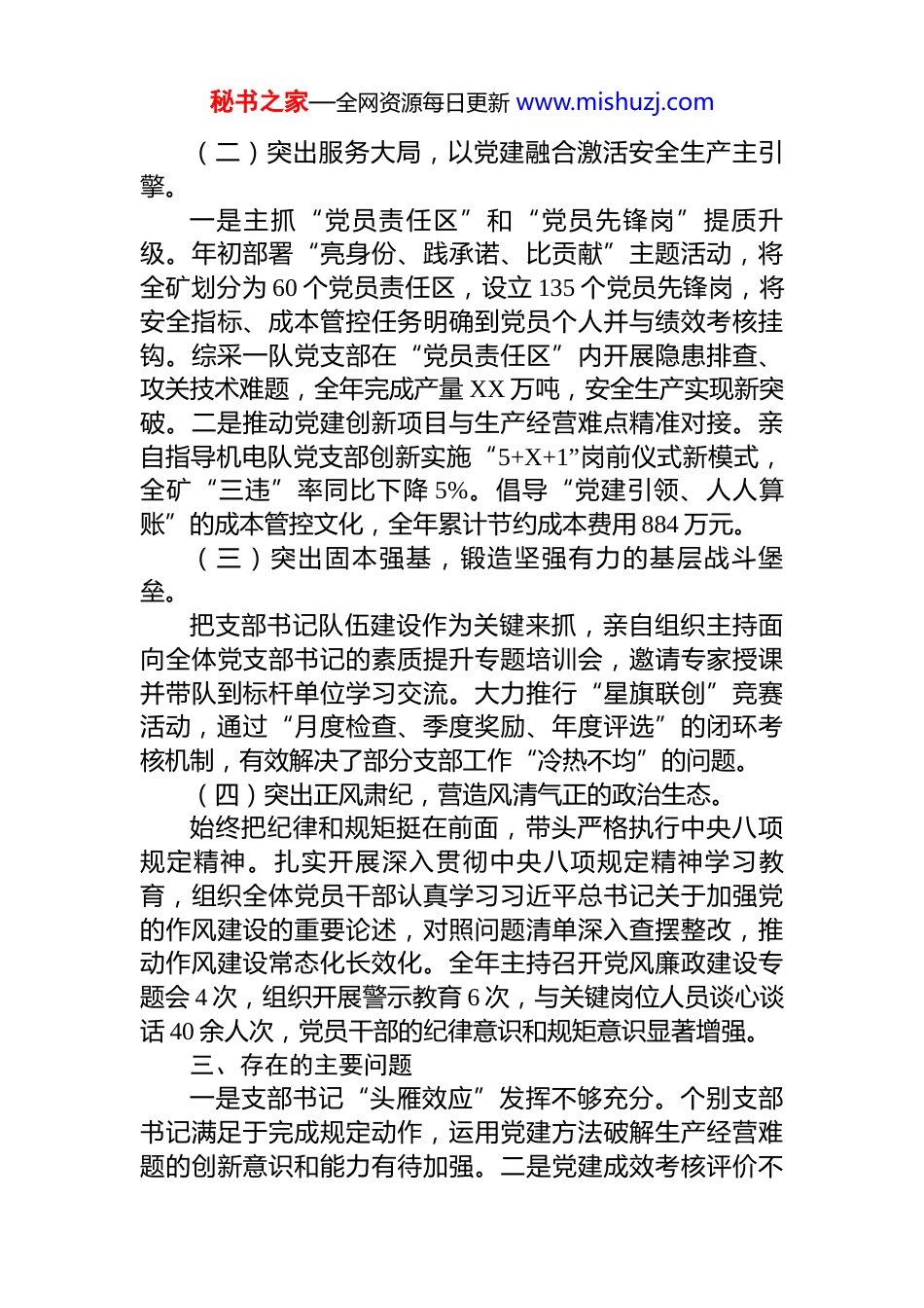 秘书之家—全网资源每日更新 www.mishuzj.comXX 煤矿委员会党委书记 2025 年度抓基层党建工作述职报告各位领导、同志们:根据会议安排,现将本人 2025 年度抓基层党建工作情况述职如下,请予评议。一、上年度查摆问题整改落实情况针对上年度述职评议中指出的“理论学习研讨不够深入”和“个别支部活动形式较为单一”等问题,我牵头制定了专项整改方案。通过建立“第一议题”学习督办和“书记讲堂”常态化机制,理论学习的深度与效果得到显著提升。同时,我主导推广了“党建+项目”工作法,引导支部围绕安全生产、技术攻关等开展主题实践活动,有效解决了活动形式与业务工作贴合不紧密的问题。目前,以上问题已全部整改到位并长期坚持。二、履职抓党建工作情况2025 年,我始终牢记第一责任人职责,深入学习贯彻党的二十届四中全会精神,严格执行中央八项规定,聚焦主责主业,坚持以高质量党建引领和保障矿井高质量发展。(一)突出政治引领,将党的领导深度融入公司治理。一是牵头修订《XX 煤矿党委会议事规则》及党委前置研究讨论重大事项清单,将涉及矿井安全生产、重大技术改造、重要人事任免等 30 余项内容全部纳入清单,厘清了党委会与董事会、经理层的权责边界。二是亲自督办“三重一大”决策执行情况,建立跟踪督办机制,每季度主持召开专题会议听取汇报,确保党委的决策意图不折不扣地贯彻到生产经营的“最后一公里”。秘书之家—全网资源每日更新 www.mishuzj.com(二)突出服务大局,以党建融合激活安全生产主引擎。一是主抓“党员责任区”和“党员先锋岗”提质升级。年初部署“亮身份、践承诺、比贡献”主题活动,将全矿划分为 60 个党员责任区,设立 135 个党员先锋岗,将安全指标、成本管控任务明确到党员个人并与绩效考核挂钩。综采一队党支部在“党员责任区”内开展隐患排查、攻关技术难题,全年完成产量 XX 万吨,安全生产实现新突破。二是推动党建创新项目与生产经营难点精准对接。亲自指导机电队党支部创新实施“5+X+1”岗前仪式新模式,全矿“三违”率同比下降 5%。倡导“党建引领、人人算账”的成本管控文化,全年累计节约成本费用 884 万元。(三)突出固本强基,锻造坚强有力的基层战斗堡垒。把支部书记队伍建设作为关键来抓,亲自组织主持面向全体党支部书记的素质提升专题培训会,邀请专家授课并带队到标杆单位学习交流。大力推行“星旗联创”竞赛活动,通过“月度检查、季度奖励、年度评选”的闭环考核机制,有效解决了部分支部工作“冷热不均”的问题。(四)突出正风肃纪,营造风清气正的政治生态。始终把纪律和规矩挺在前面,带头严格执行中央八项规定精神。扎实开展深入贯彻中央八项规定精神学习教育,组织全体党员干部认真学习习近平总书记关于加强党的作风建设的重要论述,对照问题清单深入查摆整改,推动作风建设常态化长效化。全年主持召开党风廉政建设专题会 4 次,组织开展警示教育 6 次,与关键岗位人员谈心谈话 40 余人次,党员干部的纪律意识和规矩意识显著增强。三、存在的主要问题一是支部书记“头雁效应”发挥不够充分。个别支部书记满足于完成规定动作,运用党建方法破解生产经营难题的创新意识和能力有待加强。二是党建成效考核评价不秘书之家—全网资源每日更新 www.mishuzj.com够精准。现行考核体系在衡量党建工作对安全生产、降本增效等中心工作的具体贡献度上穿透力不强,存在“两张皮”现象的风险。三是党建工作信息化建设存在短板。与矿井智能化建设步伐相比,党建工作手段和载体还比较传统,未能充分运用数字化工具为基层党建赋能减负。四、下一步工作思路和改进措施针对以上问题,我将认真履行第一责任人职责,重点从三个方面抓好改进提升:一是实施“头雁领航”书记项目。从 2026 年起全面推行“支部书记领办项目”制度,组织各支部书记围绕安全生产薄弱环节、成本管控重点领域,每人申报 1-2 个“书记项目”,建立“季调度、半年评、年终考”机制,将项目完成情况作为支部书记评优评先、提拔使用的重要依据。二是构建“价值穿透”考评体系。牵头对现有党建考核体系进行系统重塑,将考核重点从...
