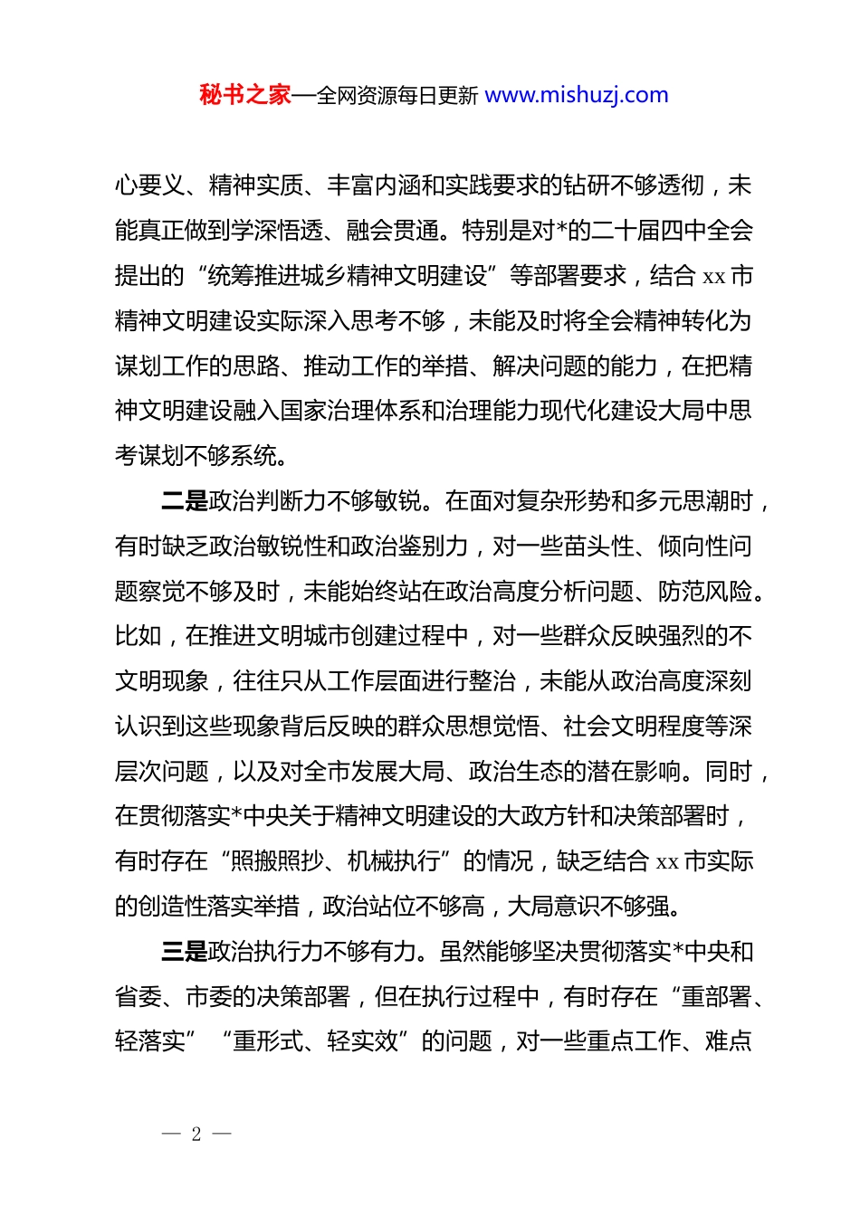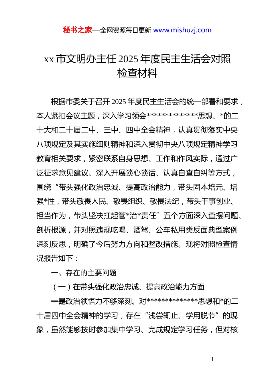 秘书之家—全网资源每日更新 www.mishuzj.comxx 市文明办主任 2025 年度民主生活会对照检查材料根据市委关于召开 2025 年度民主生活会的统一部署和要求,本人紧扣会议主题,深入学习领会**************思想、*的二十大和二十届二中、三中、四中全会精神,认真贯彻落实中央八项规定及其实施细则精神和深入贯彻中央八项规定精神学习教育相关要求,紧密联系自身思想、工作和作风实际,通过广泛征求意见建议、深入开展谈心谈话、认真自查自纠等方式,围绕“带头强化政治忠诚、提高政治能力,带头固本培元、增强*性,带头敬畏人民、敬畏组织、敬畏法纪,带头干事创业、担当作为,带头坚决扛起管*治*责任”五个方面深入查摆问题、剖析根源,并对照违规吃喝、酒驾、公车私用类反面典型案例深刻反思,明确了今后努力方向和整改措施。现将对照检查情况报告如下:一、存在的主要问题(一)在带头强化政治忠诚、提高政治能力方面一是政治领悟力不够深刻。对**************思想和*的二十届四中全会精神的学习,存在“浅尝辄止、学用脱节”的现象,虽然能够按时参加集中学习、完成规定学习任务,但对核— 1 —秘书之家—全网资源每日更新 www.mishuzj.com心要义、精神实质、丰富内涵和实践要求的钻研不够透彻,未能真正做到学深悟透、融会贯通。特别是对*的二十届四中全会提出的“统筹推进城乡精神文明建设”等部署要求,结合 xx 市精神文明建设实际深入思考不够,未能及时将全会精神转化为谋划工作的思路、推动工作的举措、解决问题的能力,在把精神文明建设融入国家治理体系和治理能力现代化建设大局中思考谋划不够系统。二是政治判断力不够敏锐。在面对复杂形势和多元思潮时,有时缺乏政治敏锐性和政治鉴别力,对一些苗头性、倾向性问题察觉不够及时,未能始终站在政治高度分析问题、防范风险。比如,在推进文明城市创建过程中,对一些群众反映强烈的不文明现象,往往只从工作层面进行整治,未能从政治高度深刻认识到这些现象背后反映的群众思想觉悟、社会文明程度等深层次问题,以及对全市发展大局、政治生态的潜在影响。同时,在贯彻落实*中央关于精神文明建设的大政方针和决策部署时,有时存在“照搬照抄、机械执行”的情况,缺乏结合 xx 市实际的创造性落实举措,政治站位不够高,大局意识不够强。三是政治执行力不够有力。虽然能够坚决贯彻落实*中央和省委、市委的决策部署,但在执行过程中,有时存在“重部署、轻落实”“重形式、轻实效”的问题,对一些重点工作、难点— 2 —秘书之家—全网资源每日更新 www.mishuzj.com任务,部署安排多、跟踪问效少,推动落实的力度不够、措施不够具体,导致部分工作推进缓慢、成效不够明显。比如,在深入贯彻中央八项规定精神学习教育中,虽然牵头制定了学习教育方案、组织了集中学习,但对学习教育的落实情况跟踪督导不够严格,对部分干部学习不深入、领会不透彻、践行不到位的问题,未能及时采取有效措施督促整改,导致学习教育成效不够显著。同时,在推动精神文明建设各项工作落地见效时,有时存在“虎头蛇尾”的情况,缺乏一抓到底、务求实效的韧劲和决心。(二)在带头固本培元、增强*性方面本人始终坚持把政治修养摆在*性修养的首位,自觉以**************思想凝心铸魂,认真学习*章*规 dj,努力坚守共产*人精神追求,解决好世界观、人生观、价值观这个总开关问题。但对照坚持把政治修养摆在*性修养的首位、坚守共产*人精神追求、筑牢对*忠诚、厚植为民情怀、保持清正廉洁的更高要求,仍存在一些差距和不足。一是理论学习不够扎实。对**************思想的学习,存在“被动学习、应付学习”的现象,缺乏主动学习、深入钻研的自觉性和主动性。平时忙于日常事务性工作,静下心来系统学习的时间较少,学习多以通读原文、摘抄笔记为主,缺乏— 3 —秘书之家—全网资源每日更新 www.mishuzj.com对理论知识的深入思考和实践运用,未能真正做到学思用贯通、知信行统一。特别是对*章*规 dj 的学习,不够系统全面,对一些新修订的*章*规 dj,学习不够及时、领会不够深刻,未能始终用*章*规 dj 规范自己的言行举止,在*性修养...