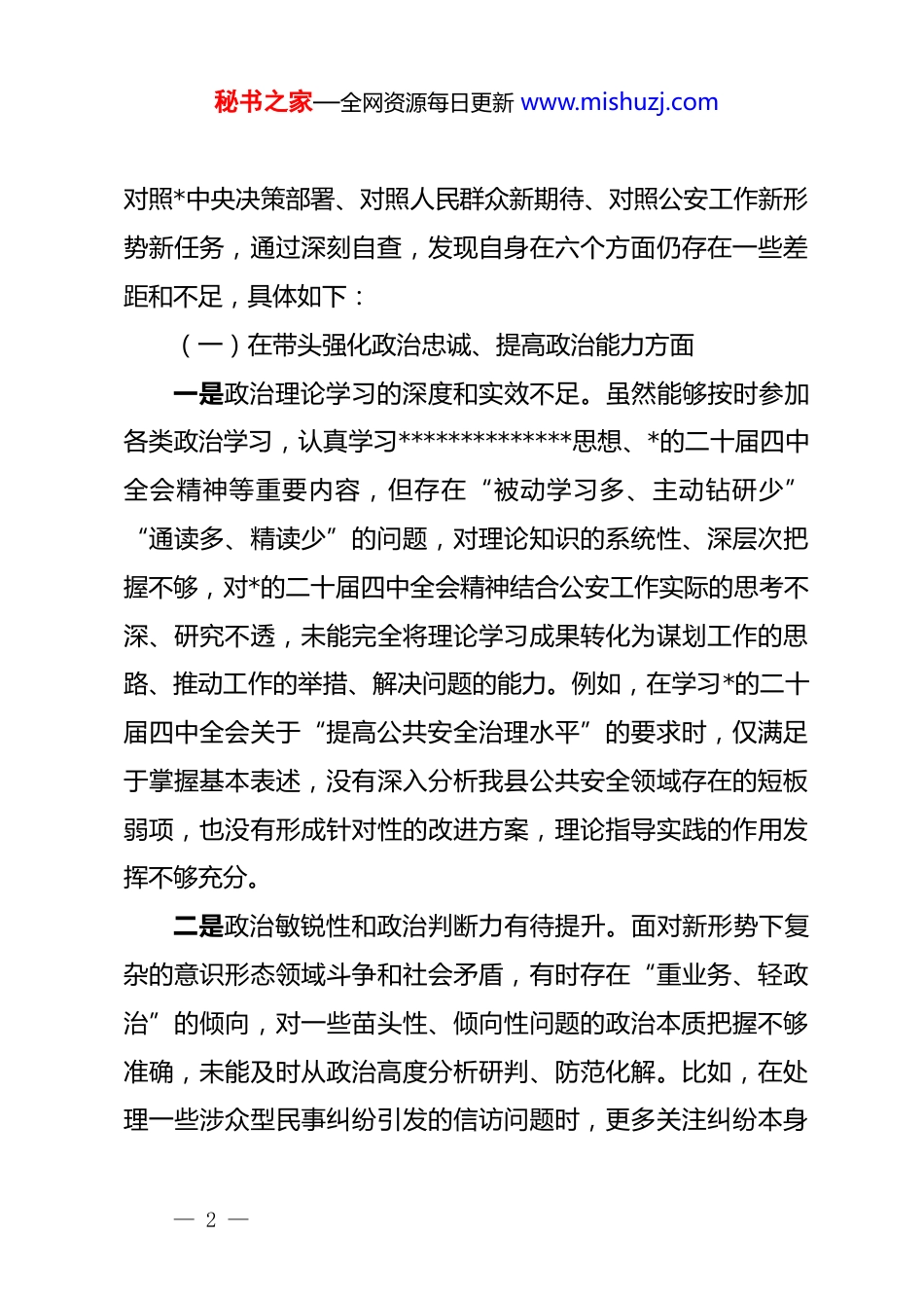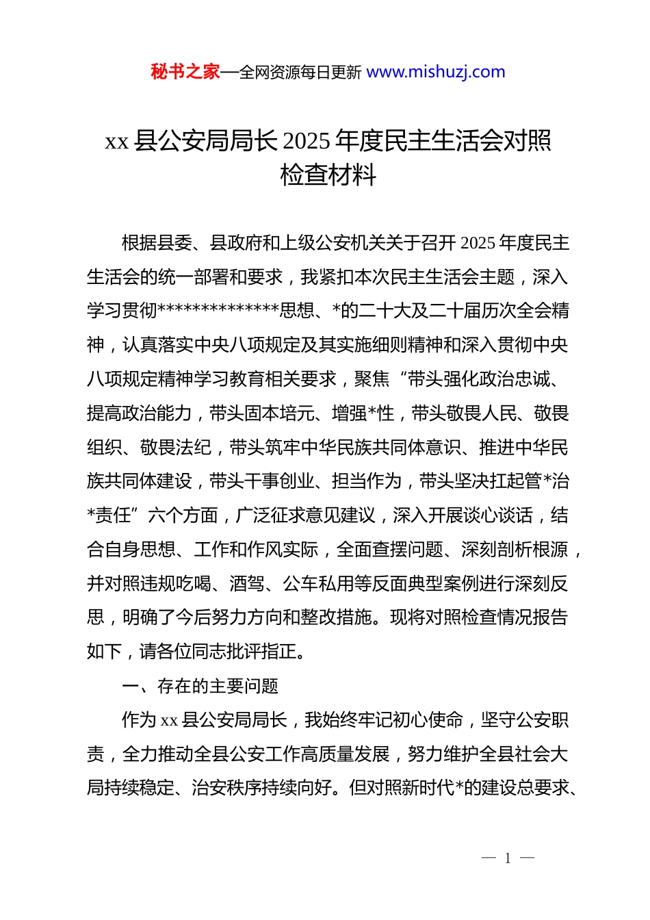秘书之家—全网资源每日更新 www.mishuzj.comxx 县公安局局长 2025 年度民主生活会对照检查材料根据县委、县政府和上级公安机关关于召开 2025 年度民主生活会的统一部署和要求,我紧扣本次民主生活会主题,深入学习贯彻**************思想、*的二十大及二十届历次全会精神,认真落实中央八项规定及其实施细则精神和深入贯彻中央八项规定精神学习教育相关要求,聚焦“带头强化政治忠诚、提高政治能力,带头固本培元、增强*性,带头敬畏人民、敬畏组织、敬畏法纪,带头筑牢中华民族共同体意识、推进中华民族共同体建设,带头干事创业、担当作为,带头坚决扛起管*治*责任”六个方面,广泛征求意见建议,深入开展谈心谈话,结合自身思想、工作和作风实际,全面查摆问题、深刻剖析根源,并对照违规吃喝、酒驾、公车私用等反面典型案例进行深刻反思,明确了今后努力方向和整改措施。现将对照检查情况报告如下,请各位同志批评指正。一、存在的主要问题作为 xx 县公安局局长,我始终牢记初心使命,坚守公安职责,全力推动全县公安工作高质量发展,努力维护全县社会大局持续稳定、治安秩序持续向好。但对照新时代*的建设总要求、— 1 —秘书之家—全网资源每日更新 www.mishuzj.com对照*中央决策部署、对照人民群众新期待、对照公安工作新形势新任务,通过深刻自查,发现自身在六个方面仍存在一些差距和不足,具体如下:(一)在带头强化政治忠诚、提高政治能力方面一是政治理论学习的深度和实效不足。虽然能够按时参加各类政治学习,认真学习**************思想、*的二十届四中全会精神等重要内容,但存在“被动学习多、主动钻研少”“通读多、精读少”的问题,对理论知识的系统性、深层次把握不够,对*的二十届四中全会精神结合公安工作实际的思考不深、研究不透,未能完全将理论学习成果转化为谋划工作的思路、推动工作的举措、解决问题的能力。例如,在学习*的二十届四中全会关于“提高公共安全治理水平”的要求时,仅满足于掌握基本表述,没有深入分析我县公共安全领域存在的短板弱项,也没有形成针对性的改进方案,理论指导实践的作用发挥不够充分。二是政治敏锐性和政治判断力有待提升。面对新形势下复杂的意识形态领域斗争和社会矛盾,有时存在“重业务、轻政治”的倾向,对一些苗头性、倾向性问题的政治本质把握不够准确,未能及时从政治高度分析研判、防范化解。比如,在处理一些涉众型民事纠纷引发的信访问题时,更多关注纠纷本身— 2 —秘书之家—全网资源每日更新 www.mishuzj.com的化解,对背后可能存在的政治风险警惕性不足,没有充分认识到此类问题如果处置不当,可能影响社会稳定、损害*的形象,缺乏前瞻性和主动性。三是贯彻落实*中央大政方针和决策部署的执行力不够强。在推动上级决策部署落地见效过程中,有时存在“照搬照抄、机械执行”的情况,结合我县公安工作实际创造性开展工作不够,存在“上热中温下冷”的现象。例如,在落实上级关于常态化开展扫黑除恶斗争的部署要求时,虽然制定了工作方案、召开了动员会议,但在具体推进过程中,对一些重点领域、重点行业的排查整治不够深入,对黑恶势力“保护伞”的线索摸排不够细致,导致部分工作成效未达预期,未能完全将*中央的决策部署转化为维护全县社会治安稳定的实际成效。同时,在保持战略定力、增强必胜信心方面,面对公安工作中的难点堵点问题,有时会出现畏难情绪,缺乏“逢山开路、遇水架桥”的闯劲和韧劲。(二)在带头固本培元、增强*性方面一是理想信念的坚定性有待进一步强化。虽然能够始终坚守共产*人的理想信念,但在面对各种诱惑和考验时,有时会出现思想松懈的情况,对理想信念的内涵理解不够深刻,缺乏持之以恒的锤炼。例如,在日常工作中,有时会注重业务指标的— 3 —秘书之家—全网资源每日更新 www.mishuzj.com完成,忽视了理想信念的持续提升,没有经常对照*章*规 dj 检视自身的思想和行为,对“为中国人民谋幸福、为中华民族谋复兴”的初心使命感悟不够深刻,*性修养的自觉性不够强。二是*章*规 dj 学习不够深入扎实。在学习*章*规 dj 过程中,存在“浅尝辄止、学用脱节...