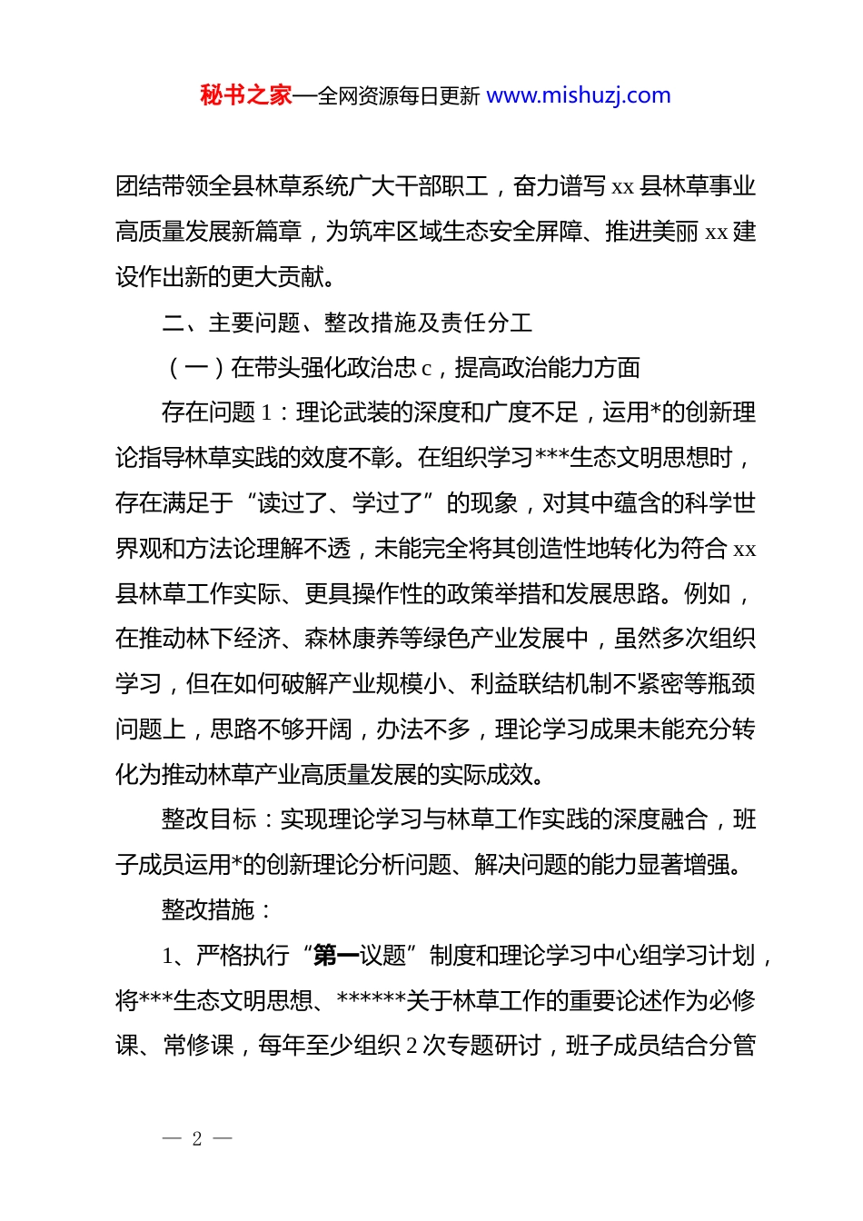 秘书之家—全网资源每日更新 www.mishuzj.comxx 县林草局 2025 年度民主生活会暨以案促改促治专题民主生活会整改方案为深入贯彻落实**************思想和*的二十届三中、四中全会精神,根据县委关于开好 2025 年度民主生活会的统一部署,xx 县林草局*组于 2026 年 1 月 20 日召开了 2025 年度民主生活会暨以案促改促治专题民主生活会。会议紧扣主题,领导班子及成员深入查摆了在政治忠诚、*性修养、宗旨意识、担当作为、管*治*等方面存在的突出问题,深刻剖析了反面典型案例的根源与教训,并明确了今后的努力方向。为确保查摆出的问题不折不扣整改到位,推动全面从严治*向纵深发展,巩固和拓展林草系统风清气正的政治生态,特制定本整改方案。一、总体要求坚持以**************思想为指导,深刻领悟“两个确立”的决定性意义,增强“四个意识”、坚定“四个自信”、做到“两个维护”。以此次民主生活会查摆的问题整改和以案促改促治为契机,坚持问题导向、目标导向和结果导向相统一,将“当下改”与“长久立”相结合,以刀刃向内的自我革命精神,逐项抓好整改落实。通过扎实有效的整改,切实加强局领导班子自身建设,提升政治判断力、政治领悟力、政治执行力,— 1 —秘书之家—全网资源每日更新 www.mishuzj.com团结带领全县林草系统广大干部职工,奋力谱写 xx 县林草事业高质量发展新篇章,为筑牢区域生态安全屏障、推进美丽 xx 建设作出新的更大贡献。二、主要问题、整改措施及责任分工(一)在带头强化政治忠 c,提高政治能力方面存在问题 1:理论武装的深度和广度不足,运用*的创新理论指导林草实践的效度不彰。在组织学习***生态文明思想时,存在满足于“读过了、学过了”的现象,对其中蕴含的科学世界观和方法论理解不透,未能完全将其创造性地转化为符合 xx县林草工作实际、更具操作性的政策举措和发展思路。例如,在推动林下经济、森林康养等绿色产业发展中,虽然多次组织学习,但在如何破解产业规模小、利益联结机制不紧密等瓶颈问题上,思路不够开阔,办法不多,理论学习成果未能充分转化为推动林草产业高质量发展的实际成效。整改目标:实现理论学习与林草工作实践的深度融合,班子成员运用*的创新理论分析问题、解决问题的能力显著增强。整改措施:1、严格执行“第一议题”制度和理论学习中心组学习计划,将***生态文明思想、******关于林草工作的重要论述作为必修课、常修课,每年至少组织 2 次专题研讨,班子成员结合分管— 2 —秘书之家—全网资源每日更新 www.mishuzj.com工作撰写心得体会或调研报告。2、围绕全县林草工作重点难点,如松材线虫病防治、草原生态修复、林长制效能提升等,每年确定 1 至 2 个重点调研课题,班子成员带头深入国有林场、田间地头、涉林企业开展“解剖麻雀”式调研,形成高质量调研成果,推动解决实际问题。3、邀请省市专家学者,就现代林业产业发展、生态产品价值实现机制等前沿理论和实践进行专题辅导,开阔班子成员视野,更新知识结构。责任领导:局*组书记责任股室:办公室、人事股完成时限:立行立改并长期坚持存在问题 2:政治判断的敏锐性和风险防范的敏感度不足。对林草领域潜在的风险挑战,从政治上观察、分析和判断的能力有待加强。面对日益复杂的森林草原防火形势、破坏森林资源违法犯罪行为等,有时对一些苗头性、倾向性问题背后的政治危害性认识不深刻,缺乏“时时放心不下”的责任感。在处理涉及林地、草原权属纠纷等敏感问题时,虽能守住不发生重大风险的底线,但对事件背后的深层次原因洞察不够,应急处置预案的精细化程度不高。— 3 —秘书之家—全网资源每日更新 www.mishuzj.com整改目标:增强政治敏锐性和鉴别力,完善林草领域风险防范化解机制,坚决守住生态安全底线。整改措施:1、建立健全林草领域风险研判机制,每季度召开一次风险形势分析会,重点围绕森林防火、有害生物、乱砍滥伐、非法占用林地草地等风险点进行分析预判,制定防范措施。2、加强网络舆情监测,对涉及林草工作的负面信息、错误言论,做到早发现、早研判、早处置,主动发声,坚决斗争。3.修订完善森林...