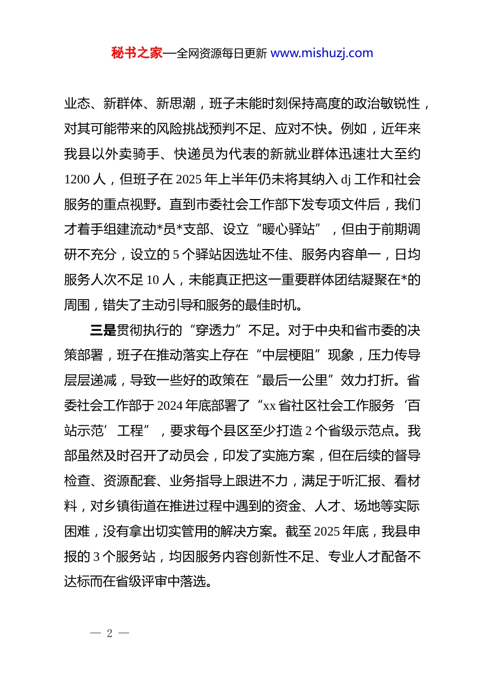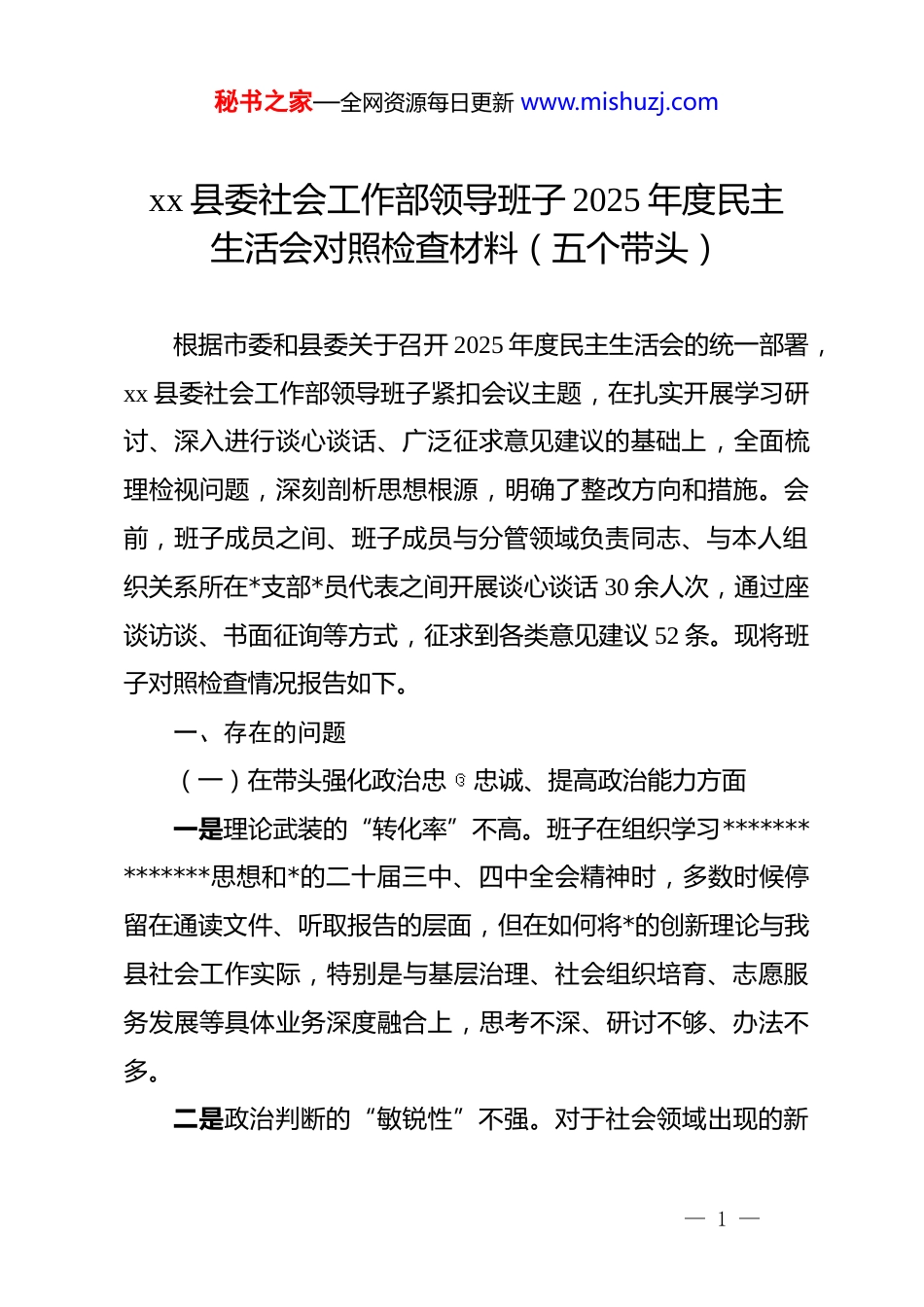 秘书之家—全网资源每日更新 www.mishuzj.comxx 县委社会工作部领导班子 2025 年度民主生活会对照检查材料(五个带头)根据市委和县委关于召开 2025 年度民主生活会的统一部署,xx 县委社会工作部领导班子紧扣会议主题,在扎实开展学习研讨、深入进行谈心谈话、广泛征求意见建议的基础上,全面梳理检视问题,深刻剖析思想根源,明确了整改方向和措施。会前,班子成员之间、班子成员与分管领域负责同志、与本人组织关系所在*支部*员代表之间开展谈心谈话 30 余人次,通过座谈访谈、书面征询等方式,征求到各类意见建议 52 条。现将班子对照检查情况报告如下。一、存在的问题(一)在带头强化政治忠 ઉ忠诚、提高政治能力方面一是理论武装的“转化率”不高。班子在组织学习**************思想和*的二十届三中、四中全会精神时,多数时候停留在通读文件、听取报告的层面,但在如何将*的创新理论与我县社会工作实际,特别是与基层治理、社会组织培育、志愿服务发展等具体业务深度融合上,思考不深、研讨不够、办法不多。二是政治判断的“敏锐性”不强。对于社会领域出现的新— 1 —秘书之家—全网资源每日更新 www.mishuzj.com业态、新群体、新思潮,班子未能时刻保持高度的政治敏锐性,对其可能带来的风险挑战预判不足、应对不快。例如,近年来我县以外卖骑手、快递员为代表的新就业群体迅速壮大至约1200 人,但班子在 2025 年上半年仍未将其纳入 dj 工作和社会服务的重点视野。直到市委社会工作部下发专项文件后,我们才着手组建流动*员*支部、设立“暖心驿站”,但由于前期调研不充分,设立的 5 个驿站因选址不佳、服务内容单一,日均服务人次不足 10 人,未能真正把这一重要群体团结凝聚在*的周围,错失了主动引导和服务的最佳时机。三是贯彻执行的“穿透力”不足。对于中央和省市委的决策部署,班子在推动落实上存在“中层梗阻”现象,压力传导层层递减,导致一些好的政策在“最后一公里”效力打折。省委社会工作部于 2024 年底部署了“xx 省社区社会工作服务‘百站示范’工程”,要求每个县区至少打造 2 个省级示范点。我部虽然及时召开了动员会,印发了实施方案,但在后续的督导检查、资源配套、业务指导上跟进不力,满足于听汇报、看材料,对乡镇街道在推进过程中遇到的资金、人才、场地等实际困难,没有拿出切实管用的解决方案。截至 2025 年底,我县申报的 3 个服务站,均因服务内容创新性不足、专业人才配备不达标而在省级评审中落选。— 2 —秘书之家—全网资源每日更新 www.mishuzj.com(二)在带头固本培元、增强*性方面一是理想信念的“总开关”拧得不紧。面对新时代社会工作繁重复杂的任务,班子成员中不同程度地滋生了“求稳怕乱”的心态,艰苦奋斗、攻坚克难的革命锐气有所消减。在谋划 2025 年全县社会工作要点时,对于一些需要大胆创新、可能存在风险的改革项目,如探索通过政府购买服务方式,引入专业社会组织承接农村留守儿童关爱保护项目,班子内部讨论时,有同志便以“财政紧张、监管难度大、容易出问题”为由提议暂缓,最终该项工作被替换为传统的送温暖、送慰问活动,满足于“干了”而不是追求“干好”,共产*人应有的精神追求和奋斗姿态有所弱化。二是*性修养的“日常功”做得不实。在严格执行*的组织生活制度上,存在重形式、轻内容的倾向。虽然“三会一课”、组织生活会、主题*日等活动均按时开展,但有时满足于完成“规定动作”,在提升活动质量、增强*性锻炼的“实效”上用心不足。2025 年 7 月,在一次以学习*章为主题的支部*员大会上,个别班子成员的发言材料还是由办公室代笔的通用稿,内容空洞,脱离自身思想和工作实际,没有真正把自己摆进去,把批评和自我批评的武器用好用足,使得本应“红脸出汗”的组织生活会,开成了“汇报工作会”。— 3 —秘书之家—全网资源每日更新 www.mishuzj.com三是纪律规矩的“敬畏心”树得不牢。对*章*规 dj 的学习不够深入系统,未能完全内化为行为准则。在日常工作中,对于一些看似“微小”的违规违纪苗头性问题,有时碍于情面,没有及时“咬耳扯袖”,存在“好人...