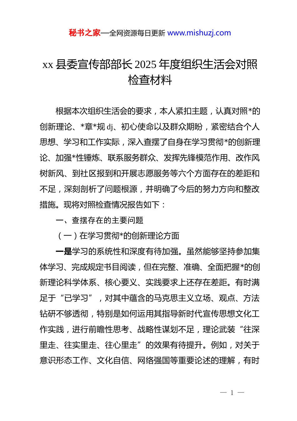 秘书之家—全网资源每日更新 www.mishuzj.comxx 县委宣传部部长 2025 年度组织生活会对照检查材料根据本次组织生活会的要求,本人紧扣主题,认真对照*的创新理论、*章*规 dj、初心使命以及群众期盼,紧密结合个人思想、学习和工作实际,深入查摆了自身在学习贯彻*的创新理论、加强*性锤炼、联系服务群众、发挥先锋模范作用、改作风树新风、到社区报到和开展志愿服务等六个方面存在的差距和不足,深刻剖析了问题根源,并明确了今后的努力方向和整改措施。现将对照检查情况报告如下:一、查摆存在的主要问题(一)在学习贯彻*的创新理论方面一是学习的系统性和深度有待加强。虽然能够坚持参加集体学习、完成规定书目阅读,但在完整、准确、全面把握*的创新理论科学体系、核心要义、实践要求上还存在差距。有时满足于“已学习”,对其中蕴含的马克思主义立场、观点、方法钻研不够透彻,特别是如何运用其指导新时代宣传思想文化工作实践,进行前瞻性思考、战略性谋划不足,理论武装“往深里走、往实里走、往心里走”的效果有待提升。例如,对关于意识形态工作、文化自信、网络强国等重要论述的理解,有时— 1 —秘书之家—全网资源每日更新 www.mishuzj.com停留在概念层面,转化为清晰的工作思路和有效举措不够及时、有力。二是学用结合不够紧密。存在一定的理论学习和实际工作“两张皮”现象。将*的创新理论蕴含的立场观点方法,创造性地运用到破解全县宣传思想工作难题、应对风险挑战上的能力有待提高。比如,在面对当前复杂严峻的意识形态领域斗争时,有时习惯于沿用传统思维和方式,运用新思想新理论分析研判形势、创新工作方法、主动设置议题、有效引导舆论的意识和能力尚显不足,导致一些工作的预见性、针对性、实效性不够强。(二)在加强*性锤炼方面一是*性修养的自觉性、主动性有所减弱。随着工作年限增长,有时不自觉地放松了对主观世界的持续改造,对照*章*规dj 进行自我检视、自我净化、自我提高的主动性和频率不够。在严格执行*内政治生活准则、发扬斗争精神、增强斗争本领方面,标准有所降低,自我要求有所松懈,未能时时刻刻以高标准、严要求来锤炼*性。二是艰苦奋斗、攻坚克难的锐气有所消退。面对宣传思想文化领域一些长期存在的难点、堵点问题,有时存在畏难情绪或“等一等、看一看”的想法,缺乏“啃硬骨头”的决心和— 2 —秘书之家—全网资源每日更新 www.mishuzj.com“钉钉子”的精神。在推动融媒体深度融合发展、壮大主流舆论阵地、提升文化软实力等重点工作上,虽然投入了精力,但攻坚克难、一抓到底的韧劲和狠劲还需加强,艰苦奋斗、勤俭办一切事业的思想根基有待进一步夯实。(三)在联系服务群众方面一是深入基层调研不够扎实。存在“事务主义”倾向,坐在办公室听汇报、看材料的时间相对较多,真正“扑下身子、沉到一线”,与基层群众面对面交流、心贴心沟通做得不够。调研有时存在“走马观花”、预设路线的情况,对群众在精神文化需求、精神文明建设、基层宣传阵地建设等方面的所思所想所盼,掌握得不够全面、精准、鲜活,导致制定政策、策划活动、提供服务时,与群众的实际需求有时存在偏差。二是解决群众急难愁盼问题的力度有待加大。虽然能够关注并推动解决一些群众反映的文化生活单一、网络谣言侵扰等问题,但主动发现问题、系统解决问题的意识和能力还需提升。对于群众反映的一些涉及深层次体制机制或需要多方协调的难题,有时跟进协调不够紧,推动解决的成效不够显著,距离“群众满意”的标准还有差距。在利用宣传资源服务群众、赋能基层治理方面,思路和举措还可以更开阔、更有效。(四)在发挥先锋模范作用方面(包括在网络空间发挥作— 3 —秘书之家—全网资源每日更新 www.mishuzj.com用情况)一是立足岗位创先争优的标准不够高。对照先进典型,有时觉得自己工作按部就班完成了,但在精益求精、追求卓越方面还有不足。在理论宣讲创新、文明实践活动品牌打造、对外宣传影响力提升等方面,主动对标一流、争创一流的劲头有所不足,满足于“过得去”,未能时时处处起到“走在前、作表率”的标杆作用。二是在网络空间发挥引领作用不...