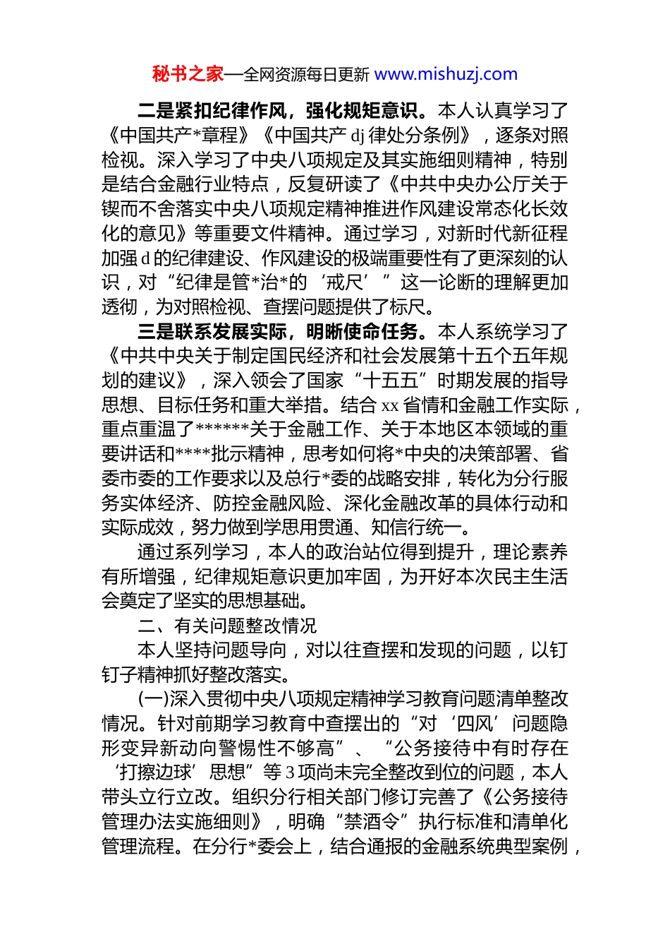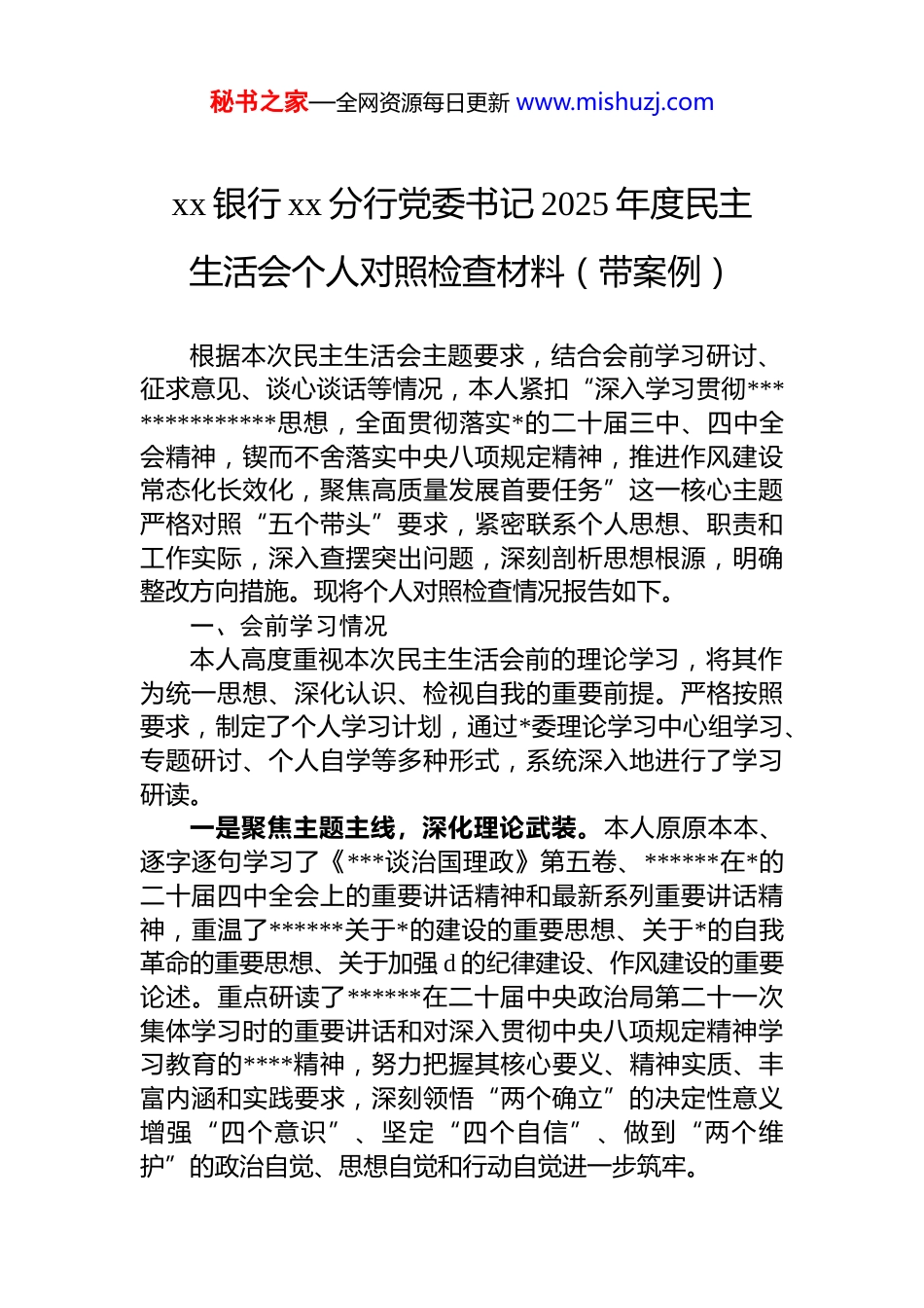秘书之家—全网资源每日更新 www.mishuzj.comxx 银行 xx 分行党委书记 2025 年度民主生活会个人对照检查材料(带案例)根据本次民主生活会主题要求,结合会前学习研讨、征求意见、谈心谈话等情况,本人紧扣“深入学习贯彻**************思想,全面贯彻落实*的二十届三中、四中全会精神,锲而不舍落实中央八项规定精神,推进作风建设常态化长效化,聚焦高质量发展首要任务”这一核心主题严格对照“五个带头”要求,紧密联系个人思想、职责和工作实际,深入查摆突出问题,深刻剖析思想根源,明确整改方向措施。现将个人对照检查情况报告如下。一、会前学习情况本人高度重视本次民主生活会前的理论学习,将其作为统一思想、深化认识、检视自我的重要前提。严格按照要求,制定了个人学习计划,通过*委理论学习中心组学习、专题研讨、个人自学等多种形式,系统深入地进行了学习研读。一是聚焦主题主线,深化理论武装。本人原原本本、逐字逐句学习了《***谈治国理政》第五卷、******在*的二十届四中全会上的重要讲话精神和最新系列重要讲话精神,重温了******关于*的建设的重要思想、关于*的自我革命的重要思想、关于加强 d 的纪律建设、作风建设的重要论述。重点研读了******在二十届中央政治局第二十一次集体学习时的重要讲话和对深入贯彻中央八项规定精神学习教育的****精神,努力把握其核心要义、精神实质、丰富内涵和实践要求,深刻领悟“两个确立”的决定性意义增强“四个意识”、坚定“四个自信”、做到“两个维护”的政治自觉、思想自觉和行动自觉进一步筑牢。秘书之家—全网资源每日更新 www.mishuzj.com二是紧扣纪律作风,强化规矩意识。本人认真学习了《中国共产*章程》《中国共产 dj 律处分条例》,逐条对照检视。深入学习了中央八项规定及其实施细则精神,特别是结合金融行业特点,反复研读了《中共中央办公厅关于锲而不舍落实中央八项规定精神推进作风建设常态化长效化的意见》等重要文件精神。通过学习,对新时代新征程加强 d 的纪律建设、作风建设的极端重要性有了更深刻的认识,对“纪律是管*治*的‘戒尺’”这一论断的理解更加透彻,为对照检视、查摆问题提供了标尺。三是联系发展实际,明晰使命任务。本人系统学习了《中共中央关于制定国民经济和社会发展第十五个五年规划的建议》,深入领会了国家“十五五”时期发展的指导思想、目标任务和重大举措。结合 xx 省情和金融工作实际,重点重温了******关于金融工作、关于本地区本领域的重要讲话和****批示精神,思考如何将*中央的决策部署、省委市委的工作要求以及总行*委的战略安排,转化为分行服务实体经济、防控金融风险、深化金融改革的具体行动和实际成效,努力做到学思用贯通、知信行统一。通过系列学习,本人的政治站位得到提升,理论素养有所增强,纪律规矩意识更加牢固,为开好本次民主生活会奠定了坚实的思想基础。二、有关问题整改情况本人坚持问题导向,对以往查摆和发现的问题,以钉钉子精神抓好整改落实。(一)深入贯彻中央八项规定精神学习教育问题清单整改情况。针对前期学习教育中查摆出的“对‘四风’问题隐形变异新动向警惕性不够高”、“公务接待中有时存在‘打擦边球’思想”等 3 项尚未完全整改到位的问题,本人带头立行立改。组织分行相关部门修订完善了《公务接待管理办法实施细则》,明确“禁酒令”执行标准和清单化管理流程。在分行*委会上,结合通报的金融系统典型案例,秘书之家—全网资源每日更新 www.mishuzj.com专题剖析“四风”问题新表现,要求班子成员对分管领域进行排查。目前,3 项问题均已整改销号,并通过建章立制巩固成效。(二)2024 年度民主生活会查摆问题整改情况。上年度民主生活会,本人共查摆出 5 个方面 12 个具体问题。截至目前,已整改完成 10 项。剩余 2 项为长期坚持整改事项:一是“运用*的创新理论指导金融实践创新的能力有待持续提升”,已通过建立分行*委“第一议题”学习转化机制,将学习成果纳入年度重点课题调研和战略规划修订;二是“深入基层一线解决员工急难愁盼问题的频次和深度需进一步加强”,已在 2025 年工作计划中明确每...