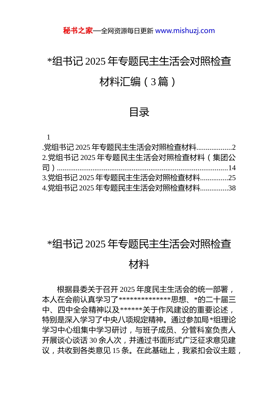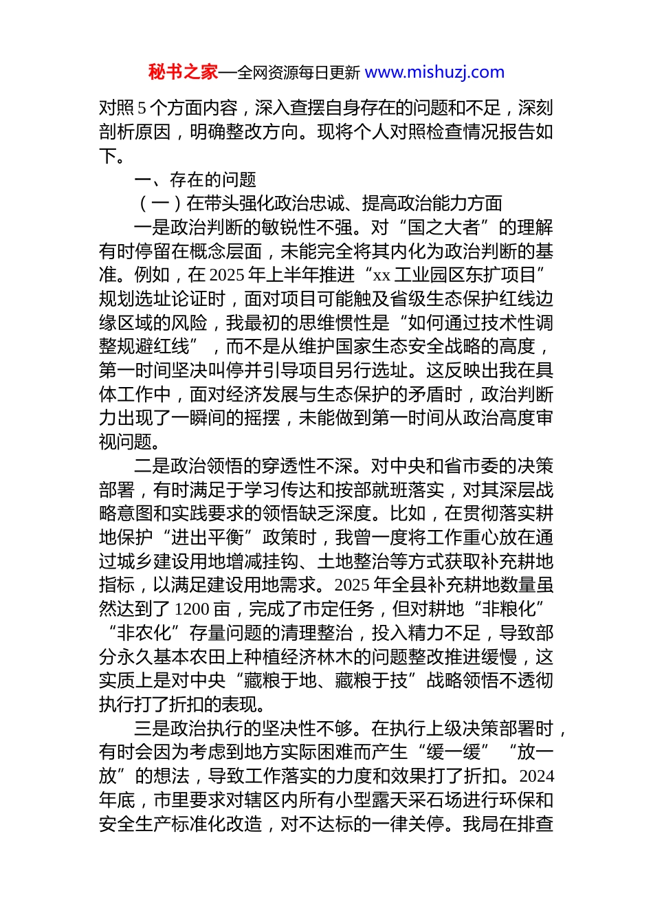 秘书之家—全网资源每日更新 www.mishuzj.com*组书记 2025 年专题民主生活会对照检查材料汇编(3 篇)目录1.党组书记 2025 年专题民主生活会对照检查材料...................22.党组书记 2025 年专题民主生活会对照检查材料(集团公司)...........................................................................................143.党组书记 2025 年专题民主生活会对照检查材料...............254.党组书记 2025 年专题民主生活会对照检查材料...............38*组书记 2025 年专题民主生活会对照检查材料根据县委关于召开 2025 年度民主生活会的统一部署,本人在会前认真学习了**************思想、*的二十届三中、四中全会精神以及******关于作风建设的重要论述,特别是深入学习了中央八项规定精神。通过参加局*组理论学习中心组集中学习研讨,与班子成员、分管科室负责人开展谈心谈话 30 余人次,并通过书面形式广泛征求意见建议,共收到各类意见 15 条。在此基础上,我紧扣会议主题,秘书之家—全网资源每日更新 www.mishuzj.com对照 5 个方面内容,深入查摆自身存在的问题和不足,深刻剖析原因,明确整改方向。现将个人对照检查情况报告如下。一、存在的问题(一)在带头强化政治忠诚、提高政治能力方面一是政治判断的敏锐性不强。对“国之大者”的理解有时停留在概念层面,未能完全将其内化为政治判断的基准。例如,在 2025 年上半年推进“xx 工业园区东扩项目”规划选址论证时,面对项目可能触及省级生态保护红线边缘区域的风险,我最初的思维惯性是“如何通过技术性调整规避红线”,而不是从维护国家生态安全战略的高度,第一时间坚决叫停并引导项目另行选址。这反映出我在具体工作中,面对经济发展与生态保护的矛盾时,政治判断力出现了一瞬间的摇摆,未能做到第一时间从政治高度审视问题。二是政治领悟的穿透性不深。对中央和省市委的决策部署,有时满足于学习传达和按部就班落实,对其深层战略意图和实践要求的领悟缺乏深度。比如,在贯彻落实耕地保护“进出平衡”政策时,我曾一度将工作重心放在通过城乡建设用地增减挂钩、土地整治等方式获取补充耕地指标,以满足建设用地需求。2025 年全县补充耕地数量虽然达到了 1200 亩,完成了市定任务,但对耕地“非粮化”“非农化”存量问题的清理整治,投入精力不足,导致部分永久基本农田上种植经济林木的问题整改推进缓慢,这实质上是对中央“藏粮于地、藏粮于技”战略领悟不透彻执行打了折扣的表现。三是政治执行的坚决性不够。在执行上级决策部署时,有时会因为考虑到地方实际困难而产生“缓一缓”“放一放”的想法,导致工作落实的力度和效果打了折扣。2024年底,市里要求对辖区内所有小型露天采石场进行环保和安全生产标准化改造,对不达标的一律关停。我局在排查秘书之家—全网资源每日更新 www.mishuzj.com中发现 xx 镇有 3 家采石场涉及当地 80 余名村民就业,若立即关停可能引发不稳定因素。我在局*组会上提出“先整改、后关停”的过渡方案,导致关停工作比市定时间节点延后了近两个季度,虽然最终完成了任务,但这种“先看一看等一等”的心态,实质是政治执行力不坚决、担当精神不足的表现。(二)在带头固本培元、增强*性方面一是理论武装的系统性不好。对**************思想的学习,存在“干什么学什么,用什么学什么”的实用主义倾向,系统性、贯通性学习不扎实。对《***著作选读》等经典著作,虽然通读了,但精读、深悟不够,未能完全做到融会贯通、指导实践。在 2025 年第四季度的一次*组理论学习中心组学习会上,我在领学“新质生产力”相关论述时,主要谈的是如何保障高新技术产业的用地需求,但对于如何通过自然资源管理创新,如数据要素化、节约集约用地模式创新等,来培育和发展新质生产力,思考不深阐述不透,说明理论学习与业务工作“两张皮”的问题依然存在。二是*性锤炼的主动性不好。在*内政治生活中,有时以行政领导的角色代替了普通*员的角色,自我批评多,听取批评意见时思想深处还是有顾虑。满足于完成“规定动作”,在利用批评和自我批评武器进行...