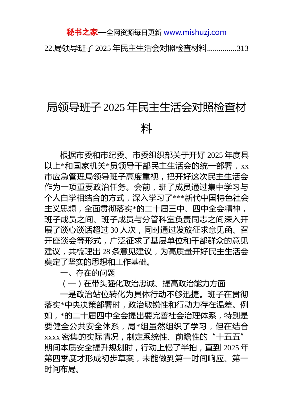 秘书之家—全网资源每日更新 www.mishuzj.com局领导班子 2025 年民主生活会对照检查材料汇编(22 篇)目录1.局领导班子 2025 年民主生活会对照检查材料.......................32.局领导班子 2025 年民主生活会对照检查材料...................143.局领导班子 2025 年民主生活会对照检查材料...................244.局领导班子 2025 年民主生活会对照检查材料...................475.局领导班子 2025 年民主生活会对照检查材料...................716.局领导班子 2025 年民主生活会对照检查材料...................937.局领导班子 2025 年民主生活会对照检查材料.................1188.局领导班子 2025 年民主生活会对照检查材料.................1329.局领导班子 2025 年民主生活会对照检查材料.................14310.局领导班子 2025 年民主生活会对照检查材料...............15411.局领导班子 2025 年民主生活会对照检查材料...............16312.局领导班子 2025 年民主生活会对照检查材料...............17413.局领导班子 2025 年民主生活会对照检查材料...............18514.局领导班子 2025 年民主生活会对照检查材料...............19715.局领导班子 2025 年民主生活会对照检查材料...............21316.局领导班子 2025 年民主生活会对照检查材料...............22517.局领导班子 2025 年民主生活会对照检查材料...............23218.局领导班子 2025 年民主生活会对照检查材料...............24319.局领导班子 2025 年民主生活会对照检查材料...............25720.局领导班子 2025 年民主生活会对照检查材料...............26721.局领导班子 2025 年民主生活会对照检查材料...............289秘书之家—全网资源每日更新 www.mishuzj.com22.局领导班子 2025 年民主生活会对照检查材料...............313局领导班子 2025 年民主生活会对照检查材料根据市委和市纪委、市委组织部关于开好 2025 年度县以上*和国家机关*员领导干部民主生活会的统一部署,xx市应急管理局领导班子高度重视,把开好这次民主生活会作为一项重要政治任务。会前,班子成员通过集中学习与个人自学相结合的方式,深入学习了***新代中国特色社会主义思想,全面贯彻落实*的二十届三中、四中全会精神,班子成员之间、班子成员与分管科室负责同志之间深入开展了谈心谈话超过 30 人次,同时通过发放征求意见函、召开座谈会等形式,广泛征求了基层单位和干部群众的意见建议,共梳理出 28 条意见建议,为高质量开好民主生活会奠定了坚实的思想和工作基础。一、存在的问题(一)在带头强化政治忠诚、提高政治能力方面一是政治站位转化为具体行动不够迅捷。班子在贯彻落实*中央决策部署时,政治敏锐性和行动力存在温差。例如,*的二十届四中全会提出要完善社会治理体系,特别是要健全公共安全体系,局*组虽然组织了学习,但在结合xxxx 密集的实际情况,制定系统性、前瞻性的“十五五”期间本质安全提升规划时,行动上慢了半拍,直到 2025 年第四季度才形成初步草案,未能做到第一时间响应、第一时间布局。秘书之家—全网资源每日更新 www.mishuzj.com二是政治风险的洞察预判不够深刻。在日常工作中,对业务工作背后潜藏的政治风险和社会稳定风险认识不深在 2025 年处置一起因企业粉尘管道维护不当引发的燃爆事故中,班子初期的关注点主要集中在事故的技术原因调查和责任追究上,对于事故可能引发的周边居民恐慌情绪、网络舆情发酵以及对全市同类型企业安全生产信心的冲击等社会性、政治性风险,预判不足、应对预案不周,导致后期舆情应对一度陷入被动。三是政治责任的闭环落实不够严实。在推动重大决策部署落地见效上,存在“上游热、中游温、下游冷”的现象。例如,为推进“智慧应急”建设,市局层面投入近 300万元升级了应急指挥平台,但在推动平台功能向县(市)区、乡镇(街道)延伸应用时,跟踪问效不紧,导致截至2025 年底,全市基层单位平台激活率仅为 65%,数据上传的及时性和准确性不高,市级平台的“千里眼、顺风耳”作用未得到...