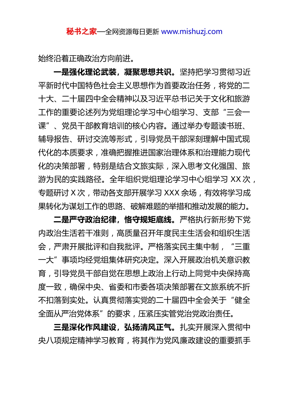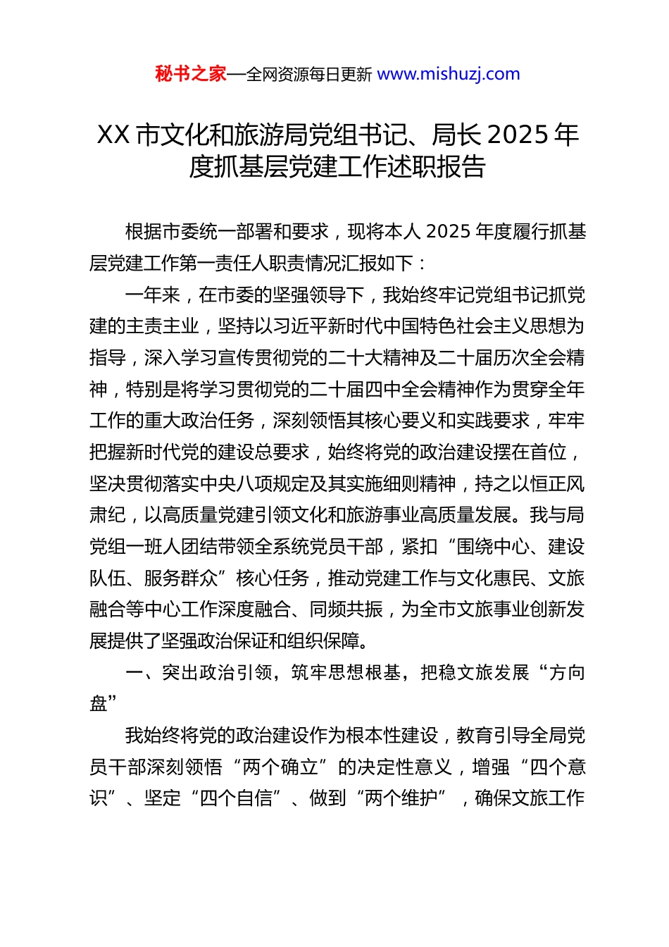 秘书之家—全网资源每日更新 www.mishuzj.comXX 市文化和旅游局党组书记、局长 2025 年度抓基层党建工作述职报告根据市委统一部署和要求,现将本人 2025 年度履行抓基层党建工作第一责任人职责情况汇报如下:一年来,在市委的坚强领导下,我始终牢记党组书记抓党建的主责主业,坚持以习近平新时代中国特色社会主义思想为指导,深入学习宣传贯彻党的二十大精神及二十届历次全会精神,特别是将学习贯彻党的二十届四中全会精神作为贯穿全年工作的重大政治任务,深刻领悟其核心要义和实践要求,牢牢把握新时代党的建设总要求,始终将党的政治建设摆在首位,坚决贯彻落实中央八项规定及其实施细则精神,持之以恒正风肃纪,以高质量党建引领文化和旅游事业高质量发展。我与局党组一班人团结带领全系统党员干部,紧扣“围绕中心、建设队伍、服务群众”核心任务,推动党建工作与文化惠民、文旅融合等中心工作深度融合、同频共振,为全市文旅事业创新发展提供了坚强政治保证和组织保障。一、突出政治引领,筑牢思想根基,把稳文旅发展“方向盘”我始终将党的政治建设作为根本性建设,教育引导全局党员干部深刻领悟“两个确立”的决定性意义,增强“四个意识”、坚定“四个自信”、做到“两个维护”,确保文旅工作秘书之家—全网资源每日更新 www.mishuzj.com始终沿着正确政治方向前进。一是强化理论武装,凝聚思想共识。坚持把学习贯彻习近平新时代中国特色社会主义思想作为首要政治任务,将党的二十大、二十届四中全会精神以及习近平总书记关于文化和旅游工作的重要论述列为党组理论学习中心组学习、支部“三会一课”、党员干部教育培训的核心内容。通过举办专题读书班、辅导报告、研讨交流等形式,引导党员干部深刻理解中国式现代化的本质要求,准确把握推进国家治理体系和治理能力现代化的决策部署,特别是结合文旅实际,深入思考文化强国、旅游为民的实践路径。全年组织党组理论学习中心组学习 XX 次,专题研讨 X 次,带动各支部开展学习 XXX 余场,有效将学习成果转化为谋划工作的思路、破解难题的举措和推动发展的能力。二是严守政治纪律,恪守规矩底线。严格执行新形势下党内政治生活若干准则,高质量召开年度民主生活会和组织生活会,严肃开展批评和自我批评。严格落实民主集中制,“三重一大”事项均经党组集体研究决定。深入开展政治机关意识教育,引导党员干部自觉在思想上政治上行动上同党中央保持高度一致,确保中央、省委和市委各项决策部署在文旅系统不折不扣落到实处。认真贯彻落实党的二十届四中全会关于“健全全面从严治党体系”的要求,压紧压实管党治党政治责任。三是深化作风建设,弘扬清风正气。扎实开展深入贯彻中央八项规定精神学习教育,将其作为党风廉政建设的重要抓手秘书之家—全网资源每日更新 www.mishuzj.com和党员干部的日常行为规范。在党组会、全局大会上反复强调、常抓不懈,组织观看警示教育片、通报典型案例,引导党员干部知敬畏、存戒惧、守底线。紧盯“四风”问题特别是形式主义、官僚主义新表现,大力倡树“严真细实快”工作作风。要求党员干部,特别是领导干部,带头深入基层、深入群众、深入文旅一线开展调研,察实情、听民意、解难题,全年带队开展调研 XX 次,解决实际问题 XX 个,推动工作作风持续向好,营造了风清气正的政治生态和干事创业的良好环境。二、夯实组织基础,建强战斗堡垒,锻造文旅先锋“主力军”牢固树立大抓基层的鲜明导向,以提升组织力为重点,着力把基层党组织建设成为有效实现党的领导的坚强战斗堡垒。一是健全组织体系,压实党建责任。严格落实党建工作责任制,主持召开党组会专题研究党建工作 X 次,制定印发年度党建工作要点和责任清单,形成“党组书记负总责、班子成员分工负责、机关党委牵头抓总、党支部具体落实”的工作格局。定期听取各支部党建工作汇报,开展党支部书记抓党建述职评议考核,推动责任层层传导、落到实处。优化支部设置,选优配强支部班子,确保党的组织和党的工作全覆盖。二是规范组织生活,激发支部活力。严格落实“三会一课”、主题党日、民主评议党员等制度,不断提升组织...