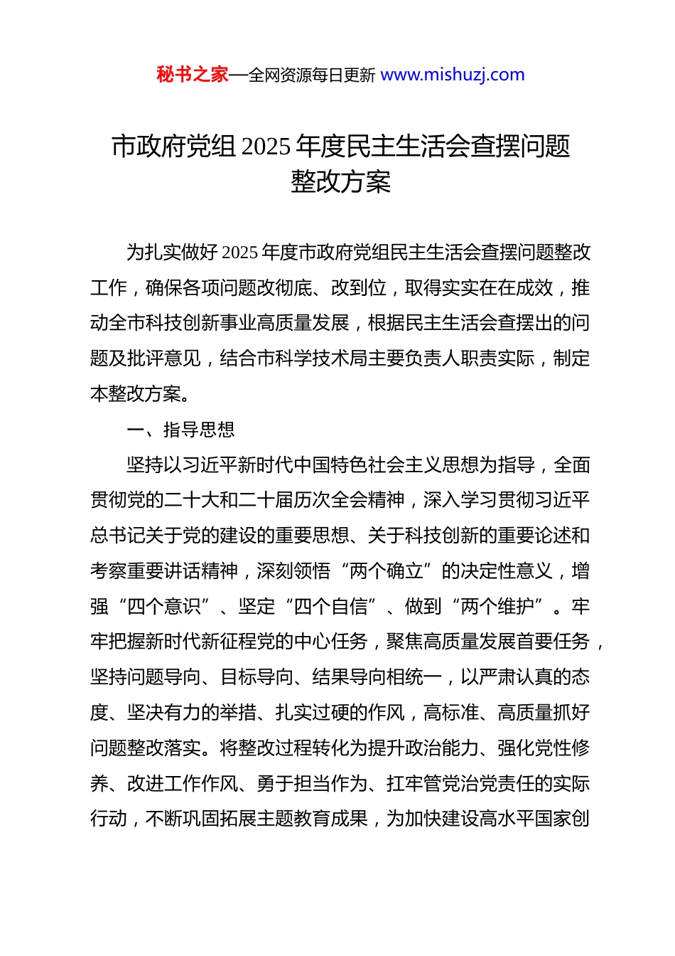 秘书之家—全网资源每日更新 www.mishuzj.com市政府党组 2025 年度民主生活会查摆问题整改方案 为扎实做好 2025 年度市政府党组民主生活会查摆问题整改工作,确保各项问题改彻底、改到位,取得实实在在成效,推动全市科技创新事业高质量发展,根据民主生活会查摆出的问题及批评意见,结合市科学技术局主要负责人职责实际,制定本整改方案。一、指导思想坚持以习近平新时代中国特色社会主义思想为指导,全面贯彻党的二十大和二十届历次全会精神,深入学习贯彻习近平总书记关于党的建设的重要思想、关于科技创新的重要论述和考察重要讲话精神,深刻领悟“两个确立”的决定性意义,增强“四个意识”、坚定“四个自信”、做到“两个维护”。牢牢把握新时代新征程党的中心任务,聚焦高质量发展首要任务,坚持问题导向、目标导向、结果导向相统一,以严肃认真的态度、坚决有力的举措、扎实过硬的作风,高标准、高质量抓好问题整改落实。将整改过程转化为提升政治能力、强化党性修养、改进工作作风、勇于担当作为、扛牢管党治党责任的实际行动,不断巩固拓展主题教育成果,为加快建设高水平国家创秘书之家—全网资源每日更新 www.mishuzj.com新型城市、奋力谱写中国式现代化实践新篇章提供坚强政治保证和强大科技支撑。二、整改目标通过集中整改,实现以下目标:一是政治站位实现新提升。市政府党组成员特别是市科技局主要负责人政治判断力、政治领悟力、政治执行力显著增强,自觉在思想上政治上行动上同以习近平同志为核心的党中央保持高度一致,确保党的路线方针政策和省委、市委决策部署在科技领域不折不扣落地生根。二是理论武装达到新高度。对党的创新理论,特别是关于发展新质生产力、实现高水平科技自立自强等重要论述的理解把握更加系统深入,运用党的科学理论指导科技创新实践、破解发展难题的能力水平切实提升。三是宗旨意识得到新强化。坚持以人民为中心的发展思想更加牢固,服务创新主体、科技人才的意识与能力持续提升,人民群众和科研人员在科技创新领域的获得感、幸福感、安全感更加充实。四是担当作为展现新气象。树立和践行正确政绩观,破解科技体制机制障碍、攻克关键核心技术的锐气和斗志更加昂扬,推动科技创新的思路举措更加精准有效,全市科技创新综合实力稳步提升。五是政治生态呈现新面貌。全面从严治党政治责任压紧压实,领导班子凝聚力战斗力进一步增强,党员干部纪律规矩意识入脑入心,风秘书之家—全网资源每日更新 www.mishuzj.com清气正、干事创业的良好政治生态持续巩固发展。确保在 2025年 12 月底前完成集中整改,并持续推进长期整改任务,形成常态化长效化机制。三、整改措施针对民主生活会查摆出的突出问题,结合市科学技术局主要负责人工作职责,制定以下整改措施:(一)聚焦强化政治忠诚、提升政治能力方面存在的问题1.深化理论武装固根基,淬炼绝对忠诚政治品格。坚持将学习贯彻习近平新时代中国特色社会主义思想作为首要政治任务和终身课题,每月至少组织 1 次市科技局党组理论学习中心组专题学习,每季度至少开展 1 次交流研讨,原原本本、逐字逐句学习党的二十大报告、党章以及习近平总书记关于科技创新的系列重要论述。深刻把握“两个确立”的理论逻辑、历史逻辑、实践逻辑,带头撰写学习心得、调研报告每年不少于 2篇,做到学思用贯通、知信行统一。严格执行“第一议题”制度,第一时间学习领会党中央关于科技创新最新精神,确保科技工作始终沿着正确政治方向前进。坚决同一切违背党的理论和路线方针政策的言行作斗争,教育引导全局党员干部不断提高政治敏锐性和政治鉴别力,始终做政治上的“明白人”“老实人”。秘书之家—全网资源每日更新 www.mishuzj.com2.锤炼政治能力担重任,把牢科技创新政治方向。自觉把科技工作置于党和国家事业发展全局中谋划推进,胸怀“国之大者”,聚焦国家重大战略需求和本市产业发展需要,精准布局创新链。每年牵头组织开展全市科技创新重大战略问题研究不少于 2 项,提高从政治高度观察、分析、处理科技创新复杂问题的能力。严守党的政治纪律和政治规矩,严格执行重大事项请示报告制度,...