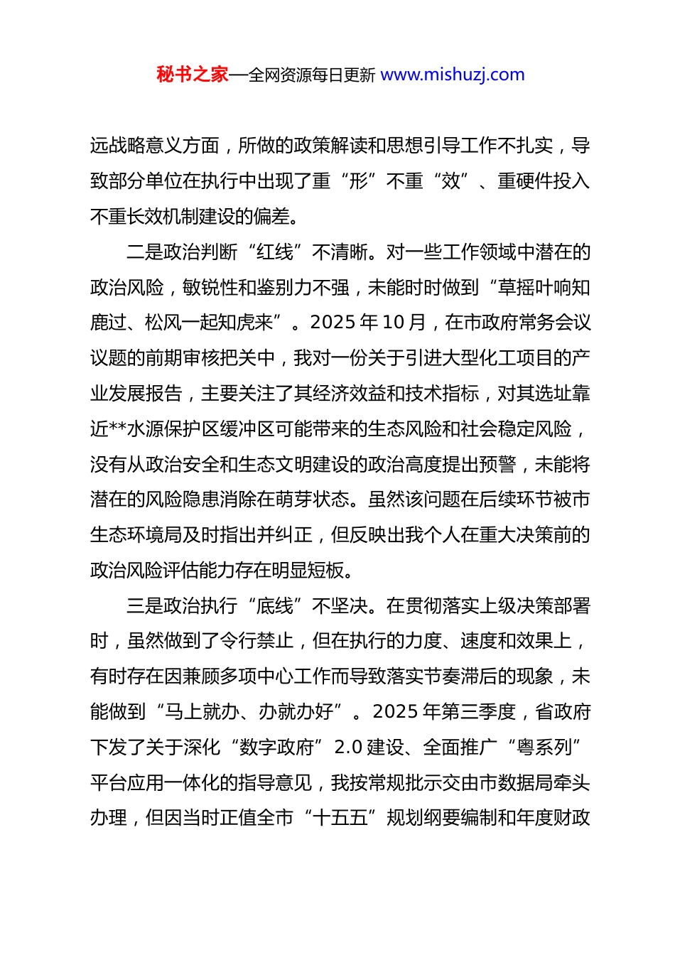 秘书之家—全网资源每日更新 www.mishuzj.com市政府秘书长 2025 年度民主生活会的个人对照检查材料根据市委关于召开 2025 年度民主生活会的统一部署和要求,我紧扣主题,在深入开展学习研讨、广泛征求意见建议、坦诚进行谈心谈话的基础上,围绕“五个带头”方面,把自己摆进去、把职责摆进去、把工作摆进去,深入查摆了自身存在的问题,深刻剖析了问题根源,明确了今后的努力方向和整改措施。现将个人对照检查情况报告如下。一、存在的问题(一)在带头强化政治忠诚、提高政治能力方面一是政治领悟“高线”不稳固。在领会和把握*中央大政方针上,有时未能完全做到从政治高度和战略全局上进行深层次思考。在工作中,将更多精力投入到了如何高效完成具体任务的“术”的层面,而在深刻领悟上级决策部署背后蕴含的政治意图、战略考量等“道”的层面,钻研不够深入。例如,在统筹推进“百千万工程”过程中,我所牵头协调的市政府办公室系统,在 2025 年上半年主要精力集中于督办各项目开工率、投资完成额等量化指标,但在如何引导各部门深刻理解并贯彻工程背后所蕴含的破解城乡二元结构、促进区域协调发展的深秘书之家—全网资源每日更新 www.mishuzj.com远战略意义方面,所做的政策解读和思想引导工作不扎实,导致部分单位在执行中出现了重“形”不重“效”、重硬件投入不重长效机制建设的偏差。二是政治判断“红线”不清晰。对一些工作领域中潜在的政治风险,敏锐性和鉴别力不强,未能时时做到“草摇叶响知鹿过、松风一起知虎来”。2025 年 10 月,在市政府常务会议议题的前期审核把关中,我对一份关于引进大型化工项目的产业发展报告,主要关注了其经济效益和技术指标,对其选址靠近**水源保护区缓冲区可能带来的生态风险和社会稳定风险,没有从政治安全和生态文明建设的政治高度提出预警,未能将潜在的风险隐患消除在萌芽状态。虽然该问题在后续环节被市生态环境局及时指出并纠正,但反映出我个人在重大决策前的政治风险评估能力存在明显短板。三是政治执行“底线”不坚决。在贯彻落实上级决策部署时,虽然做到了令行禁止,但在执行的力度、速度和效果上,有时存在因兼顾多项中心工作而导致落实节奏滞后的现象,未能做到“马上就办、办就办好”。2025 年第三季度,省政府下发了关于深化“数字政府”2.0 建设、全面推广“粤系列”平台应用一体化的指导意见,我按常规批示交由市数据局牵头办理,但因当时正值全市“十五五”规划纲要编制和年度财政秘书之家—全网资源每日更新 www.mishuzj.com预算编制的关键期,我未能持续跟踪督办,导致我市的实施方案直到 12 月底才正式出台,相比珠三角兄弟城市普遍晚了一个季度,错失了部分试点政策的先机。(二)在带头固本培元、增强*性方面一是理论学习“钻进去”不深入。对**************思想的学习,满足于读原著、学原文,但在悟原理、求真经上下的功夫不深,未能完全做到知其然、知其所以然,更知其所以必然。特别是对*的二十届四中全会关于“十五五”规划的系列新思想、新论断,学习理解多停留在政策解读和具体指标层面,对其背后蕴含的世界观和方法论思考不透彻。在 2025 年 11 月的一次市政府工作务虚会上,我围绕“十五五”开局谈工作思路,罗列了多项经济社会发展预期目标,但未能从新发展格局、全过程人民民主、国家治理体系现代化等更高维度,系统阐述这些目标之间的内在逻辑和理论支撑,发言的理论深度和思想站位不高。二是*性锤炼“融进去”不自觉。在日常工作中,习惯于运用行政手段、依靠工作机制来解决问题、推动工作,未能时时事事自觉用*性原则来衡量、审视和规范自己的言行。三是价值追求“立起来”不牢固。世界观、人生观、价值观这个“总开关”拧得不紧,在政绩观上仍有偏差,潜意识里秘书之家—全网资源每日更新 www.mishuzj.com存在重显绩、轻潜绩,重当前、轻长远的倾向。作为政府“大管家”,我高度关注全市各项经济指标的排名变化,对于能够迅速提升城市形象、带来短期效益的大项目、大工程,投入的协调精力和督办力度相对更大。相比之下,对于一些关乎城市长远发展但短期内不易出彩的“里子”...