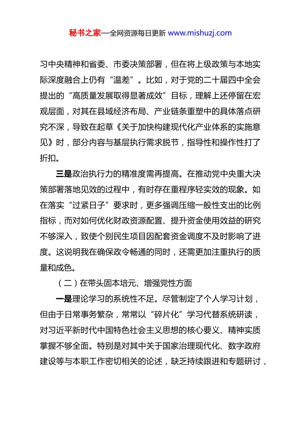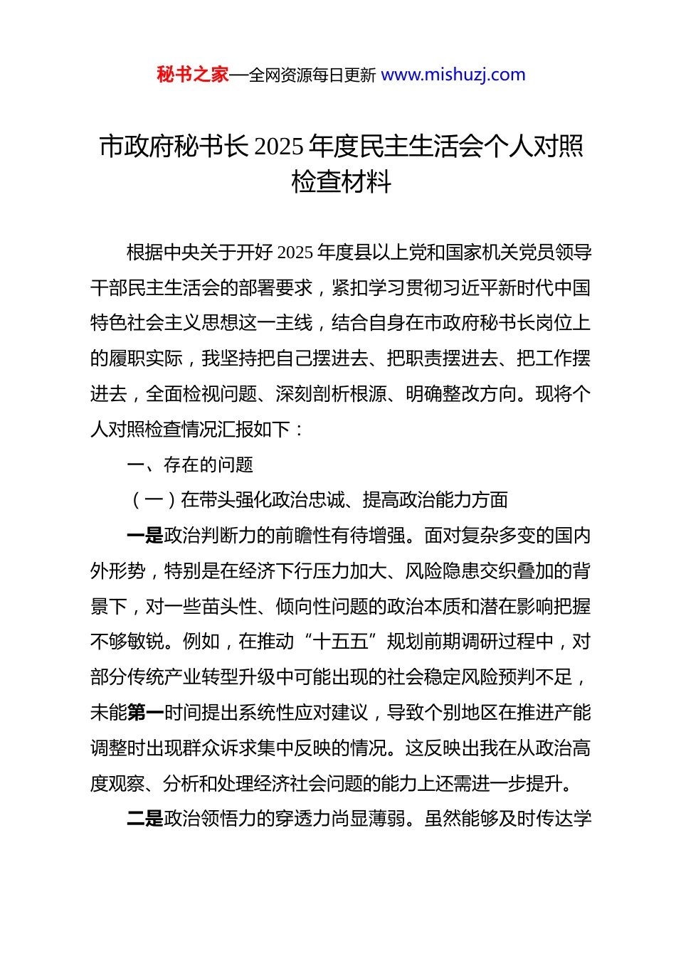 秘书之家—全网资源每日更新 www.mishuzj.com市政府秘书长 2025 年度民主生活会个人对照检查材料 根据中央关于开好 2025 年度县以上党和国家机关党员领导干部民主生活会的部署要求,紧扣学习贯彻习近平新时代中国特色社会主义思想这一主线,结合自身在市政府秘书长岗位上的履职实际,我坚持把自己摆进去、把职责摆进去、把工作摆进去,全面检视问题、深刻剖析根源、明确整改方向。现将个人对照检查情况汇报如下:一、存在的问题(一)在带头强化政治忠诚、提高政治能力方面一是政治判断力的前瞻性有待增强。面对复杂多变的国内外形势,特别是在经济下行压力加大、风险隐患交织叠加的背景下,对一些苗头性、倾向性问题的政治本质和潜在影响把握不够敏锐。例如,在推动“十五五”规划前期调研过程中,对部分传统产业转型升级中可能出现的社会稳定风险预判不足,未能第一时间提出系统性应对建议,导致个别地区在推进产能调整时出现群众诉求集中反映的情况。这反映出我在从政治高度观察、分析和处理经济社会问题的能力上还需进一步提升。二是政治领悟力的穿透力尚显薄弱。虽然能够及时传达学秘书之家—全网资源每日更新 www.mishuzj.com习中央精神和省委、市委决策部署,但在将上级政策与本地实际深度融合上仍有“温差”。比如,对于党的二十届四中全会提出的“高质量发展取得显著成效”目标,理解上还停留在宏观层面,对其在县域经济布局、产业链条重塑中的具体落点研究不深,导致在起草《关于加快构建现代化产业体系的实施意见》时,部分内容与基层执行需求脱节,指导性和操作性打了折扣。三是政治执行力的精准度需再提高。在推动党中央重大决策部署落地见效的过程中,有时存在重程序轻实效的现象。如在落实“过紧日子”要求时,更多强调压缩一般性支出的比例指标,而对如何优化财政资源配置、提升资金使用效益的研究不够深入,致使个别民生项目因配套资金调度不及时影响了进度。这说明我在确保政令畅通的同时,还需更加注重执行的质量和成色。(二)在带头固本培元、增强党性方面一是理论学习的系统性不足。尽管制定了个人学习计划,但由于日常事务繁杂,常常以“碎片化”学习代替系统研读,对习近平新时代中国特色社会主义思想的核心要义、精神实质掌握不够全面。特别是对其中关于国家治理现代化、数字政府建设等与本职工作密切相关的论述,缺乏持续跟进和专题研讨,秘书之家—全网资源每日更新 www.mishuzj.com导致在谋划全市政务服务改革时思路不开阔,创新举措不多。二是党性锤炼的经常性不够。作为党员领导干部,虽然能按时参加组织生活,但在批评和自我批评中,有时存在“老好人”思想,对班子成员中存在的苗头性问题提醒不多、批评不深;对自己也往往满足于完成规定动作,缺乏刀刃向内的勇气。例如,在去年一次党组会议上,面对某部门报送材料反复修改仍不到位的情况,仅作了温和提醒,未从作风纪律角度严肃指出问题根源,弱化了组织生活的政治功能。三是宗旨意识的践行力有待提升。虽然多次带队深入社区、企业开展调研,但“走马观花”式走访仍占一定比例,真正蹲点解剖麻雀少。在协调解决群众反映强烈的老旧小区加装电梯难题时,虽推动出台了指导意见,但对后续施工协调、资金分摊等具体矛盾关注不够,导致部分楼栋推进缓慢,群众仍有怨言。这暴露出我的群众观念还没有完全内化为行动自觉。(三)在带头敬畏人民、敬畏组织、敬畏法纪方面一是对人民的敬畏体现在细节上仍有缺失。在审核文件、签批事项时,有时过于注重效率和程序合规,忽视了政策背后的民生温度。比如,在审定一项涉及低收入群体补贴发放的政策时,过分强调时间节点和流程规范,没有充分考虑部分老年人不会使用智能手机申领的实际困难,导致初期发放率偏低。秘书之家—全网资源每日更新 www.mishuzj.com直到基层反馈后才增设线下代办渠道,暴露出我在政策设计中“以人民为中心”的理念树得还不够牢。二是对组织的敬畏落实到行动中偶有偏差。作为秘书长,承担着承上启下、协调左右的重要职责,但在个别紧急情况下,存在先处置后报告的现象。如去年汛期应对突发城市内涝时,为抢抓抢险时机,临时调动...