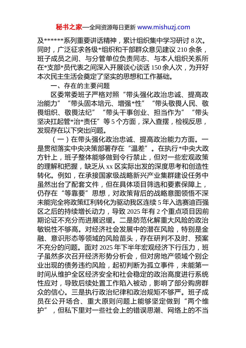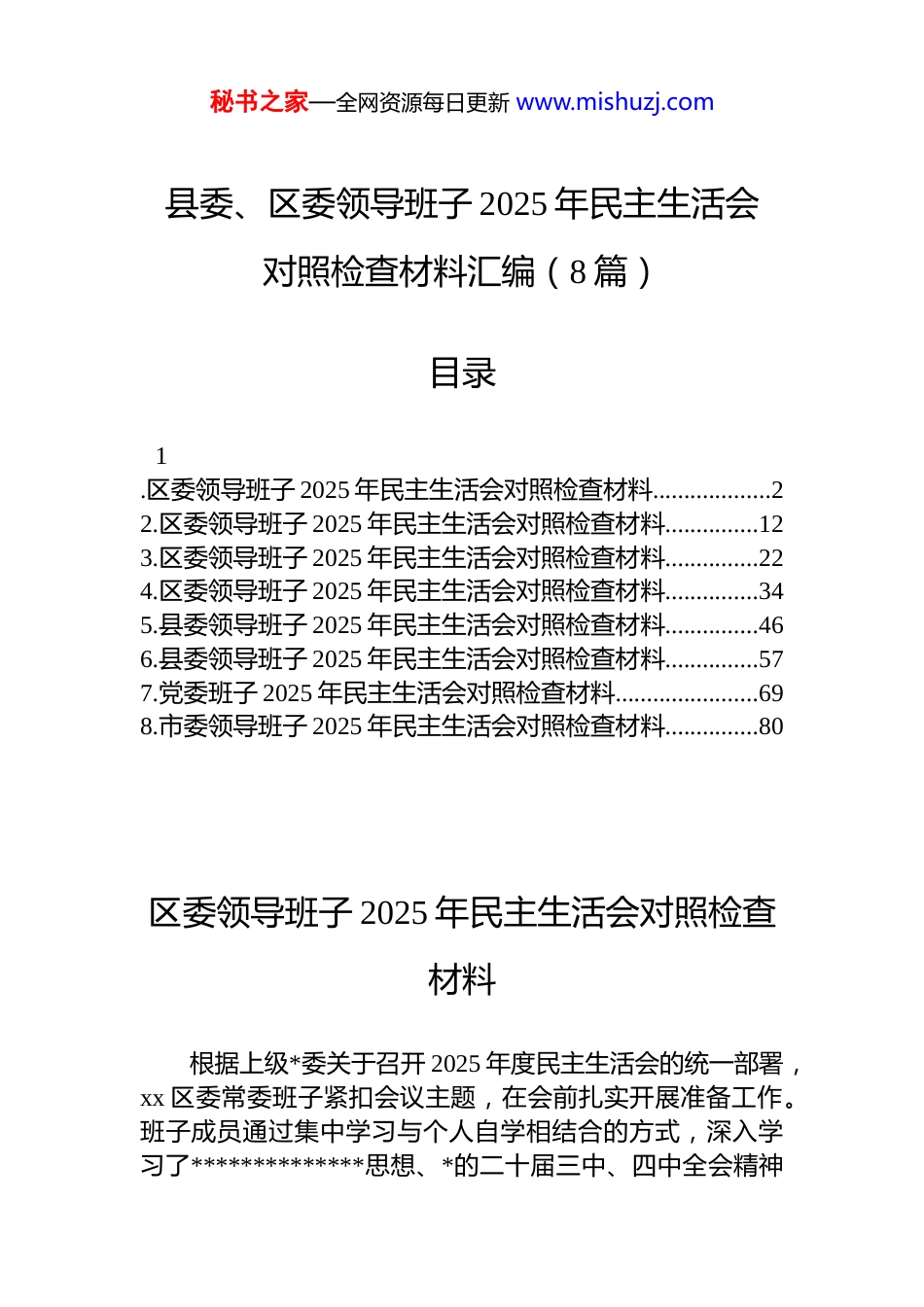 秘书之家—全网资源每日更新 www.mishuzj.com县委、区委领导班子 2025 年民主生活会对照检查材料汇编(8 篇)目录1.区委领导班子 2025 年民主生活会对照检查材料...................22.区委领导班子 2025 年民主生活会对照检查材料...............123.区委领导班子 2025 年民主生活会对照检查材料...............224.区委领导班子 2025 年民主生活会对照检查材料...............345.县委领导班子 2025 年民主生活会对照检查材料...............466.县委领导班子 2025 年民主生活会对照检查材料...............577.党委班子 2025 年民主生活会对照检查材料.......................698.市委领导班子 2025 年民主生活会对照检查材料...............80区委领导班子 2025 年民主生活会对照检查材料根据上级*委关于召开 2025 年度民主生活会的统一部署,xx 区委常委班子紧扣会议主题,在会前扎实开展准备工作。班子成员通过集中学习与个人自学相结合的方式,深入学习了**************思想、*的二十届三中、四中全会精神秘书之家—全网资源每日更新 www.mishuzj.com及******系列重要讲话精神,累计组织集中学习研讨 8 次。同时,广泛征求各级*组织和干部群众意见建议 210 余条,班子成员之间、与分管单位负责同志、与本人组织关系所在*支部*员代表之间深入开展谈心谈话 150 余人次,为开好本次民主生活会奠定了坚实的思想和工作基础。一、存在的主要问题区委常委班子严格对照“带头强化政治忠诚、提高政治能力”“带头固本培元、增强*性”“带头敬畏人民、敬畏组织、敬畏法纪”“带头干事创业、担当作为”“带头坚决扛起管*治*责任”等 5 个方面,深入查摆,检视反思,发现存在以下突出问题。(一)在带头强化政治忠诚、提高政治能力方面。一是贯彻落实中央决策部署存在“温差”。在执行*中央大政方针上,班子整体能够做到令行禁止,但对一些宏观政策的理解和把握,缺乏从 xx 区实际出发的深度思考和创造性转化。例如,在承接国家级战略新兴产业集群建设任务中虽然出台了配套文件,但在具体项目筛选和要素保障上,仍存在“等靠要”思想,对政策背后的战略意图领悟不深未能完全将政策红利转化为驱动我区连续 5 年入选赛迪百强区之后的持续增长动力,导致 2025 年有 2 个重点项目因前期论证不充分而进展迟缓。二是防范化解重大风险的政治敏锐性不够高。对经济社会发展中的潜在风险,特别是金融、意识形态等领域的风险苗头,存在研判不及时、预案不充分的问题。面对 2025 年下半年宏观经济下行压力,班子虽然多次召开经济形势分析会,但对房地产领域个别企业出现的债务违约风险,起初判断为孤立事件,未能第一时间从维护全区经济安全和社会稳定的政治高度进行系统性应对,导致后续处置工作陷入被动,影响了部分购房群众的信心。三是执行政治纪律和政治规矩不够严。班子成员在公开场合、重大原则问题上能够坚定做到“两个维护”,但私下里对一些社会上的错误思潮、网络上的不当秘书之家—全网资源每日更新 www.mishuzj.com言论,有时只停留在“不认同、不传播”的层面,缺乏旗帜鲜明进行批驳和斗争的政治自觉。在一些非原则性问题上,存在“无伤大雅”的模糊认识,对个别干部在工作交流中发表的牢骚怪话,有时止于提醒,未能从严守政治规矩的高度严肃批评、坚决纠正。(二)在带头固本培元、增强*性方面。一是理论学习往深里走、往实里走不扎实。虽然严格执行了“第一议题”制度,但有时存在“为学习而学习”的现象,对**************思想的系统性、整体性把握不够。在 2025 年开展的 24 次常委会“第一议题”学习中,联系 xx 区实际工作进行专题研讨的次数不多,导致理论学习与解决高质量发展难题结合不紧密,未能完全将学习成果转化为破解“十五五”开局之年发展瓶颈的思路和举措。二是*性锻炼的自我革命精神有所弱化。随着 xx 区经济社会发展持续向好,班子成员中滋生了些许安于现状、不愿攻坚的情绪,艰苦奋斗、锐意进取的精神状态有所松懈。在推进老旧小区改造这一硬骨头任务时,面对复杂的产权关系和居民诉求,个别班子成员畏难情...