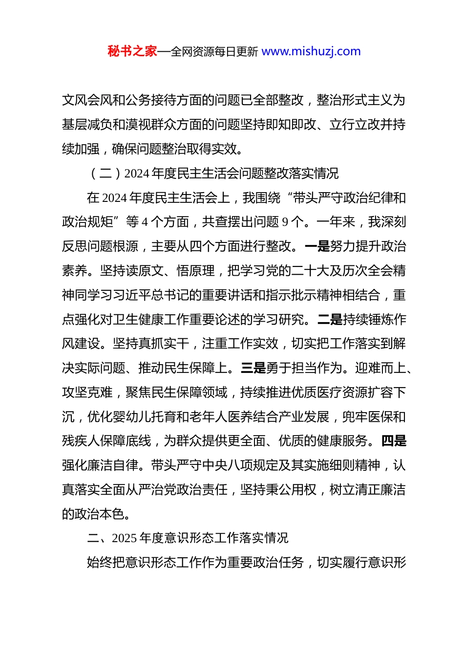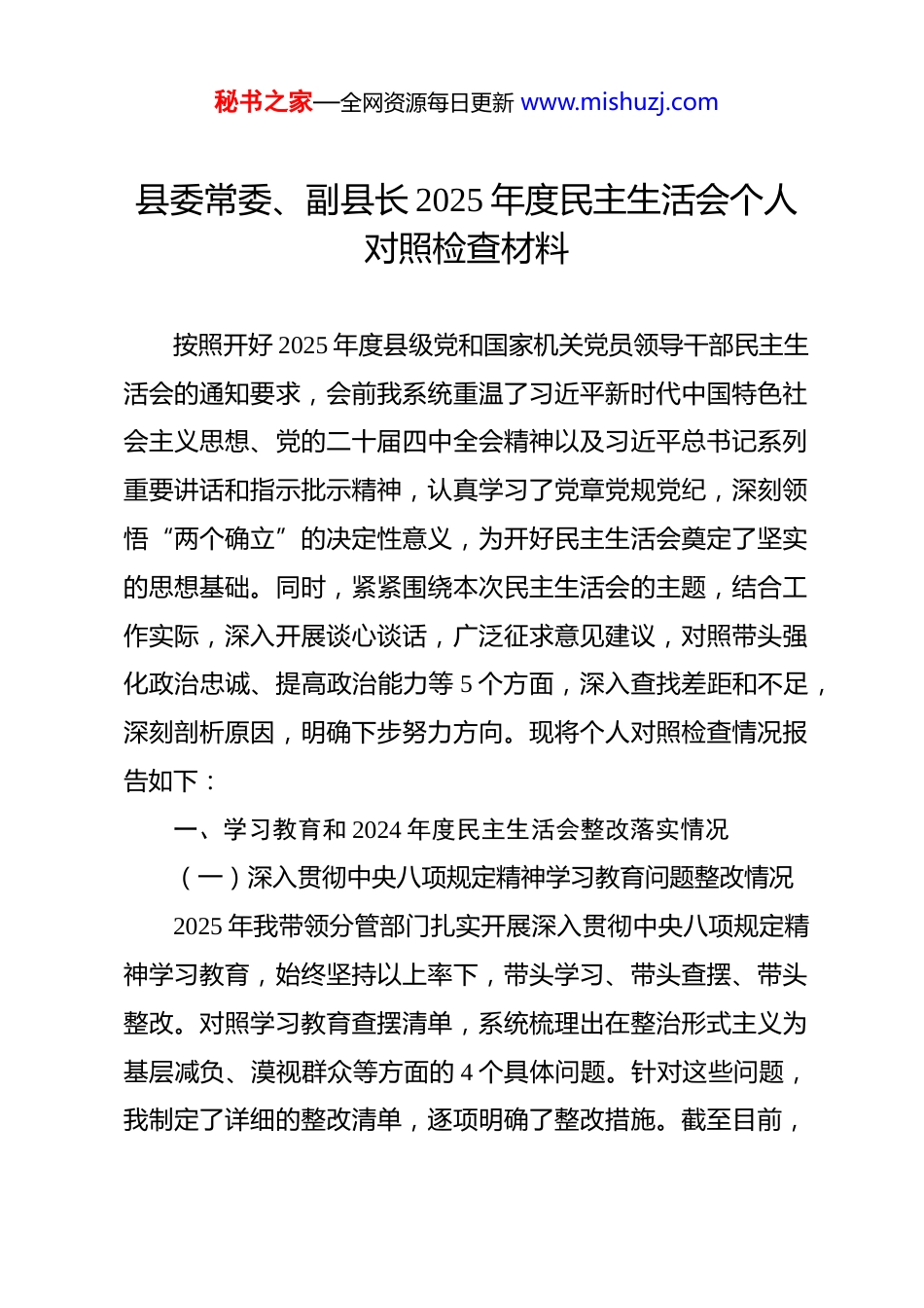 秘书之家—全网资源每日更新 www.mishuzj.com县委常委、副县长 2025 年度民主生活会个人对照检查材料 按照开好 2025 年度县级党和国家机关党员领导干部民主生活会的通知要求,会前我系统重温了习近平新时代中国特色社会主义思想、党的二十届四中全会精神以及习近平总书记系列重要讲话和指示批示精神,认真学习了党章党规党纪,深刻领悟“两个确立”的决定性意义,为开好民主生活会奠定了坚实的思想基础。同时,紧紧围绕本次民主生活会的主题,结合工作实际,深入开展谈心谈话,广泛征求意见建议,对照带头强化政治忠诚、提高政治能力等 5 个方面,深入查找差距和不足,深刻剖析原因,明确下步努力方向。现将个人对照检查情况报告如下:一、学习教育和 2024 年度民主生活会整改落实情况(一)深入贯彻中央八项规定精神学习教育问题整改情况2025 年我带领分管部门扎实开展深入贯彻中央八项规定精神学习教育,始终坚持以上率下,带头学习、带头查摆、带头整改。对照学习教育查摆清单,系统梳理出在整治形式主义为基层减负、漠视群众等方面的 4 个具体问题。针对这些问题,我制定了详细的整改清单,逐项明确了整改措施。截至目前,秘书之家—全网资源每日更新 www.mishuzj.com文风会风和公务接待方面的问题已全部整改,整治形式主义为基层减负和漠视群众方面的问题坚持即知即改、立行立改并持续加强,确保问题整治取得实效。(二)2024 年度民主生活会问题整改落实情况在 2024 年度民主生活会上,我围绕“带头严守政治纪律和政治规矩”等 4 个方面,共查摆出问题 9 个。一年来,我深刻反思问题根源,主要从四个方面进行整改。一是努力提升政治素养。坚持读原文、悟原理,把学习党的二十大及历次全会精神同学习习近平总书记的重要讲话和指示批示精神相结合,重点强化对卫生健康工作重要论述的学习研究。二是持续锤炼作风建设。坚持真抓实干,注重工作实效,切实把工作落实到解决实际问题、推动民生保障上。三是勇于担当作为。迎难而上、攻坚克难,聚焦民生保障领域,持续推进优质医疗资源扩容下沉,优化婴幼儿托育和老年人医养结合产业发展,兜牢医保和残疾人保障底线,为群众提供更全面、优质的健康服务。四是强化廉洁自律。带头严守中央八项规定及其实施细则精神,认真落实全面从严治党政治责任,坚持秉公用权,树立清正廉洁的政治本色。二、2025 年度意识形态工作落实情况始终把意识形态工作作为重要政治任务,切实履行意识形秘书之家—全网资源每日更新 www.mishuzj.com态工作“一岗双责”。牢牢掌握意识形态工作领导权,将意识形态工作纳入分管部门重要议事日程。加强对医疗机构、政务服务窗口等重点场所意识形态阵地管理,规范宣传标语、宣传栏等内容,确保阵地导向正确。密切关注医疗卫生领域舆情动态,及时回应社会关切,妥善处置敏感舆情。在分管部门深入开展理想信念教育和职业道德建设,弘扬伟大抗疫精神和崇高职业精神,凝聚奋进力量。分管领域意识形态阵地可管可控,未出现重大意识形态问题。三、存在的主要问题及具体表现(一)带头强化政治忠诚、提高政治能力方面1.政治领悟力仍需进一步深化。对中央和上级的重要会议、文件精神能够及时学习传达,但在领会其精神实质、核心要义和实践要求时,有时存在“上下一般粗”的倾向,结合县域实际进行消化吸收、细化转化不够。比如,在学习习近平总书记关于健康中国建设的重要论述时,只是简单地了解了相关内容,没有深入思考如何将这些论述与本地的卫生健康工作实际紧密结合,如何通过创新工作方法来更好地推动健康中国战略在基层的落地生根。导致在实际工作中,对一些政策的理解和执行不够精准,无法充分发挥政策的最大效能。2.政治执行力仍需进一步强化。对中央和上级明确要求的秘书之家—全网资源每日更新 www.mishuzj.com重大任务、原则性规定,能够坚决执行。但在推动一些跨领域、多部门协同攻坚的重大改革任务时,有时存在畏难情绪或求稳心态,在推进力度和节奏上略显审慎。比如,在推进县域医疗资源共享改革过程中,由于涉及到不同层级医疗机构利益重塑等难点,有时过多考虑了“平衡”与“稳定”...