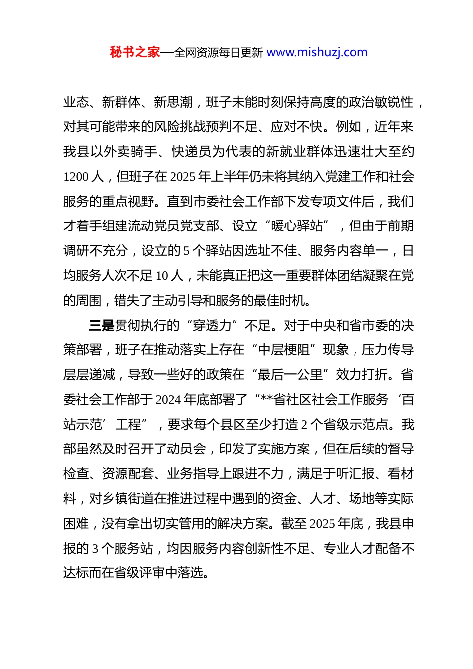 秘书之家—全网资源每日更新 www.mishuzj.com县委社会工作部领导班子 2025 年度民主生活会对照检查材料 根据市委和县委关于召开 2025 年度民主生活会的统一部署,**县委社会工作部领导班子紧扣会议主题,在扎实开展学习研讨、深入进行谈心谈话、广泛征求意见建议的基础上,全面梳理检视问题,深刻剖析思想根源,明确了整改方向和措施。会前,班子成员之间、班子成员与分管领域负责同志、与本人组织关系所在党支部党员代表之间开展谈心谈话 30 余人次,通过座谈访谈、书面征询等方式,征求到各类意见建议 52 条。现将班子对照检查情况报告如下。一、存在的问题(一)在带头强化政治忠忠诚、提高政治能力方面一是理论武装的“转化率”不高。班子在组织学习习近平新时代中国特色社会主义思想和党的二十届三中、四中全会精神时,多数时候停留在通读文件、听取报告的层面,但在如何将党的创新理论与我县社会工作实际,特别是与基层治理、社会组织培育、志愿服务发展等具体业务深度融合上,思考不深、研讨不够、办法不多。二是政治判断的“敏锐性”不强。对于社会领域出现的新秘书之家—全网资源每日更新 www.mishuzj.com业态、新群体、新思潮,班子未能时刻保持高度的政治敏锐性,对其可能带来的风险挑战预判不足、应对不快。例如,近年来我县以外卖骑手、快递员为代表的新就业群体迅速壮大至约1200 人,但班子在 2025 年上半年仍未将其纳入党建工作和社会服务的重点视野。直到市委社会工作部下发专项文件后,我们才着手组建流动党员党支部、设立“暖心驿站”,但由于前期调研不充分,设立的 5 个驿站因选址不佳、服务内容单一,日均服务人次不足 10 人,未能真正把这一重要群体团结凝聚在党的周围,错失了主动引导和服务的最佳时机。三是贯彻执行的“穿透力”不足。对于中央和省市委的决策部署,班子在推动落实上存在“中层梗阻”现象,压力传导层层递减,导致一些好的政策在“最后一公里”效力打折。省委社会工作部于 2024 年底部署了“**省社区社会工作服务‘百站示范’工程”,要求每个县区至少打造 2 个省级示范点。我部虽然及时召开了动员会,印发了实施方案,但在后续的督导检查、资源配套、业务指导上跟进不力,满足于听汇报、看材料,对乡镇街道在推进过程中遇到的资金、人才、场地等实际困难,没有拿出切实管用的解决方案。截至 2025 年底,我县申报的 3 个服务站,均因服务内容创新性不足、专业人才配备不达标而在省级评审中落选。秘书之家—全网资源每日更新 www.mishuzj.com(二)在带头固本培元、增强党性方面一是理想信念的“总开关”拧得不紧。面对新时代社会工作繁重复杂的任务,班子成员中不同程度地滋生了“求稳怕乱”的心态,艰苦奋斗、攻坚克难的革命锐气有所消减。在谋划 2025 年全县社会工作要点时,对于一些需要大胆创新、可能存在风险的改革项目,如探索通过政府购买服务方式,引入专业社会组织承接农村留守儿童关爱保护项目,班子内部讨论时,有同志便以“财政紧张、监管难度大、容易出问题”为由提议暂缓,最终该项工作被替换为传统的送温暖、送慰问活动,满足于“干了”而不是追求“干好”,共产党人应有的精神追求和奋斗姿态有所弱化。二是党性修养的“日常功”做得不实。在严格执行党的组织生活制度上,存在重形式、轻内容的倾向。虽然“三会一课”、组织生活会、主题党日等活动均按时开展,但有时满足于完成“规定动作”,在提升活动质量、增强党性锻炼的“实效”上用心不足。2025 年 7 月,在一次以学习党章为主题的支部党员大会上,个别班子成员的发言材料还是由办公室代笔的通用稿,内容空洞,脱离自身思想和工作实际,没有真正把自己摆进去,把批评和自我批评的武器用好用足,使得本应“红脸出汗”的组织生活会,开成了“汇报工作会”。秘书之家—全网资源每日更新 www.mishuzj.com三是纪律规矩的“敬畏心”树得不牢。对党章党规党纪的学习不够深入系统,未能完全内化为行为准则。在日常工作中,对于一些看似“微小”的违规违纪苗头性问题,有时碍于情面,没有及时“咬耳扯袖”,存在“好人主义”思想。例如,在20...