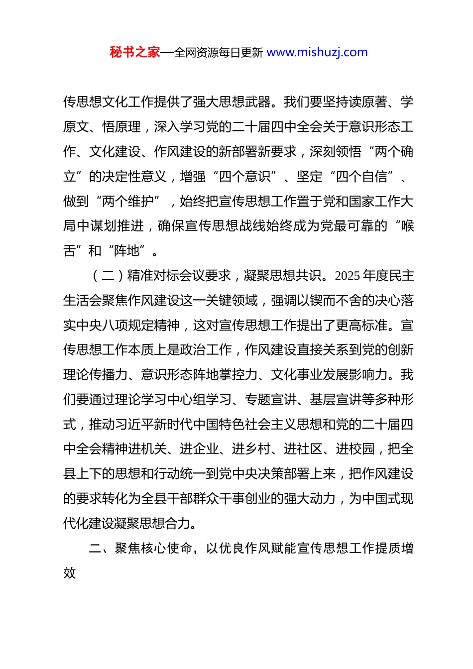 秘书之家—全网资源每日更新 www.mishuzj.com县委宣传部部长在 2025 年度民主生活会会前理论中心组学习会上的交流研讨材料 根据中央、省委、市委关于开好 2025 年度民主生活会的统一部署,本次理论学习中心组学习紧扣会议主题,结合宣传思想文化工作职责使命,深入开展理论研读、专题思考和实践对标,对新时代宣传思想工作的政治要求、作风导向、实践路径有了更为深刻的认识。下面,我结合学习体会和工作实际,作交流研讨发言,与同志们共勉。一、深化理论武装,筑牢宣传思想工作的政治根基习近平新时代中国特色社会主义思想是引领新时代各项事业发展的根本遵循,党的二十届四中全会为推进全面从严治党、深化作风建设、开创中国式现代化建设新局面作出了战略部署,二者共同构成了我们开展宣传思想工作的行动指南。作为宣传思想战线的党员领导干部,必须把强化理论武装作为首要政治任务,始终在思想上政治上行动上同以习近平同志为核心的党中央保持高度一致。(一)深刻把握思想精髓,筑牢政治忠诚。习近平新时代中国特色社会主义思想蕴含着丰富的世界观、方法论和贯穿其中的立场观点方法,尤其是习近平文化思想,为做好新时代宣秘书之家—全网资源每日更新 www.mishuzj.com传思想文化工作提供了强大思想武器。我们要坚持读原著、学原文、悟原理,深入学习党的二十届四中全会关于意识形态工作、文化建设、作风建设的新部署新要求,深刻领悟“两个确立”的决定性意义,增强“四个意识”、坚定“四个自信”、做到“两个维护”,始终把宣传思想工作置于党和国家工作大局中谋划推进,确保宣传思想战线始终成为党最可靠的“喉舌”和“阵地”。(二)精准对标会议要求,凝聚思想共识。2025 年度民主生活会聚焦作风建设这一关键领域,强调以锲而不舍的决心落实中央八项规定精神,这对宣传思想工作提出了更高标准。宣传思想工作本质上是政治工作,作风建设直接关系到党的创新理论传播力、意识形态阵地掌控力、文化事业发展影响力。我们要通过理论学习中心组学习、专题宣讲、基层宣讲等多种形式,推动习近平新时代中国特色社会主义思想和党的二十届四中全会精神进机关、进企业、进乡村、进社区、进校园,把全县上下的思想和行动统一到党中央决策部署上来,把作风建设的要求转化为全县干部群众干事创业的强大动力,为中国式现代化建设凝聚思想合力。二、聚焦核心使命,以优良作风赋能宣传思想工作提质增效秘书之家—全网资源每日更新 www.mishuzj.com党的二十届四中全会明确要求推进作风建设常态化长效化这既是全面从严治党的重要举措,也是宣传思想工作高质量发展的必然保障。作为县委宣传部部长,必须带头践行优良作风,立足宣传思想文化工作职能,以真抓实干的劲头推动各项工作落地见效,为全县发展营造浓厚舆论氛围、提供坚强思想保证。(一)以务实作风强化理论宣传阐释,让党的创新理论深入人心。理论宣传既要上接天线,准确把握核心要义,又要下接地气,贴合群众思想实际。我们要坚决摒弃形式主义、官僚主义,打破传统宣讲模式,创新打造“理论+文艺”“理论+实践”的宣讲品牌,组织理论骨干、文艺工作者、基层干部组成宣讲队伍,用群众听得懂的语言、喜闻乐见的形式,把党的创新理论、党的二十届四中全会精神与全县发展实践、群众生产生活结合起来,让理论宣传从“会场”走向“现场”,从“灌输式”变为“互动式”,切实解决理论宣传“最后一公里”问题,让党的创新理论真正飞入寻常百姓家。(二)以严实作风守牢意识形态阵地,筑牢安全防线。意识形态工作是党的一项极端重要的工作,作风不实就会出现阵地失守、风险叠加的问题。我们要以打好攻坚战、持久战的决心,健全意识形态阵地管理制度,加强对新闻媒体、网络平台、文化场馆、校园课堂等各类阵地的监管,定期开展意识形态风秘书之家—全网资源每日更新 www.mishuzj.com险排查整治,做到守土有责、守土负责、守土尽责。面对新形势下的舆情挑战,要锤炼快速响应、精准处置的工作作风,健全舆情监测、分析、处置联动机制,主动回应社会关切,有效引导社会舆论,坚决抵制错误思潮和不良言论,牢牢掌握意识形态工作领导权、...