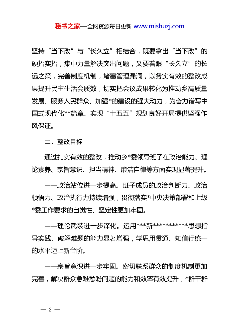 秘书之家—全网资源每日更新 www.mishuzj.com乡 2025 年度民主生活会整改落实方案根据县纪委机关、县委组织部的统一部署和要求,乡*委于2026 年 1 月召开了 2025 年度民主生活会。会议紧扣主题,深入开展批评和自我批评,全面查摆了领导班子及成员存在的突出问题,深刻剖析了问题根源,明确了努力方向和整改措施。为确保查摆出的问题得到切实有效解决,高质量抓好整改落实工作,特制定本方案。一、总体要求坚持以**************思想为指导,全面贯彻*的二十大和二十届三中、四中全会精神,深刻领悟“两个确立”的决定性意义,增强“四个意识”、坚定“四个自信”、做到“两个维护”。紧紧围绕本次民主生活会查摆出的问题,特别是聚焦作风建设方面的顽瘴痼疾,坚持问题导向、目标导向和结果导向相统一,以刀刃向内的自我革命精神,对问题清单进行再梳理、再深化。乡*委班子及成员要主动认领问题、带头落实整改,以高度的政治自觉、思想自觉和行动自觉,逐条逐项制定整改措施,明确整改时限和责任分工,确保所有问题改彻底、改到位。— 1 —秘书之家—全网资源每日更新 www.mishuzj.com坚持“当下改”与“长久立”相结合,既要拿出“当下改”的硬招实招,集中力量解决突出问题,又要着眼“长久立”的长远之策,完善制度机制,堵塞管理漏洞,以务实有效的整改成果提升民主生活会质效,切实把会议成果转化为推动乡高质量发展、服务人民群众、加强*的建设的强大动力,为奋力谱写中国式现代化**篇章、实现“十五五”规划良好开局提供坚强作风保证。二、整改目标通过扎实有效的整改,推动乡*委领导班子在政治能力、理论素养、宗旨意识、担当精神、廉洁自律等方面实现显著提升。——政治站位进一步提高。班子成员的政治判断力、政治领悟力、政治执行力持续增强,贯彻落实*中央决策部署和上级*委工作要求的自觉性、坚定性更加牢固。——理论武装进一步深化。运用***新***********思想指导实践、破解难题的能力显著增强,学思用贯通、知信行统一的水平迈上新台阶。——宗旨意识进一步牢固。密切联系群众的制度机制更加完善,解决群众急难愁盼问题的能力和效率有效提升,*群干群— 2 —秘书之家—全网资源每日更新 www.mishuzj.com关系更加融洽。——担当作为精神进一步激发。干事创业的精气神更加饱满,攻坚克难的斗争精神更加顽强,推动高质量发展的思路更宽、举措更实,发展成效更加彰显。——作风建设进一步夯实。形式主义、官僚主义等突出问题得到有力整治,中央八项规定及其实施细则精神在全乡落地生根,风清气正的政治生态持续巩固。——管*治*责任进一步压实。全面从严治*体系更加健全,班子成员履行“一岗双责”的政治自觉和行动自觉全面增强,为全乡各项事业发展提供坚强纪律保障。三、存在问题、整改措施、责任分工及整改时限(一)在带头强化政治忠诚、提高政治能力方面存在问题:一是政治理论学习与地方发展实践结合不够紧密。班子在组织理论学习时,对中央、省、市关于高质量发展的宏观政策解读较多,但在如何将其精准转化为符合**乡实际、具有可操作性的发展战略和具体项目方面,思考谋划的深度和广度尚显不足。例如,在学习领会中央关于发展新质生产力的论述时,如何结合我乡的农业基础和生态资源,培育具有地方— 3 —秘书之家—全网资源每日更新 www.mishuzj.com特色的新产业新业态,缺乏系统性的研究和前瞻性的布局。二是政治执行的穿透力有待加强。在执行上级决策部署时,有时存在“中转站”现象,满足于开会传达、发文部署,但在后续的跟踪问效、督促检查环节抓得不够紧、不够实,导致一些好的政策在“最后一公里”落实效果打了折扣。比如,在推进巩固拓展脱贫攻坚成果同乡村振兴有效衔接工作中,对部分产业项目的长期效益和风险评估跟踪不及时,存在一定的路径依赖,创新突破力度不足。三是政治风险防范意识仍需强化。对意识形态领域的复杂性认识不足,对网络舆情、社会思潮等潜在风险的分析研判和应对处置能力有待提升。在面对一些涉及群众切身利益的敏感问题时,未能做到第一时间发声引导、有效化解,存在一定的被动应对情况。整改措施:1.深化理论...