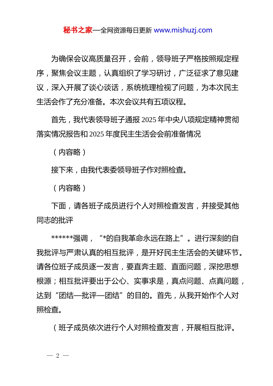 秘书之家—全网资源每日更新 www.mishuzj.com在市委政法委领导班子 2025 年度民主生活会上的主持词同志们:现在开会。根据中央、省委和市委的统一部署,今天我们召开市委政法委领导班子 2025 年度民主生活会。本次会议的主题是:深入学习贯彻**************思想,全面贯彻落实*的二十届四中全会精神,以打攻坚战、持久战的决心和恒心,锲而不舍落实中央八项规定精神,推进作风建设常态化长效化,以优良作风凝心聚力、真抓实干,奋力开创中国式现代化建设新局面。认真开好此次民主生活会,是深化*内政治生活实践、纵深推进自我革命的重要举措,对于巩固拓展 dj 学习教育成果,落实推进*的自我革命“五个进一步到位”要求,筑牢全市政法队伍政治忠诚,为“十五五”时期政法工作高质量发展奠定坚实的思想与组织基础,具有至关重要的作用。市委对本次民主生活会高度重视,专门派出督导组莅临指导,让我们以热烈的掌声,对督导组**组长及各位同志的到来表示诚挚欢迎和衷心感谢!— 1 —秘书之家—全网资源每日更新 www.mishuzj.com为确保会议高质量召开,会前,领导班子严格按照规定程序,聚焦会议主题,认真组织了学习研讨,广泛征求了意见建议,深入开展了谈心谈话,系统梳理检视了问题,为本次民主生活会作了充分准备。本次会议共有五项议程。首先,我代表领导班子通报 2025 年中央八项规定精神贯彻落实情况报告和 2025 年度民主生活会会前准备情况(内容略)接下来,由我代表委领导班子作对照检查。(内容略)下面,请各班子成员进行个人对照检查发言,并接受其他同志的批评******强调,“*的自我革命永远在路上”。进行深刻的自我批评与严肃认真的相互批评,是开好民主生活会的关键环节。请各位班子成员逐一发言,要直奔主题、直面问题,深挖思想根源;相互批评要出于公心、实事求是,真点问题、点真问题,达到“团结—批评—团结”的目的。首先,从我开始作个人对照检查。(班子成员依次进行个人对照检查发言,开展相互批评。— 2 —秘书之家—全网资源每日更新 www.mishuzj.com内容略)刚才,班子成员逐一作了对照检查,开展了积极健康的相互批评。下面,让我们以热烈的掌声,欢迎市委督导组**组长作点评讲话。(内容略)刚才,督导组**组长作了重要讲话,给予了精准有力的指导,指出了我们存在的差距和不足,提出了明确具体的整改要求。这充分体现了市委对政法委领导班子建设的关心与期望。我们诚恳接受、照单全收,并将以最坚决的态度、最扎实的举措抓好贯彻落实。下面,我代表市委政法委领导班子,郑重表态:一、聚焦“两个维护”,在深化理论武装、提升政治能力上持续用力。我们将始终坚持把*的政治建设摆在首位,把学习贯彻**************思想作为终身课题,特别是深学细悟***法治思想和******关于政法工作、*的自我革命的重要论述,深刻领会*的二十届四中全会关于全面推进依法治国的战略部署,以及近期中央、省委关于深化政法领域改革、维护政治安全与社会稳定的最新政策精神。我们将着力提升班子成员的政治判断— 3 —秘书之家—全网资源每日更新 www.mishuzj.com力、政治领悟力、政治执行力,确保在任何时候、任何情况下都同以***同志为核心的*中央保持高度一致。我们将自觉将*的领导贯穿于政法工作全过程、各方面,坚决将中央、省委、市委的各项决策部署不折不扣落到实处,切实把学习成果转化为谋划推进新时代新征程政法工作现代化的思路举措和实际成效,确保政法工作始终沿着正确政治方向前进。二、聚焦问题短板,在动真碰硬、狠抓整改落实上精准发力。针对此次民主生活会查摆出的问题、相互批评提出的意见以及督导组反馈的要求,我们将迅速制定详实明确的整改方案,建立问题清单、责任清单、任务清单,实施台账管理、动态销号。领导班子将主动担起整改主体责任,我作为第一责任人将牵头抓总,每位班子成员都要严格履行“一岗双责”,主动认领、对号入座。整改过程要坚持“当下改”与“长久立”相结合,对能够立即解决的,立行立改、快改实改;对需要持续推进的,明确阶段性目标,一抓到底、务求实效。我们将以钉钉子精神,推动问题整改清仓见底,...