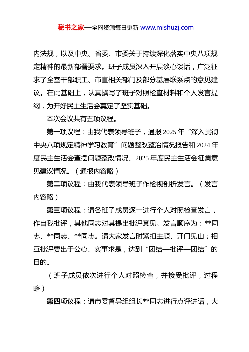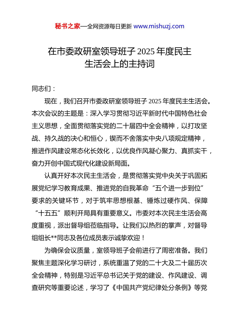 秘书之家—全网资源每日更新 www.mishuzj.com在市委政研室领导班子 2025 年度民主生活会上的主持词 同志们:现在,我们召开市委政研室领导班子 2025 年度民主生活会。本次会议的主题是:深入学习贯彻习近平新时代中国特色社会主义思想,全面贯彻落实党的二十届四中全会精神,以打攻坚战、持久战的决心和恒心,锲而不舍落实中央八项规定精神,推进作风建设常态化长效化,以优良作风凝心聚力、真抓实干,奋力开创中国式现代化建设新局面。认真开好本次民主生活会,是贯彻落实党中央关于巩固拓展党纪学习教育成果、推进党的自我革命“五个进一步到位”要求的关键环节,对于筑牢思想根基、锤炼过硬作风、保障“十五五”顺利开局具有重要意义。市委对本次民主生活会高度重视,派出督导组莅临指导。让我们以热烈的掌声,对督导组组长**同志及各位成员表示诚挚欢迎!为确保会议质量,室领导班子会前进行了周密准备。我们聚焦主题深化学习研讨,系统重温了党的二十大及二十届历次全会精神,特别是习近平总书记关于党的建设、作风建设、调查研究等重要论述,学习了《中国共产党纪律处分条例》等党秘书之家—全网资源每日更新 www.mishuzj.com内法规,以及中央、省委、市委关于持续深化落实中央八项规定精神的最新部署要求。班子成员深入开展谈心谈话,广泛征求了全室干部职工、市直相关部门及部分基层联系点的意见建议。在此基础上,认真撰写了班子对照检查材料和个人发言提纲,为开好民主生活会奠定了坚实基础。本次会议共有五项议程。第一项议程:由我代表领导班子,通报 2025 年“深入贯彻中央八项规定精神学习教育”问题整改整治情况报告和 2024 年度民主生活会查摆问题整改情况、2025 年度民主生活会征集意见建议情况。(通报内容略)第二项议程:由我代表领导班子作检视剖析发言。(发言内容略)第三项议程:请各班子成员逐一进行个人对照检查发言,作自我批评,其他同志对其提出批评意见。发言顺序为:**同志、**同志、**同志。请大家发言时紧扣主题、开门见山;相互批评要出于公心、实事求是,达到“团结—批评—团结”的目的。(班子成员依次进行个人对照检查,并接受批评,过程略)第四项议程:请市委督导组组长**同志进行点评讲话,大秘书之家—全网资源每日更新 www.mishuzj.com家欢迎!(督导组组长**同志点评讲话略)刚才,督导组**组长作了精准深刻的点评讲话,既肯定了我们的前期工作和会议成效,也中肯地指出了存在的问题和不足,并对下一步整改落实工作提出了明确要求。这充分体现了市委对政研室工作的关心与期望,为我们深化自我革命、加强班子建设指明了方向。对于督导组提出的意见,我们完全认同、诚恳接受、照单全收,并将作为后续整改的重要遵循。会上,班子成员本着对党忠诚、对事业负责、对同志关心的态度,开展了积极健康的思想斗争,自我剖析见人见事见思想,相互批评真点问题、点真问题,经历了一次深刻的党性锻炼和思想洗礼。下面,我代表室领导班子,就抓好整改落实、巩固会议成果,作如下表态:一、聚焦“政治机关”首要属性,在凝心铸魂、对标对表上立起更高标准。政研室是市委的综合研究参谋机构,政治性是第一属性,讲政治是第一要求。我们将始终坚持把党的政治建设摆在首位,以党的二十届四中全会提出的“健全完善党中央重大决策部署落实机制”为指引,持续深化对习近平新时代中国特色社会主义思想,特别是习近平总书记关于中国式现代化、新质生产力等重要论述的学习领悟。我们要深刻认识到,秘书之家—全网资源每日更新 www.mishuzj.com理论上的成熟是政治上坚定的基础。班子成员将带头深学细悟,不断提高政治判断力、政治领悟力、政治执行力,自觉将政研工作置于全市发展大局中谋划推进,确保中央大政方针和省委、市委决策部署在政研领域不折不扣落地生根,使政策研究始终沿着正确政治方向前行。二、聚焦“改革智囊”核心职能,在攻坚克难、服务决策上展现更强担当。民主生活会的成效,最终要体现到推动工作、服务发展的实际行动上。我们将以此次会议为新的起点,紧扣“十五五”规划谋划和年度改革攻坚任务,将整改落实与履职尽责紧密结...